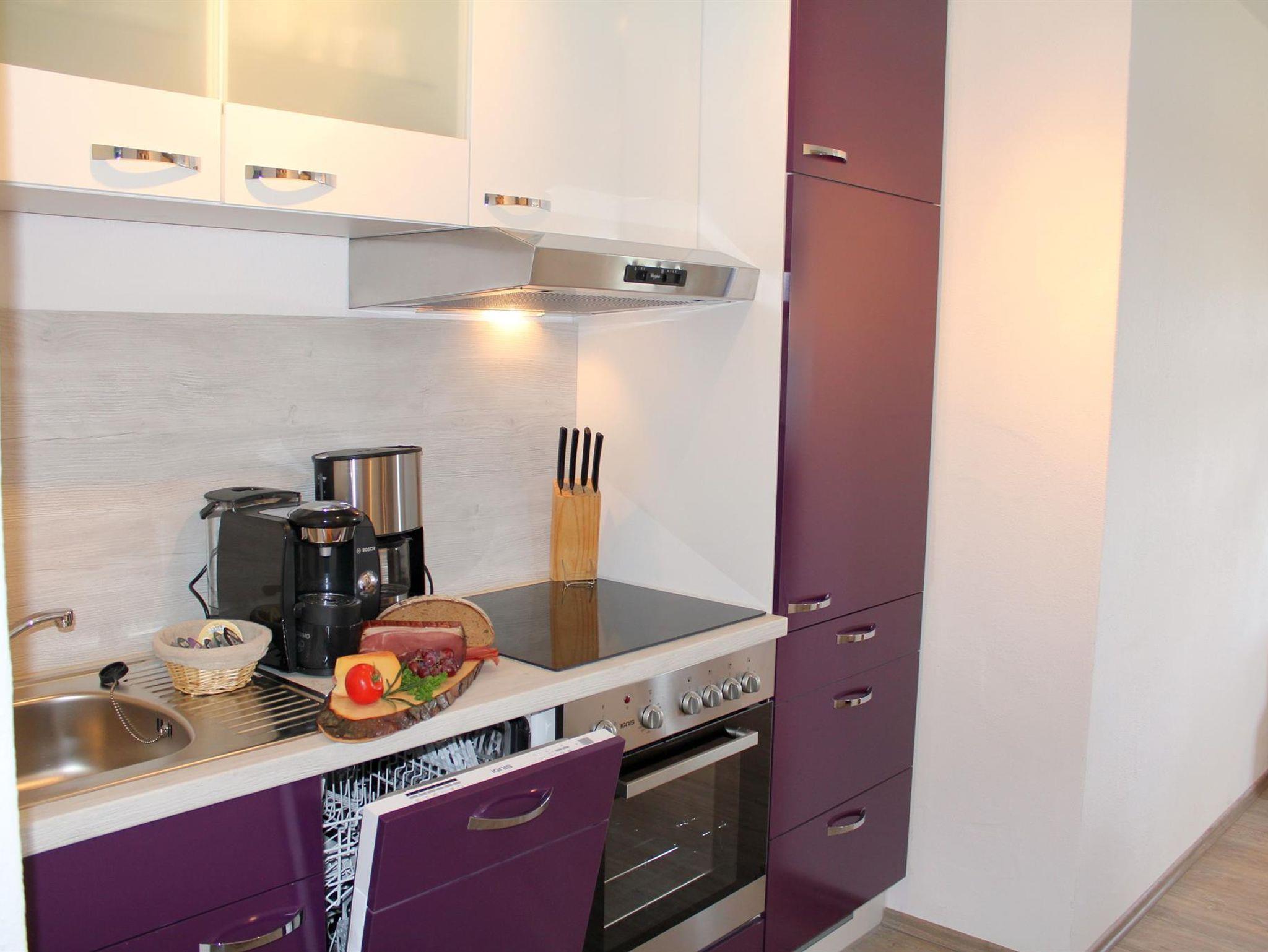 Die neue Einbauküche hat einen 4 Plattenherd (Ceranfeld) und Backofen, Spülmaschine, Kühlschrank mit Gefrierfach, Mikrowelle, 2 Kaffeemaschinen (Filter und Pad Maschine, Bosch-Tassimo). Toaster, Wasserkocher usw.