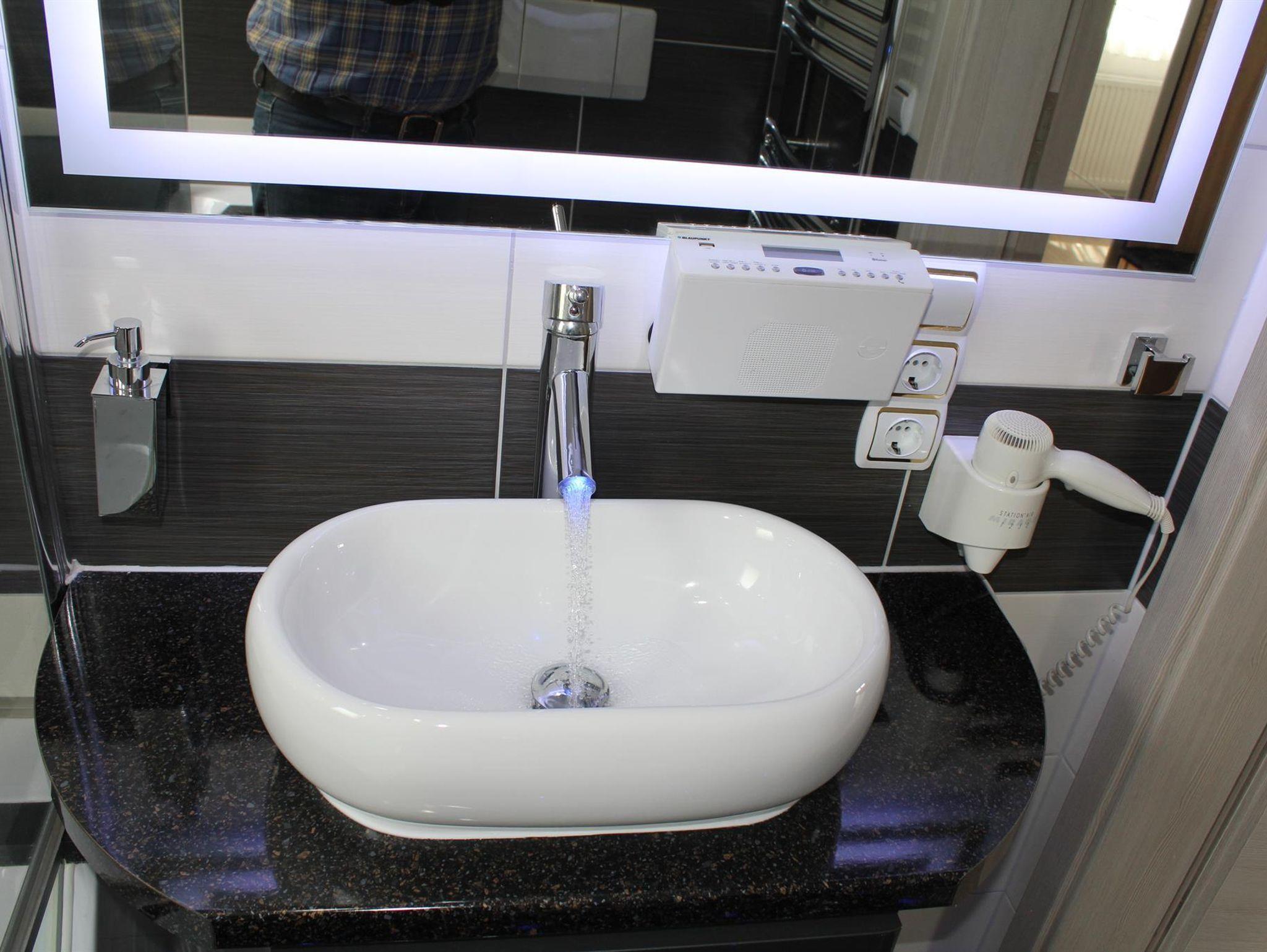 Es gibt Whirlpools, Dampfduschen, TV in den Bädern, LED Bodenbeleuchtung etc.