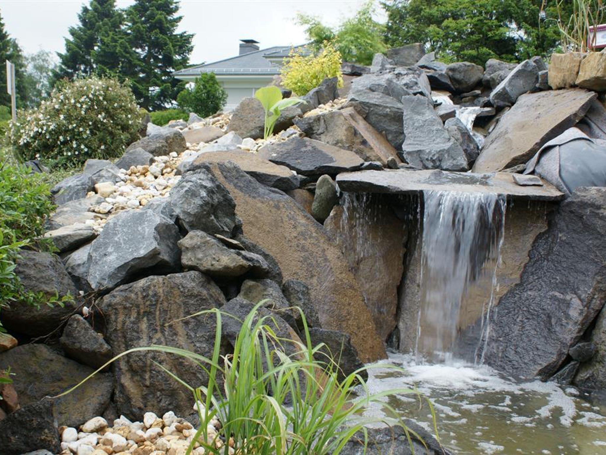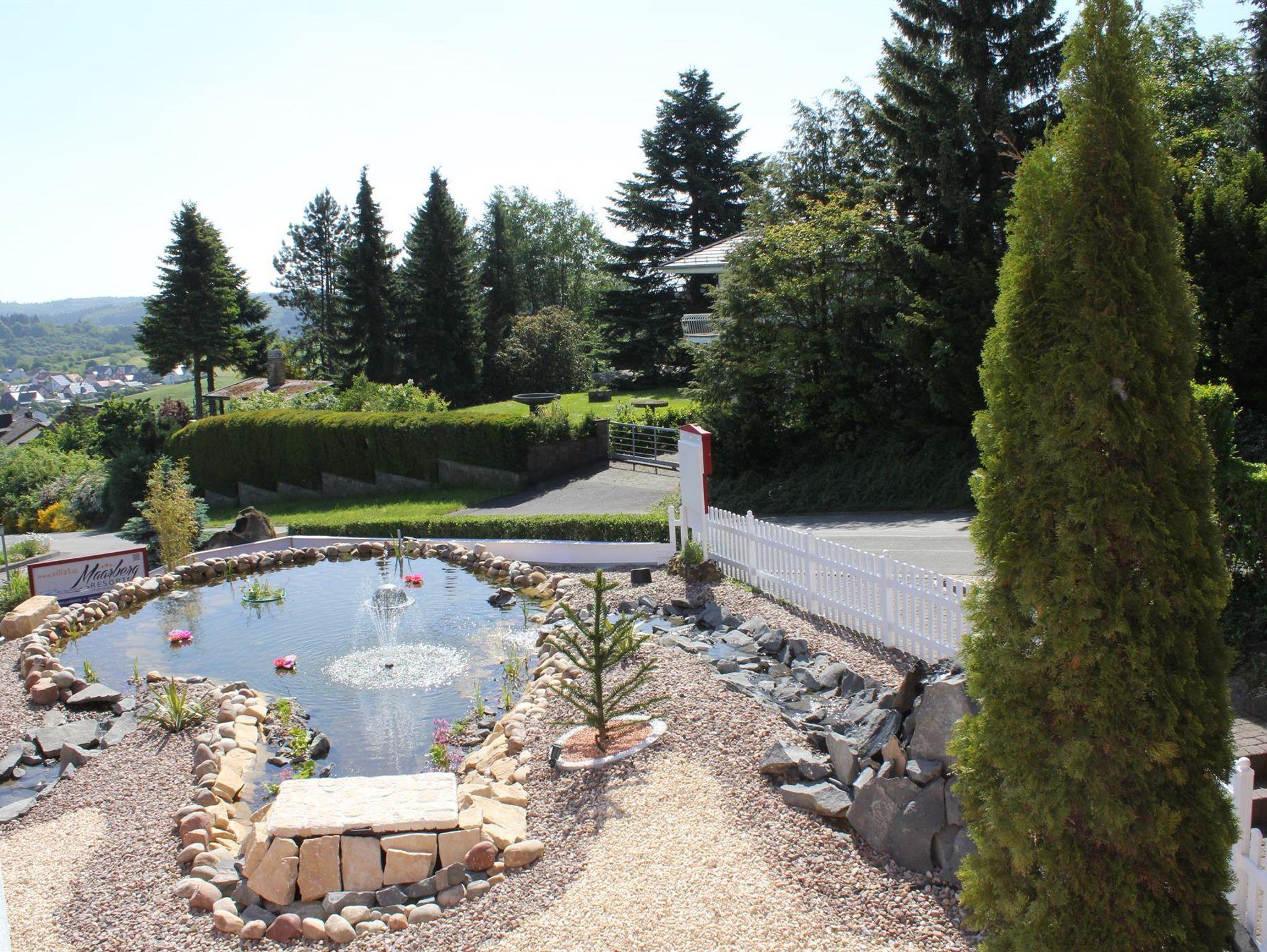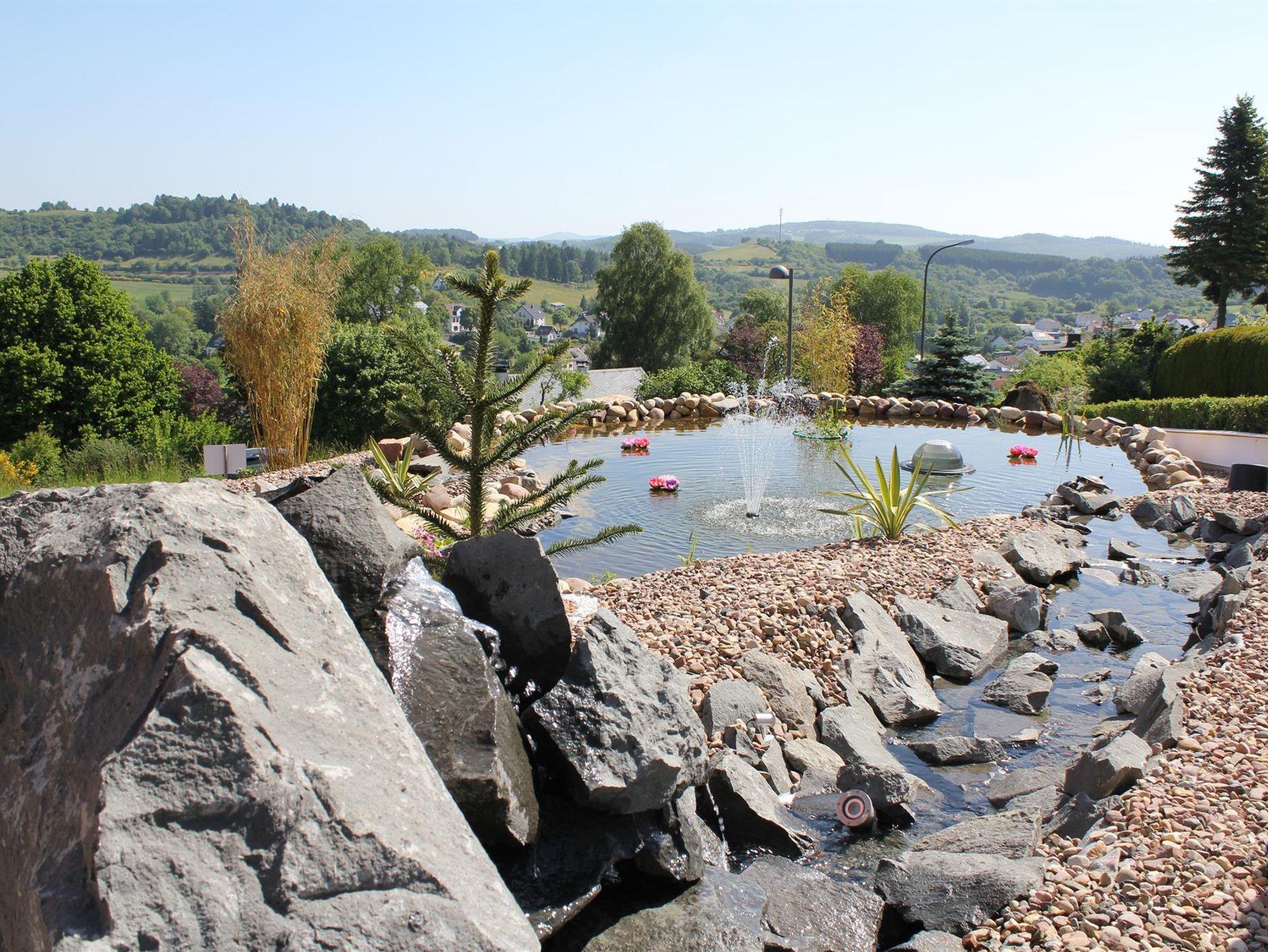 Ein wundervoller und aufwendig angelegter Zierteich mit Kois und anderen Fischen, 2 Wasserfällen und einem Bachlauf gehört zur Anlage.