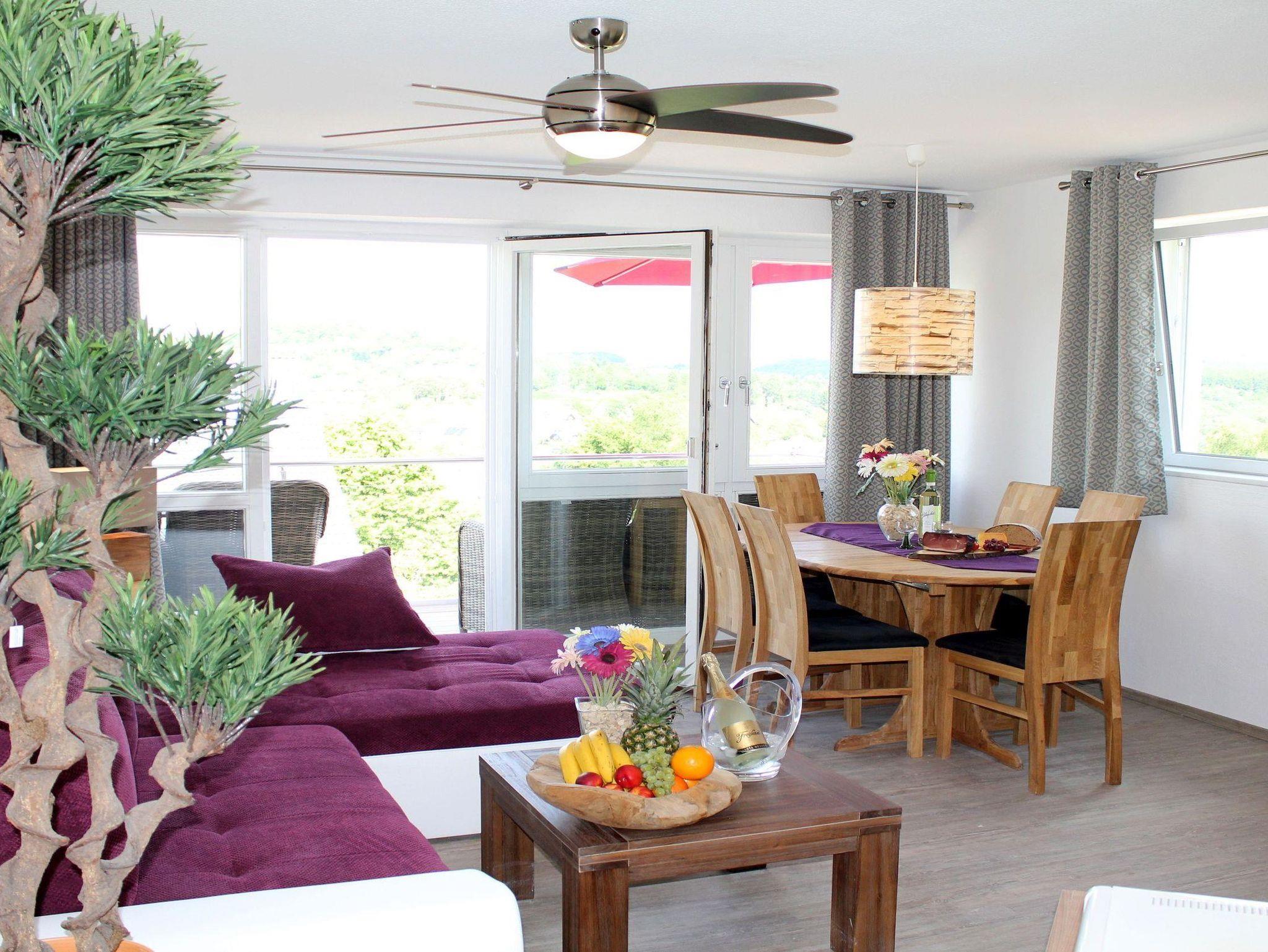Ferienwohnung Maarhöhe im Maarberg Resort: Elegante, komplett neu eingerichtete Ferienwohnung für 2 bis 6 Personen. ca. 54 qm Wohnfläche, Balkon Richtung See und unterem Zierteich mit herrlichem Panoramablick und Blick auf den See, die beiden Zierteiche, die Wasserfälle, Bachläufe und die Zierkiesanlage. Die Ferienwohnung Maarhöhe liegt im Obergeschoß (1 Treppe hoch).