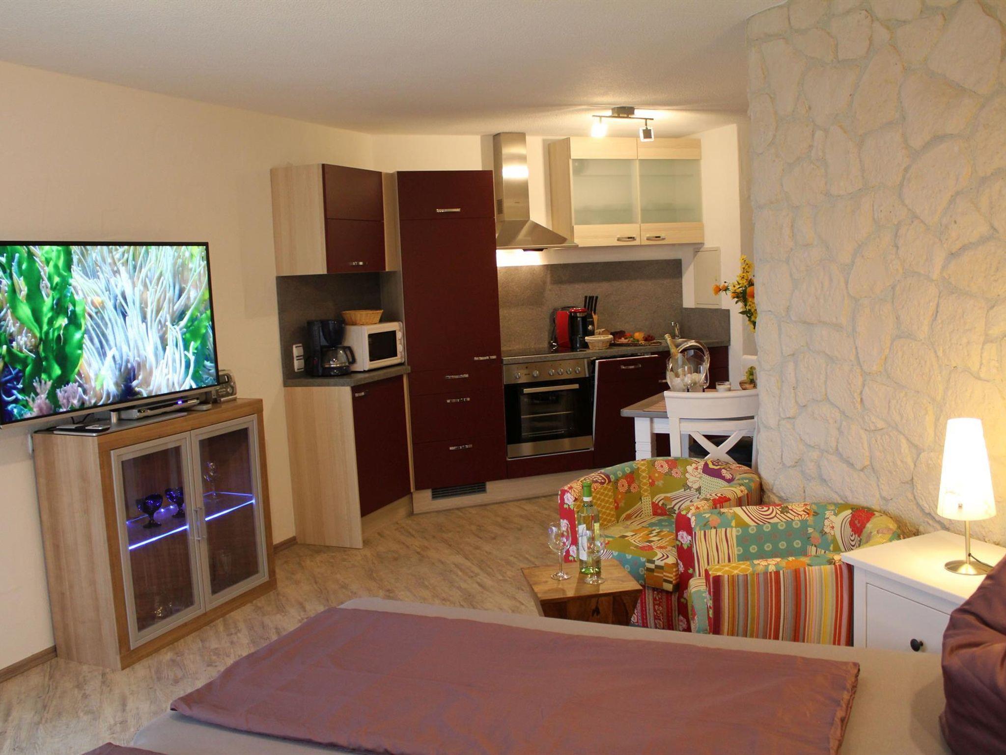 Wohn/Schlafraum mit hochwertigem Boxspringbett (180x200 cm Doppelbett). So steht einem guten Schlaf nichts im Wege. Zudem gibt es einen großen, 127 cm HD/3D Fernseher der neuen Generation. Sie haben eine grosse Auswahl an Fernseh- u. Radiosendern in vielen Sprachen ( 4 Satelliten). Zudem 3D Blueray Player u. DVD-Player. Musikanlage mit Radio, CD usw. Es gibt einen Internetzugang mit WIFI (Wlan).