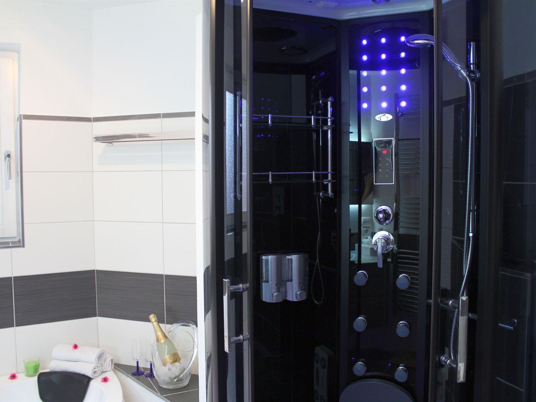 Eine separate Dampfdusche sorgt für einen besonderen Genuß. Integriert ist hier eine Dampffunktion, ähnlich einer Dampfsauna (mit Sitz), zudem eine Regendusche, seitliche Massagedüsen und Fußmassagedüsen. Radio, Lichttherapie usw.