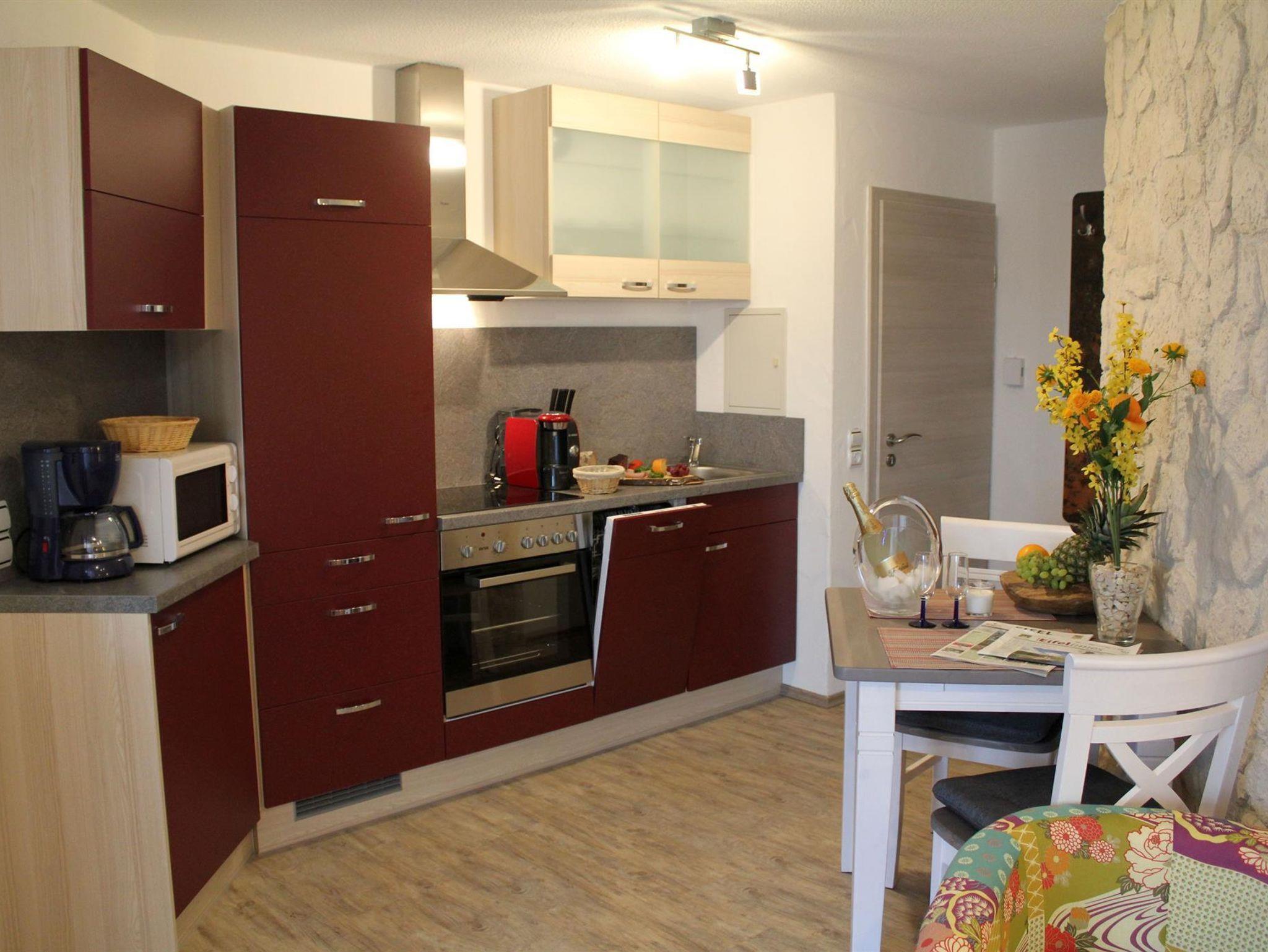 Die neue Einbauküche hat einen 4 Plattenherd (Ceranfeld) und Backofen, Spülmaschine, Kühlschrank mit Gefrierfach, Mikrowelle, 2 Kaffeemaschinen (Filter und Pad Maschine, Bosch-Tassimo). Toaster, Wasserkocher usw. Töpfe und Pfannen sowie Besteck und Geschirr für die höchstmögliche Personenzahl sind selbstverständlich vorhanden. Ein Kinderbett und Hochstuhl können kostenlos bereitgestellt werden.