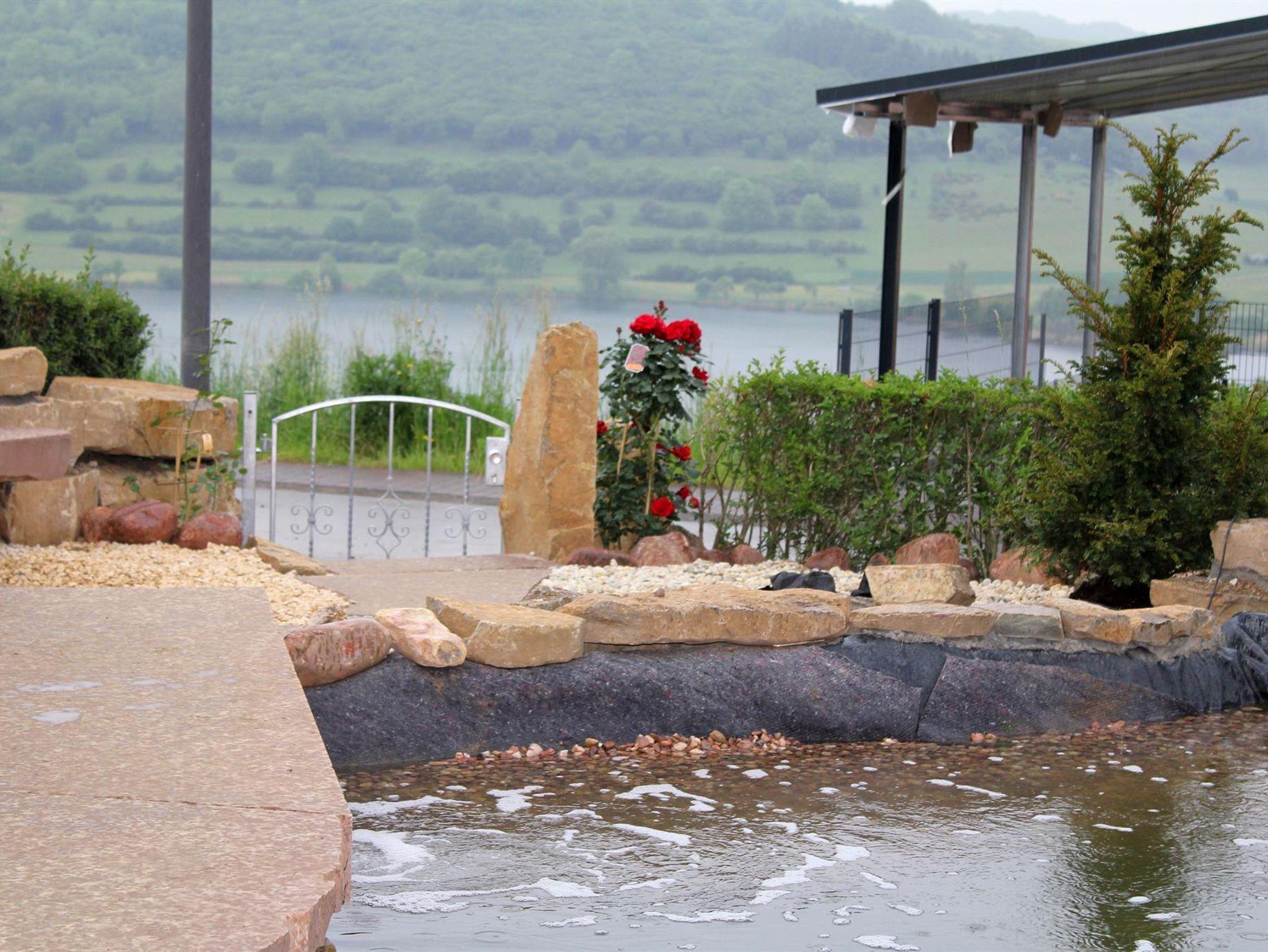 Zwei wundervoll und aufwendig angelegte Zierteiche mit Kois und anderen Fischen, 2 Wasserfälle, 2 Bachläufe und eine gepflegte Zierkiesanlage gehören zur Anlage. Die Aussenanlagen sind abends romantisch angestrahlt. In den Teichen befinden sich auch Schildkröten. Sitzen Sie gemütlich bei einem Kaffee oder einem Cocktail auf dem Balkon oder der Terrasse und schauen Sie den Fischen und den Schildkröten zu. Oder blicken Sie ins Tal auf den See.