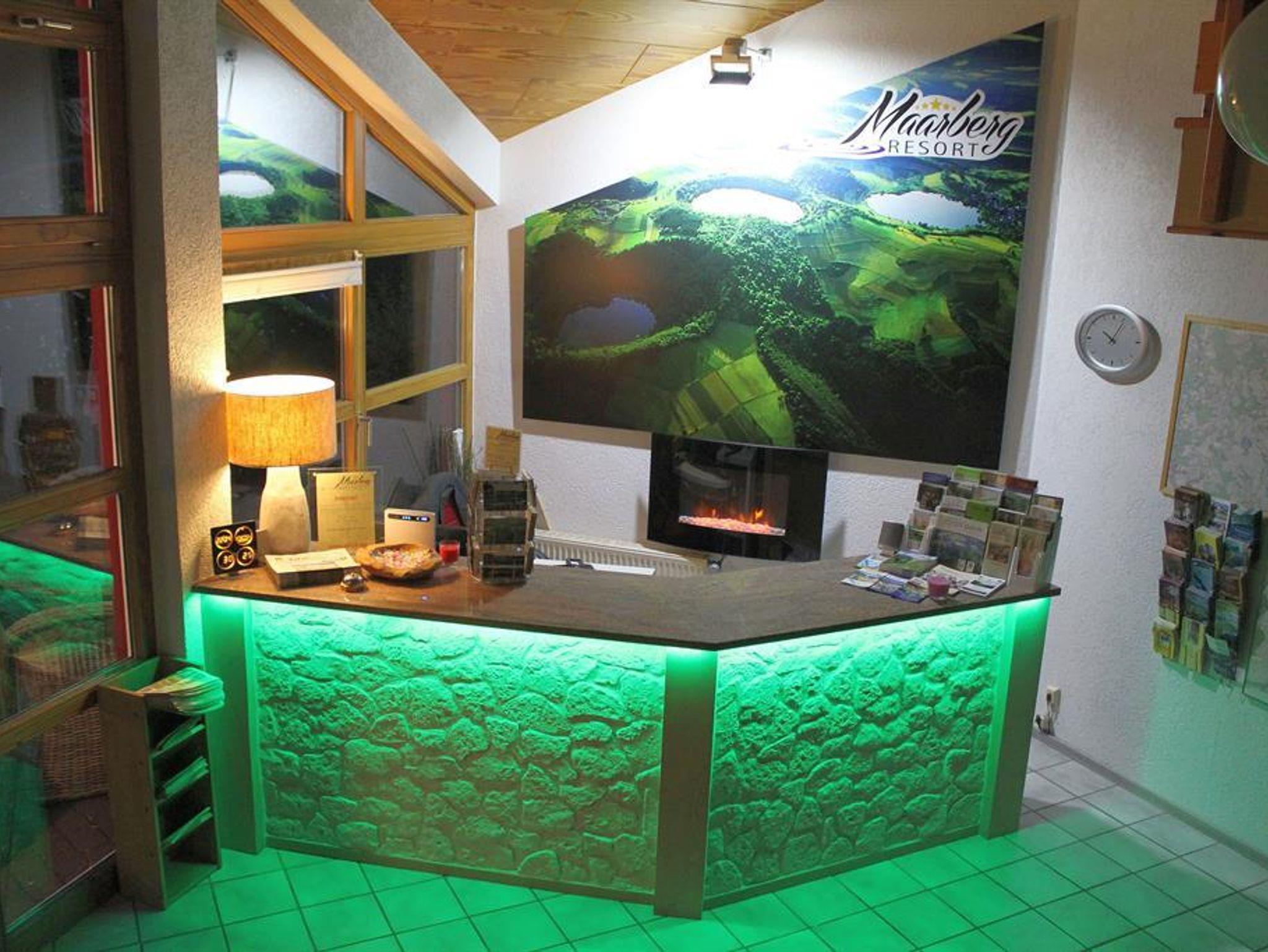 Im Haus: Empfangshalle mit Reception. Die Sauna finden Sie im Untergeschoss des Maarberg Resorts. Sie können die neue Sauna auch alleine nutzen (abschließbar). Zudem im Untergeschoss ein Raum mit Waschmaschine, Wäschetrockner, Bügeleisen und Bügelbrett.