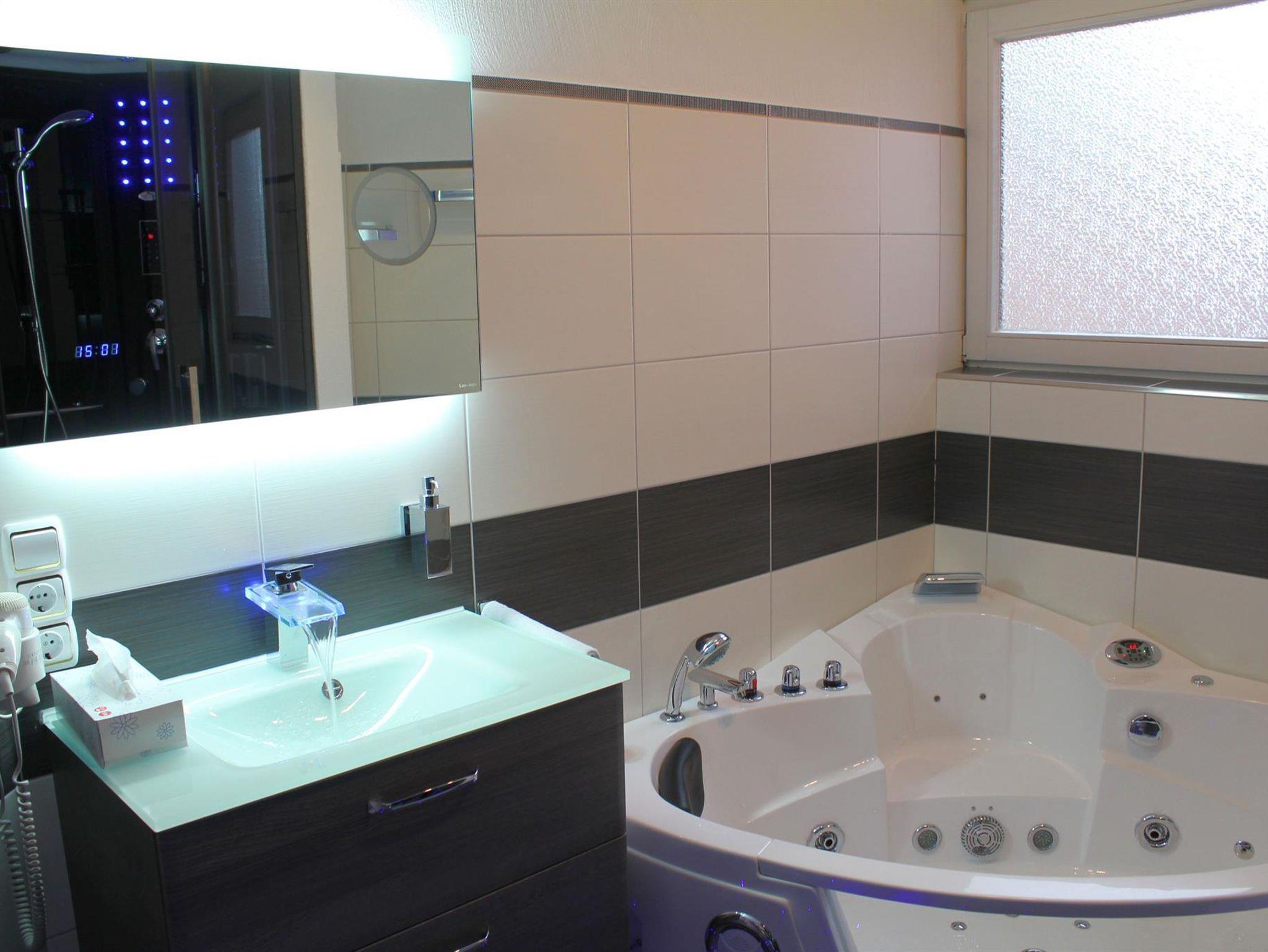 Waschplatz mit einem moderne Glaswaschbecken, LED Wasserhahn, Schubladenunterschrank. Ein großer, beleuchteter Spiegel mit Schminkspiegel und digitaler LED Uhr, ein Hotelfön und eine Personenwaage sind vorhanden. Moderne Heizung (Chrom) mit Handtuchwärmer. Modernes WC mit Absenktechnik.