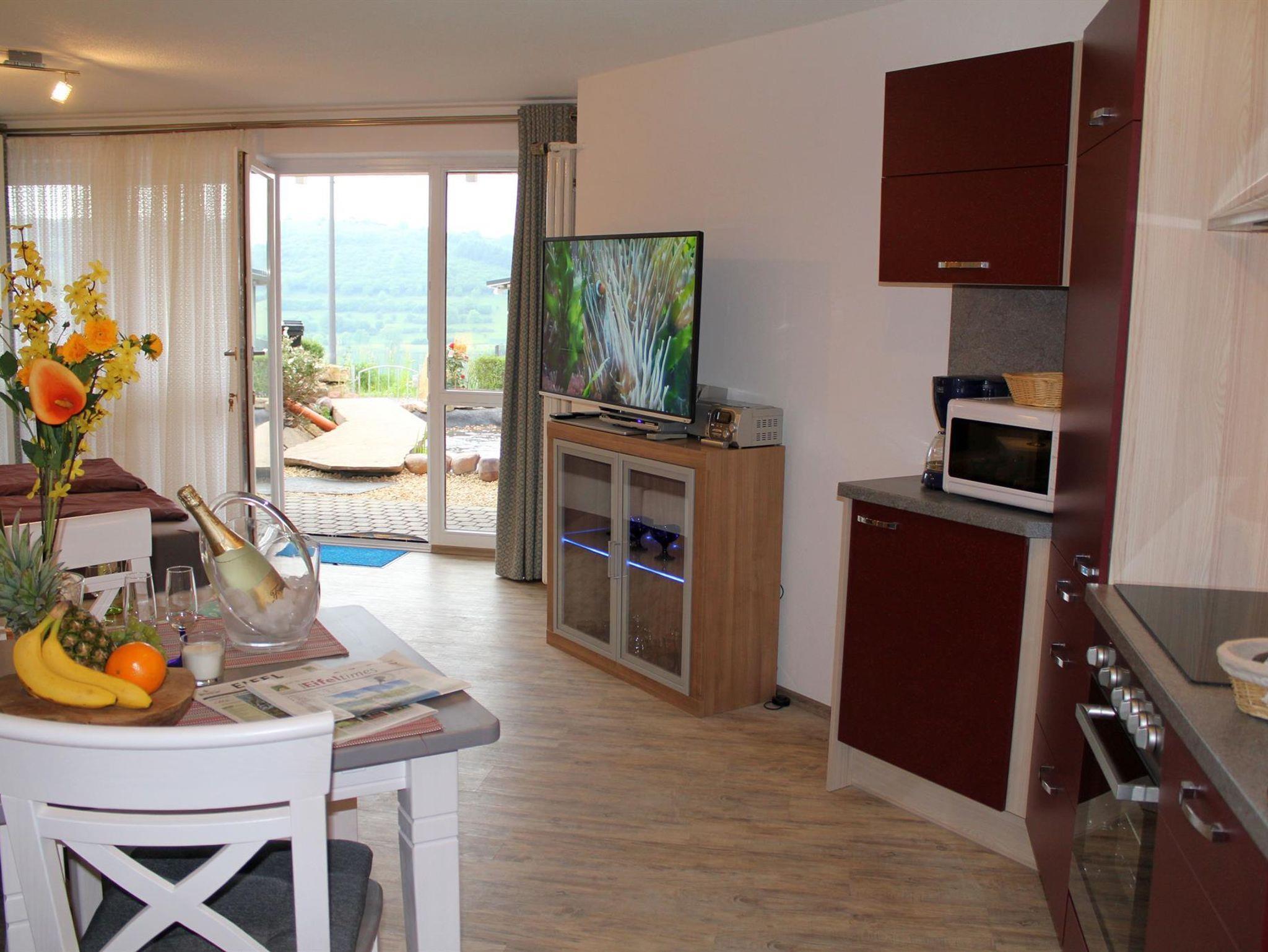 Studio Vulkanpanorama im Maarberg Resort: Elegantes, komplett neu eingerichtetes Studio für 2 Personen. ca. 31 qm Wohnfläche, Terrasse Richtung See und Zierteich. Das Studio liegt ebenerdig (3 Stufen vor der Terrasse) und bietet einen schönen Blick auf den See, die herrliche Landschaft und den gepflegten Zierteich. Sitzen Sie in der Wohnung oder auf der Terrasse und lassen Sie sich von dem Blick verzaubern.