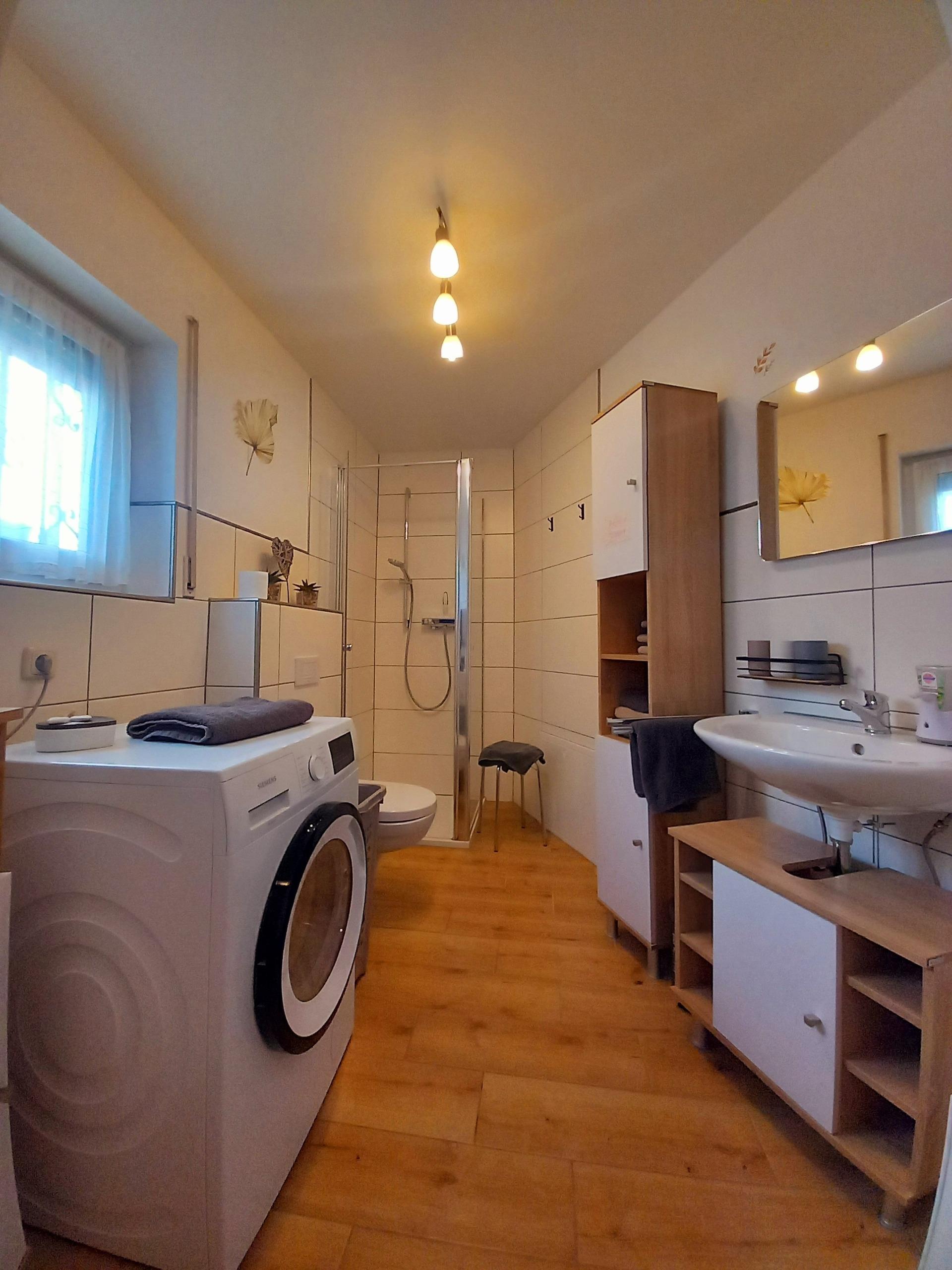 Erdgeschoss mit Bad/Dusche und einem Schlafzimmer mit Doppelbett.