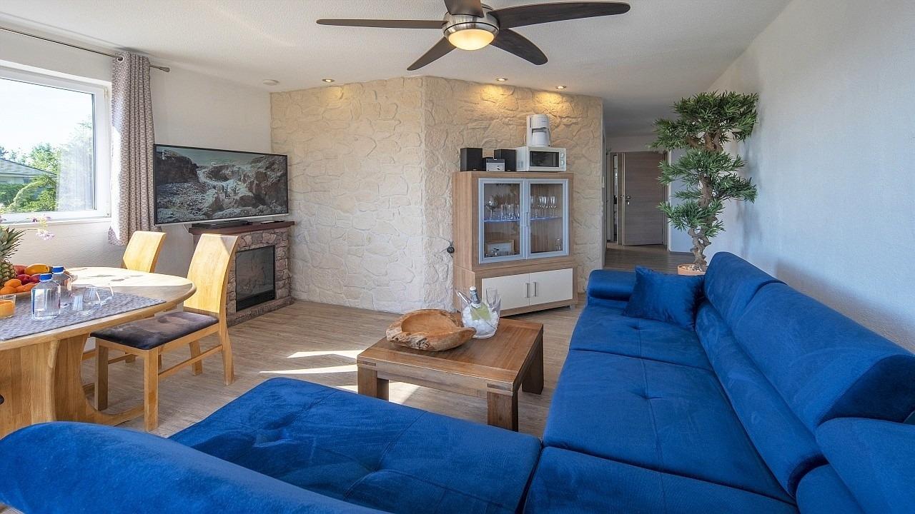 Die hell und freundlich eingerichtete Wohnung vermittelt einen naturverbundenen Flair mit viel Holz und Stein. Zudem verbreitet der Elektrokamin und ein eleganter Deckenventilator eine besondere, gemütliche Atmosphäre.