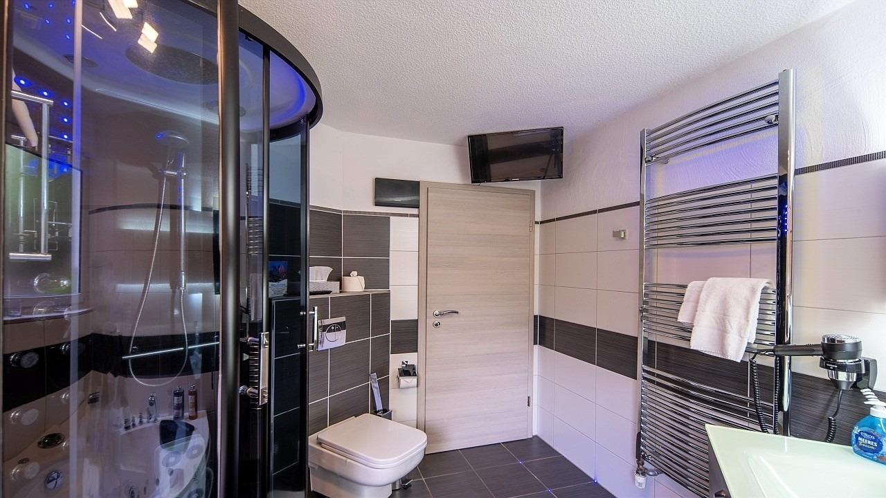 Waschplatz mit einem moderne Glaswaschbecken, LED Wasserhahn, Schubladenunterschrank. Ein großer, beleuchteter Spiegel mit Schminkspiegel und digitaler LED Uhr, ein Hotelfön und eine Personenwaage sind vorhanden. Moderne Heizung (Chrom) mit Handtuchwärmer. Modernes WC mit Absenktechnik.