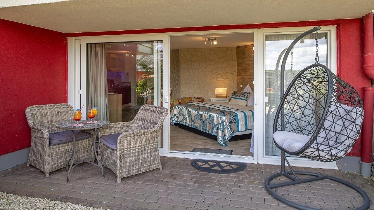 Zur Wohnung gehört eine Terrasse mit 2 Loungesesseln und einem Cocktail- bzw. Kaffeetisch.