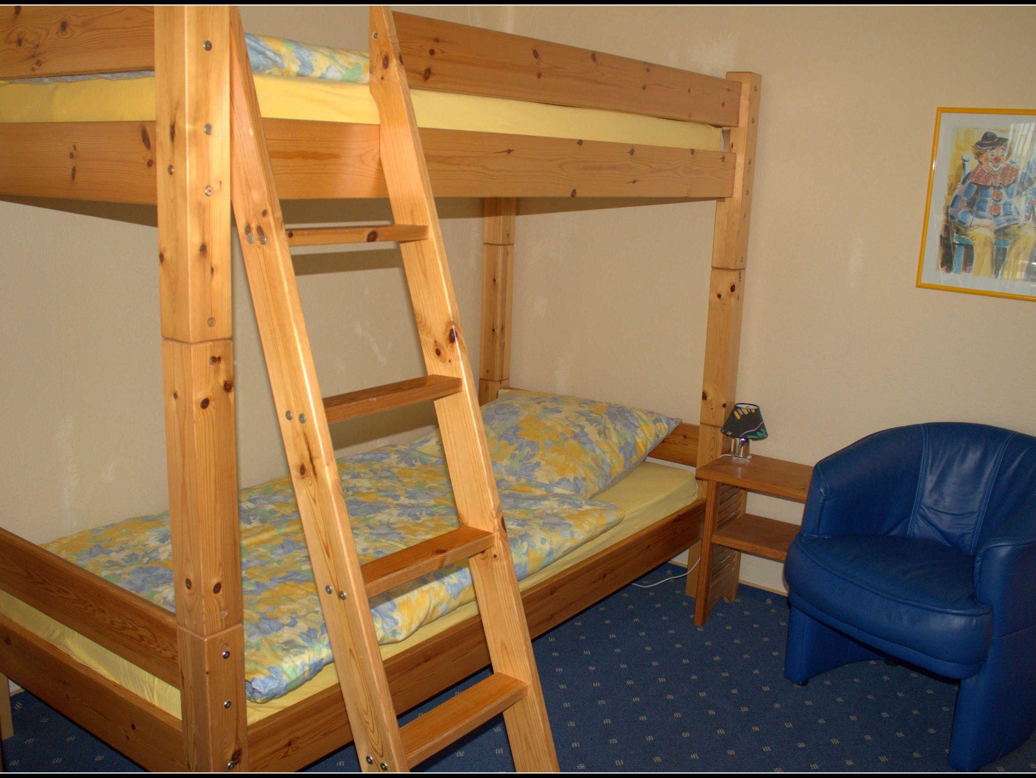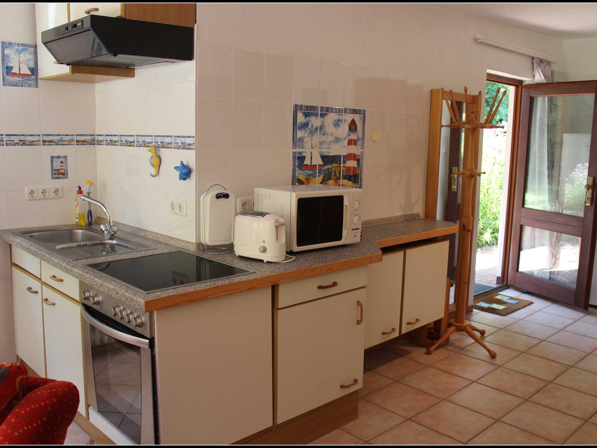 Der ca. 65 m² große Bungalow befindet sich in einem Extrahaus mit separatem Eingang. Die Gäste gelangen ohne Stufen in die Unterkunft, da diese sich im Parterre befindet. Die große Terrasse mit einem überdachten Freisitz lädt zum gemütlichen Beisammensein ein. Der kleine Bungalow besteht aus einem kombinierten Wohn-/Essraum mit Essplatz und Fünfer-Sitzgruppe als Polstergarnitur, Sat-TV, intergierter Küchenzeile mit Ceranfeld/Herd und Mikrowelle. 2 separate Schlafräume mit Elternzimmer mit einem Ehebett und einem Kinderzimmer mit einem Etagenbett. Ein Kinderbett sowie ein Einzelbett für eine erwachsene Person kann je nach Wunsch in einem der Schlafzimmer beigestellt werden.