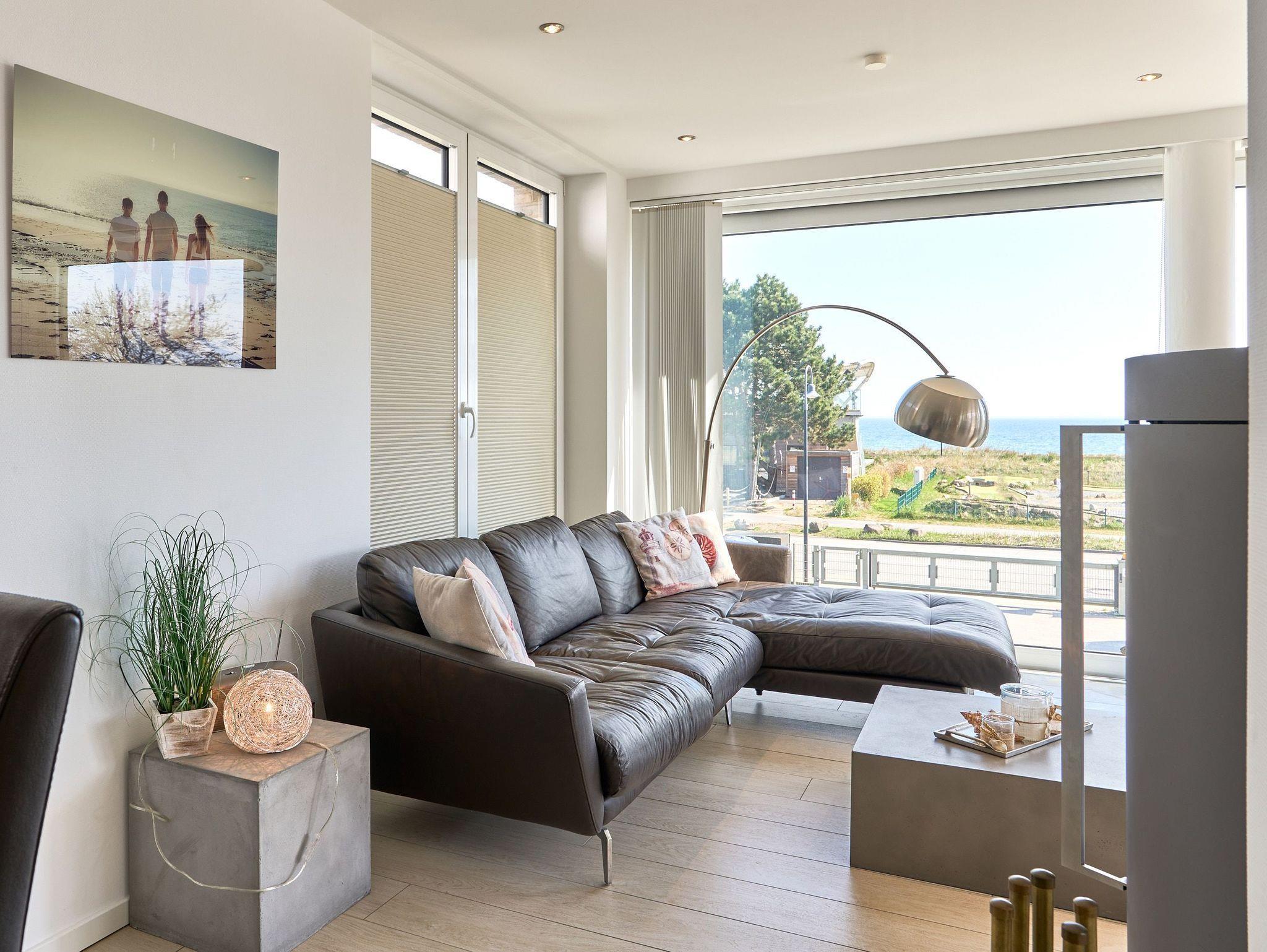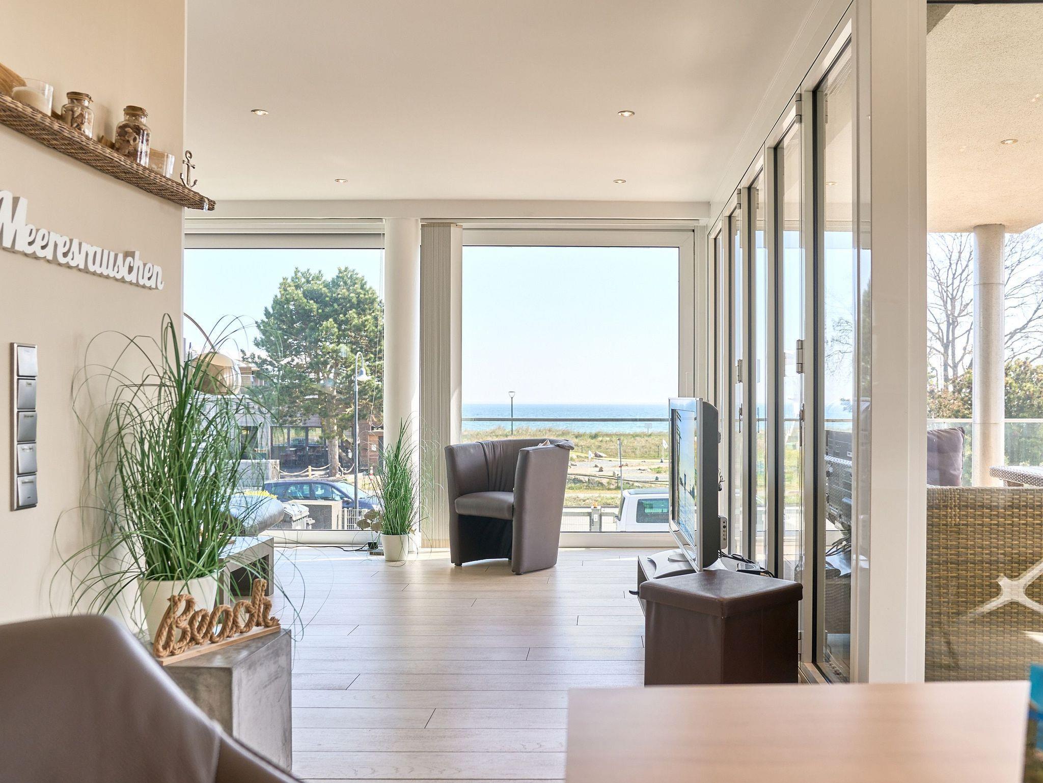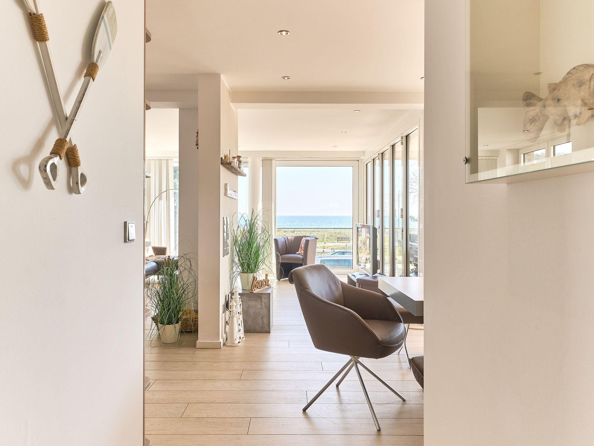 Es erwartet Sie schon beim Betreten der Wohnung der herrliche Blick auf die Ostsee. Der Wohnbereich dieser Traumwohnung ist durch die bodentiefen Fenster absolut hell und lichtdurchflutet, selbstverständlich ist bei Bedarf ein Sichtschutz vorhanden. Der moderne Wohnbereich bietet Ihnen einen gemütlichen Essbereich (auch von hier haben Sie die freie Sicht auf die Ostsee), mit ausreichend Platz für 6 Personen. Hier können Sie bequem essen sowie gesellige Stunden verbringen. Die moderne Küche ist komplett ausgestattet und lässt keine Wünsche offen, der gegenüberliegende Tresen bietet Platz für drei Personen.
