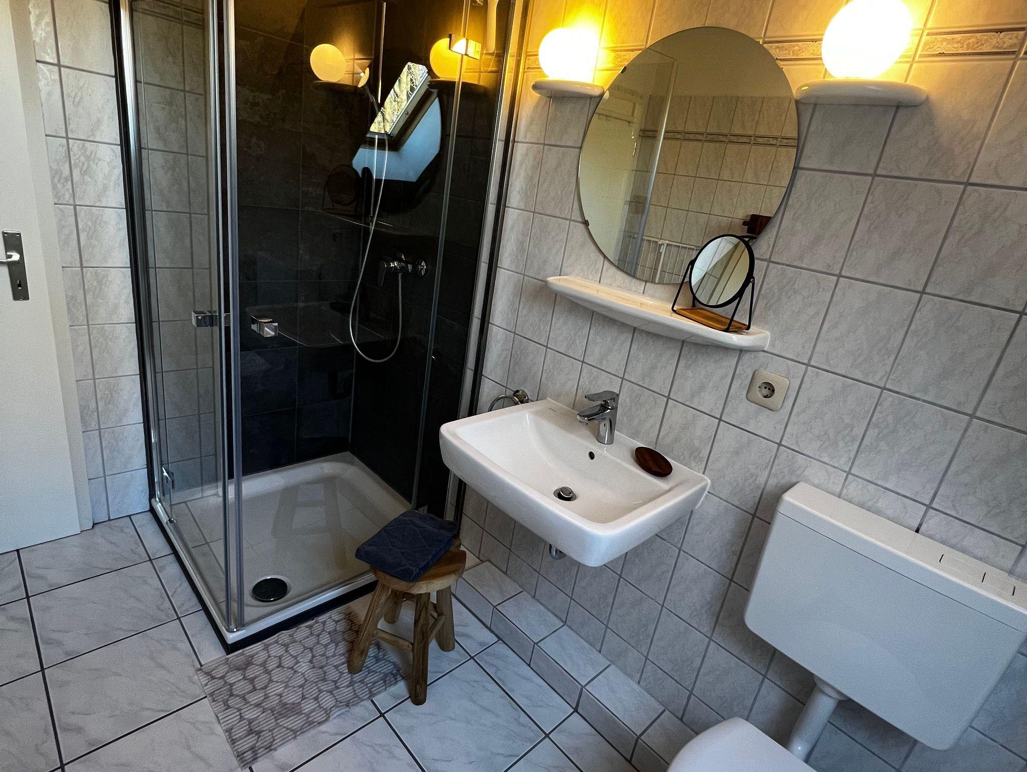Das geräumige Bad mit Dusche/WC bietet durch das kleine Dachfenster einen