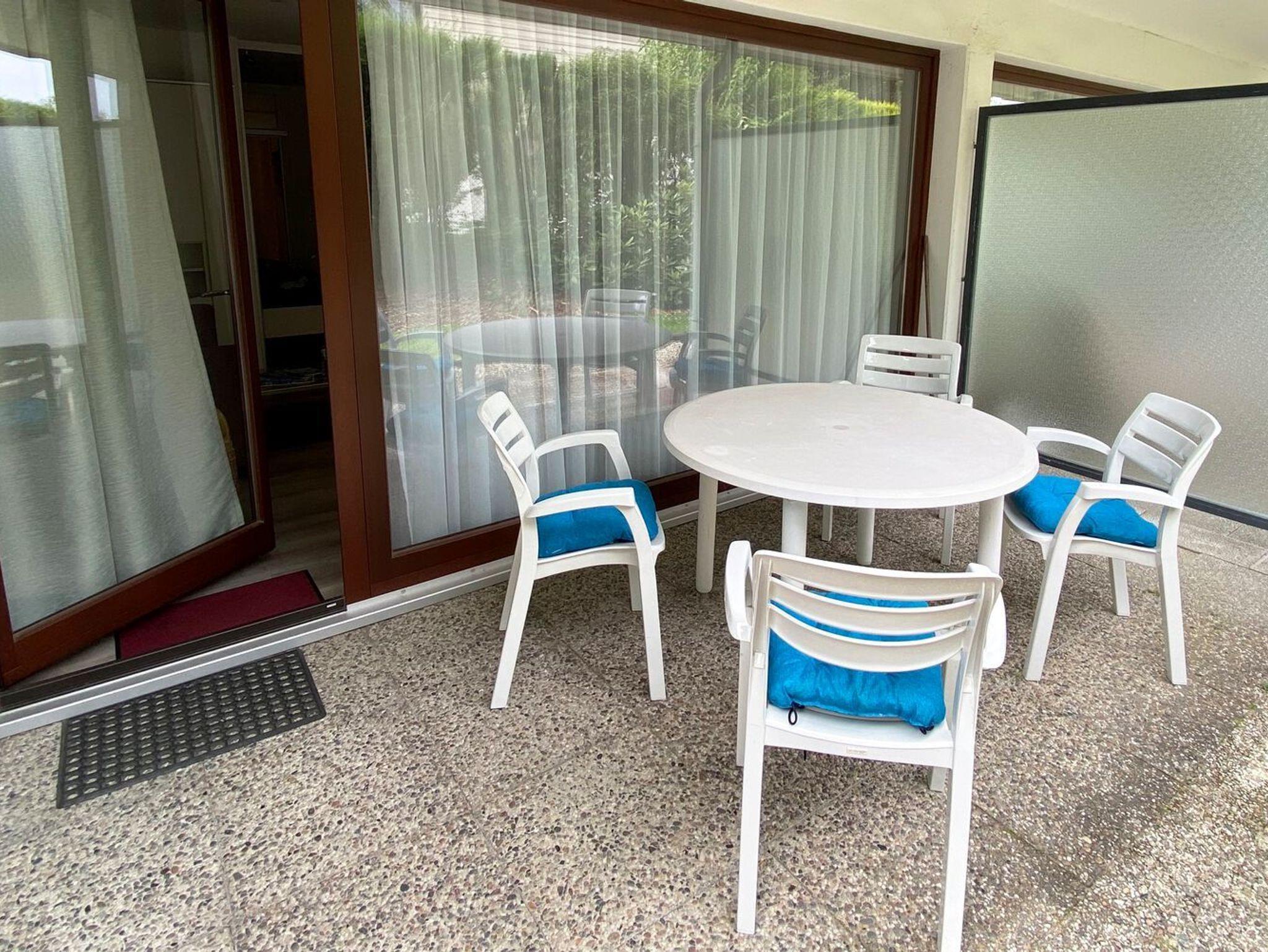 Terrasse: 4 Stühle mit Auflagen, halb überdacht, Südlage, Tisch