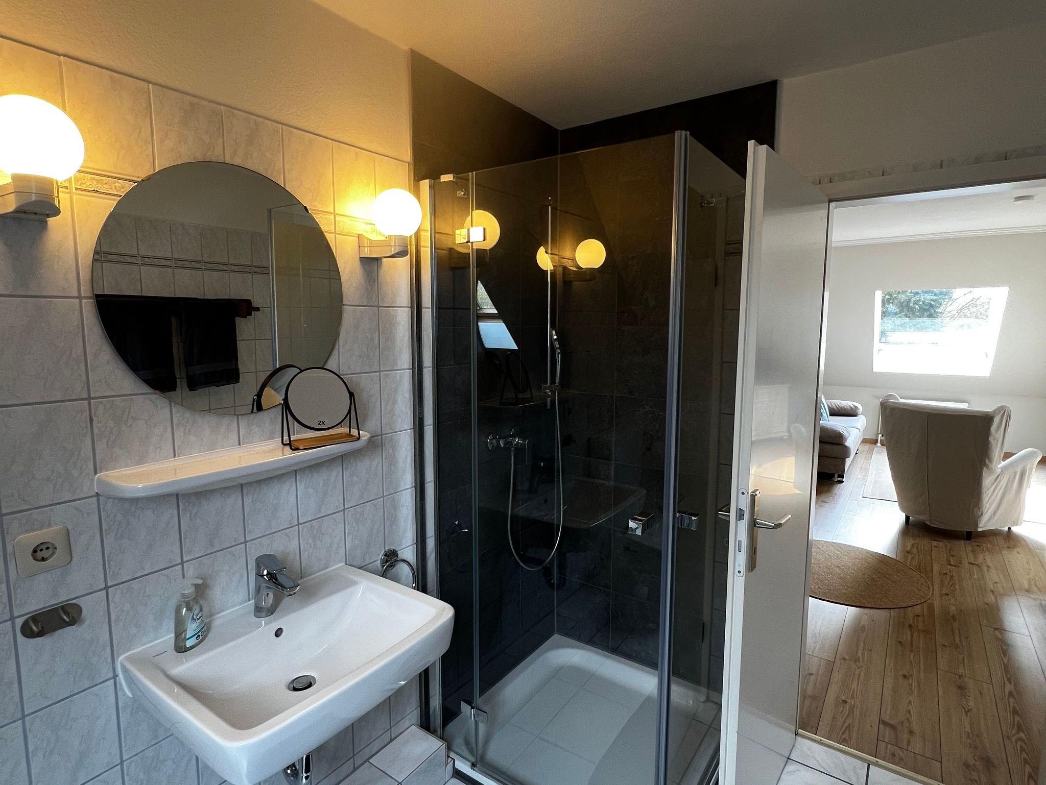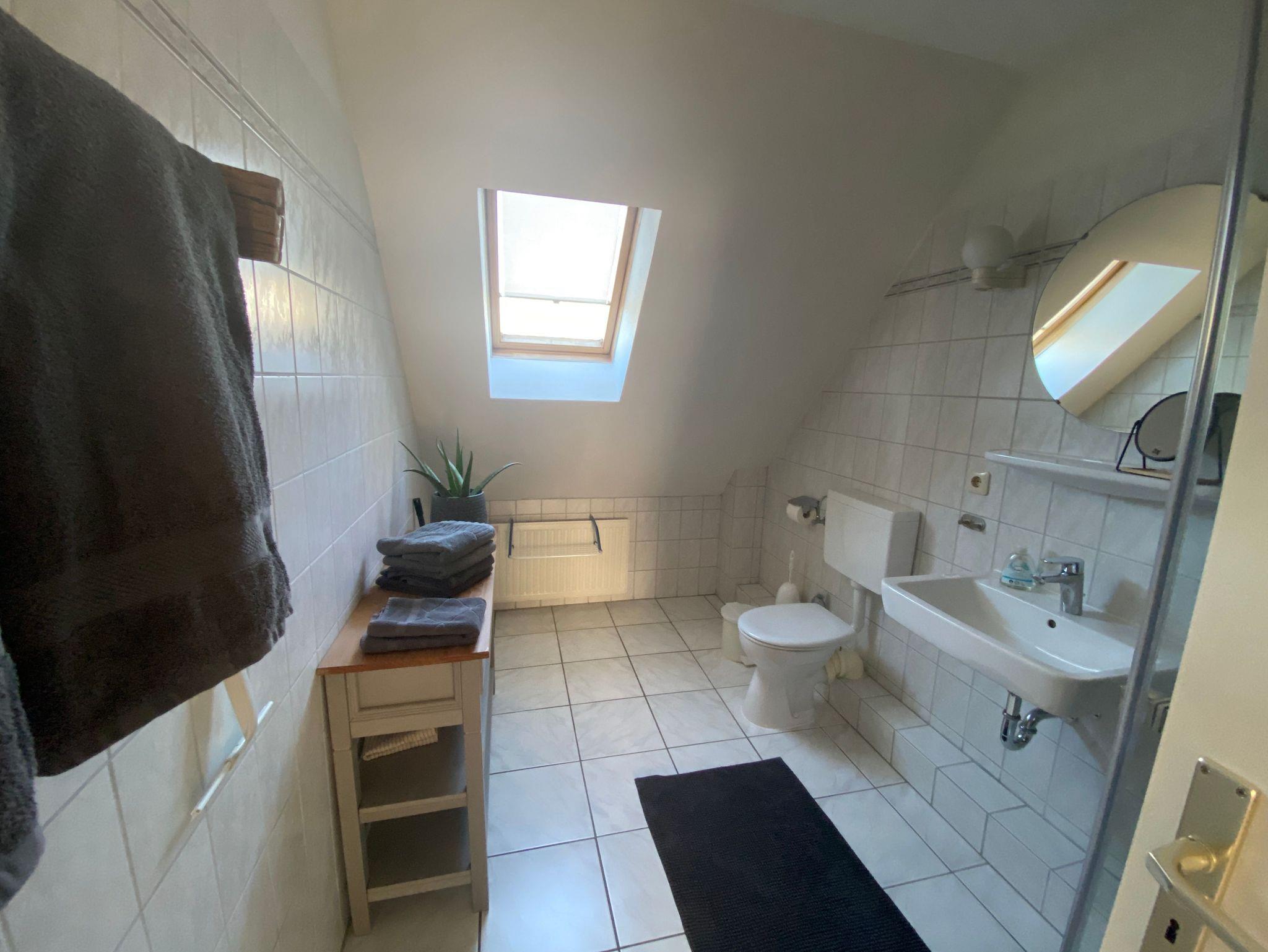Das Badezimmer mit Dusche/WC ist angenehm geräumig, und durch das Dachfenster