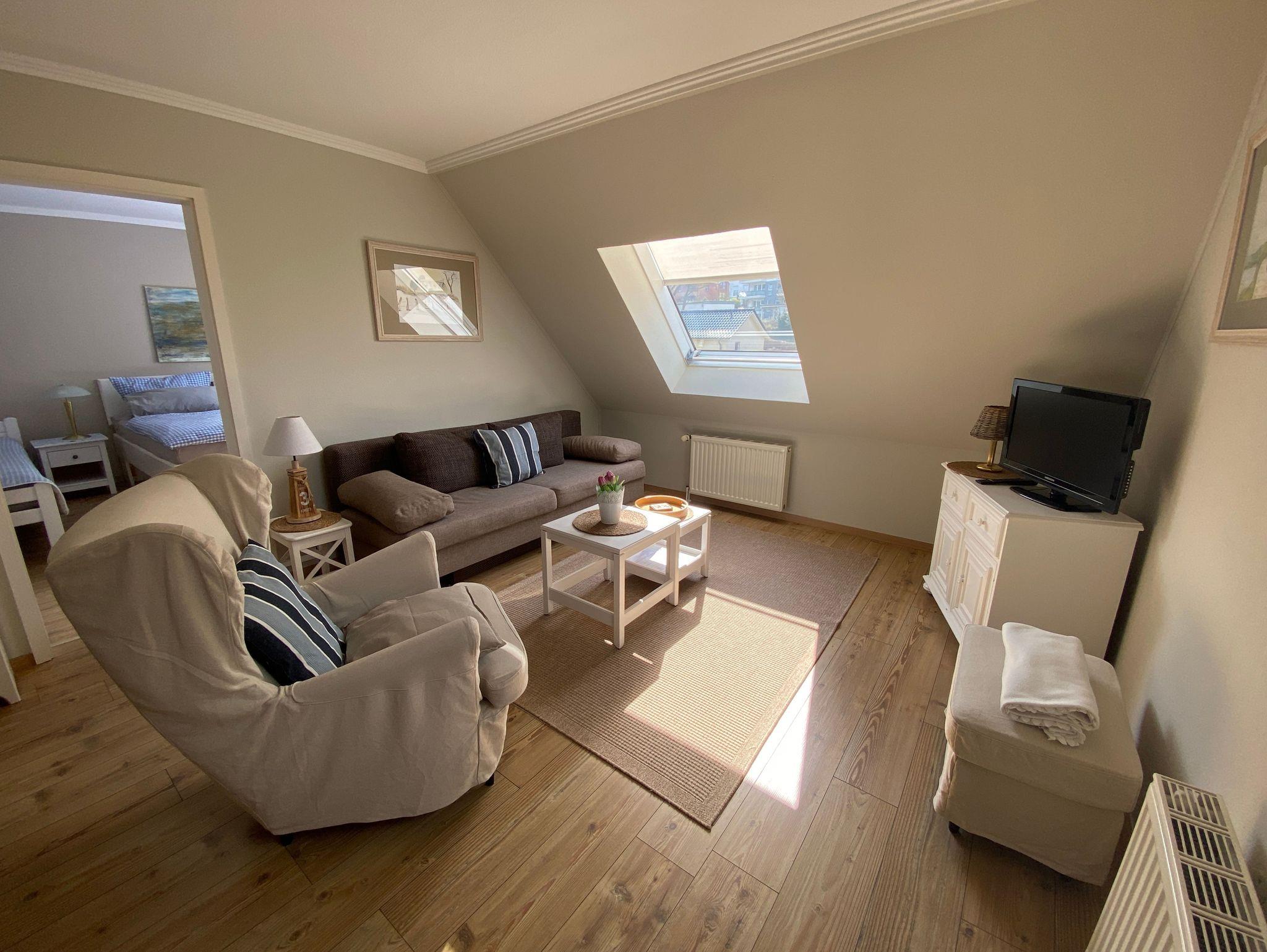 Dort befindet sich ein TV, eine Schlafcouch und ein gemütlicher Ohrensessel. Die separate