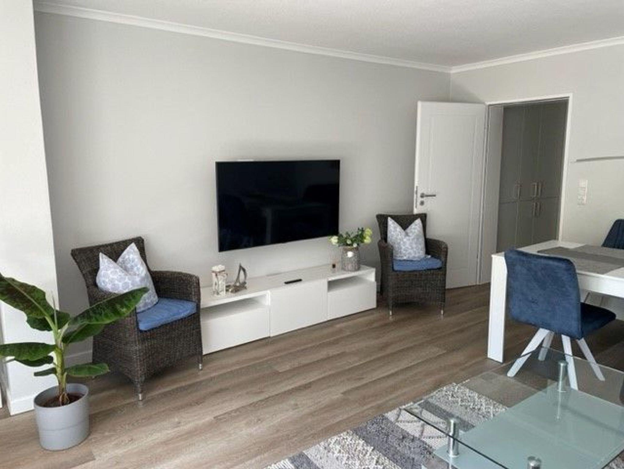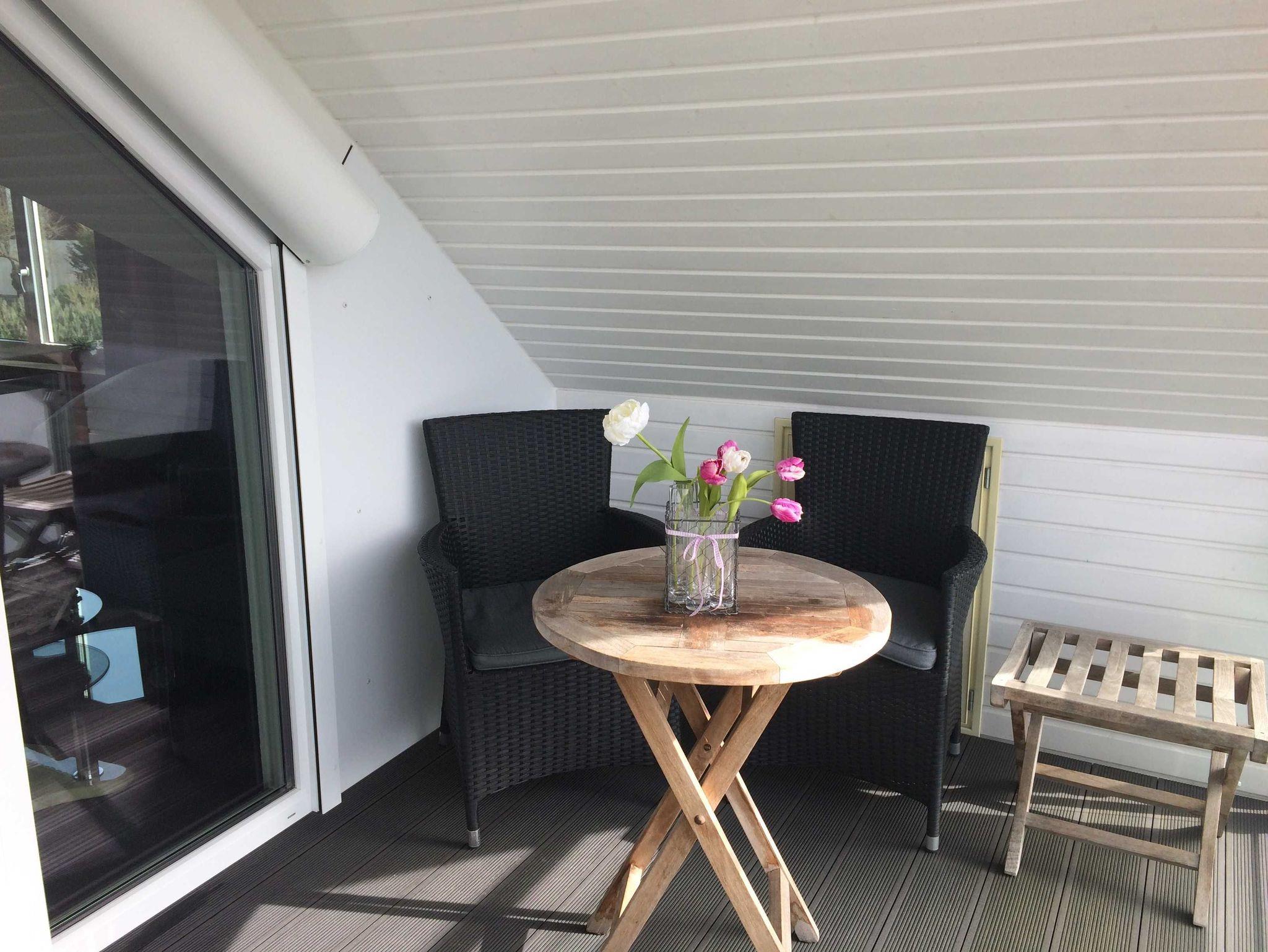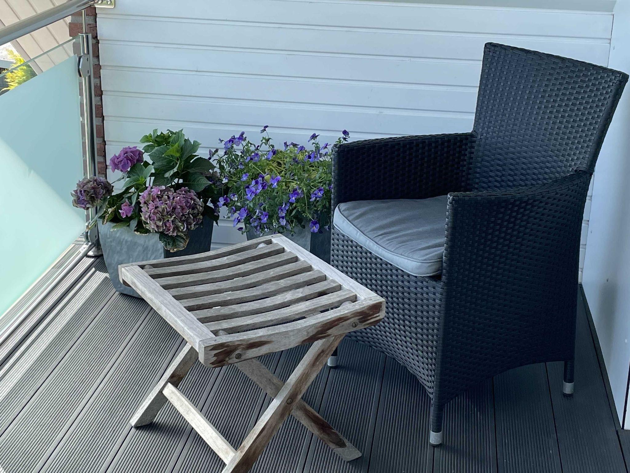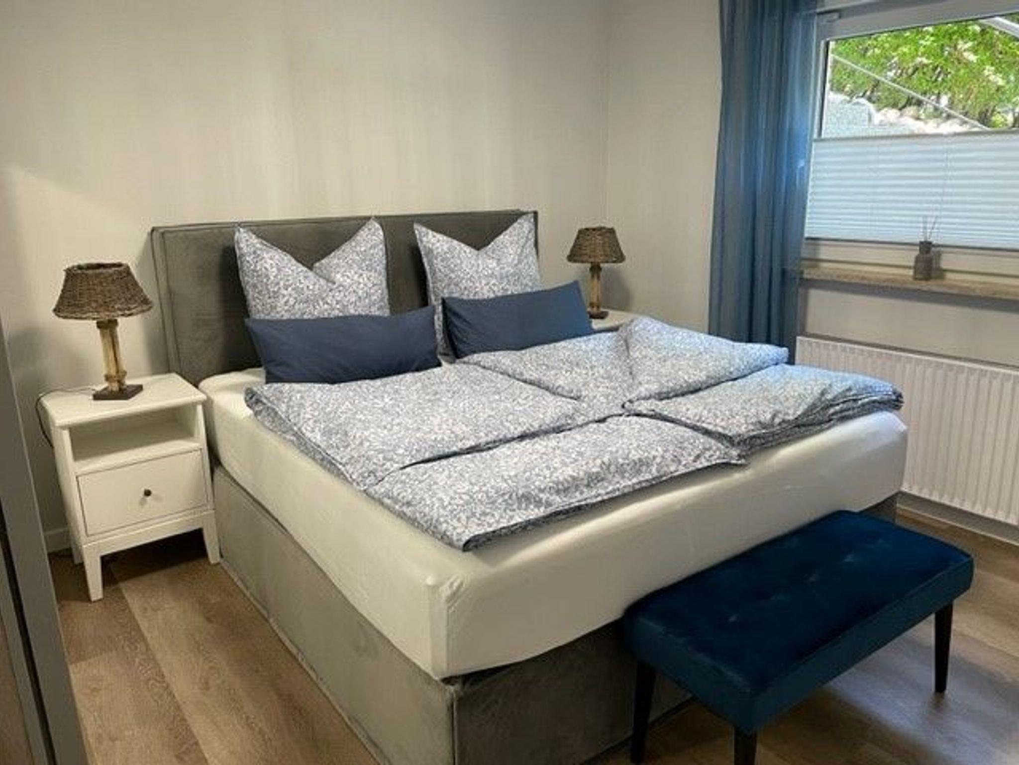 Modern und neu ausgestattete Ferienwohnung in einer ruhigen Lage. Das Schlafzimmer verfügt über ein Boxspringbett. Die Terrasse hat eine süd-west Ausrichtung.