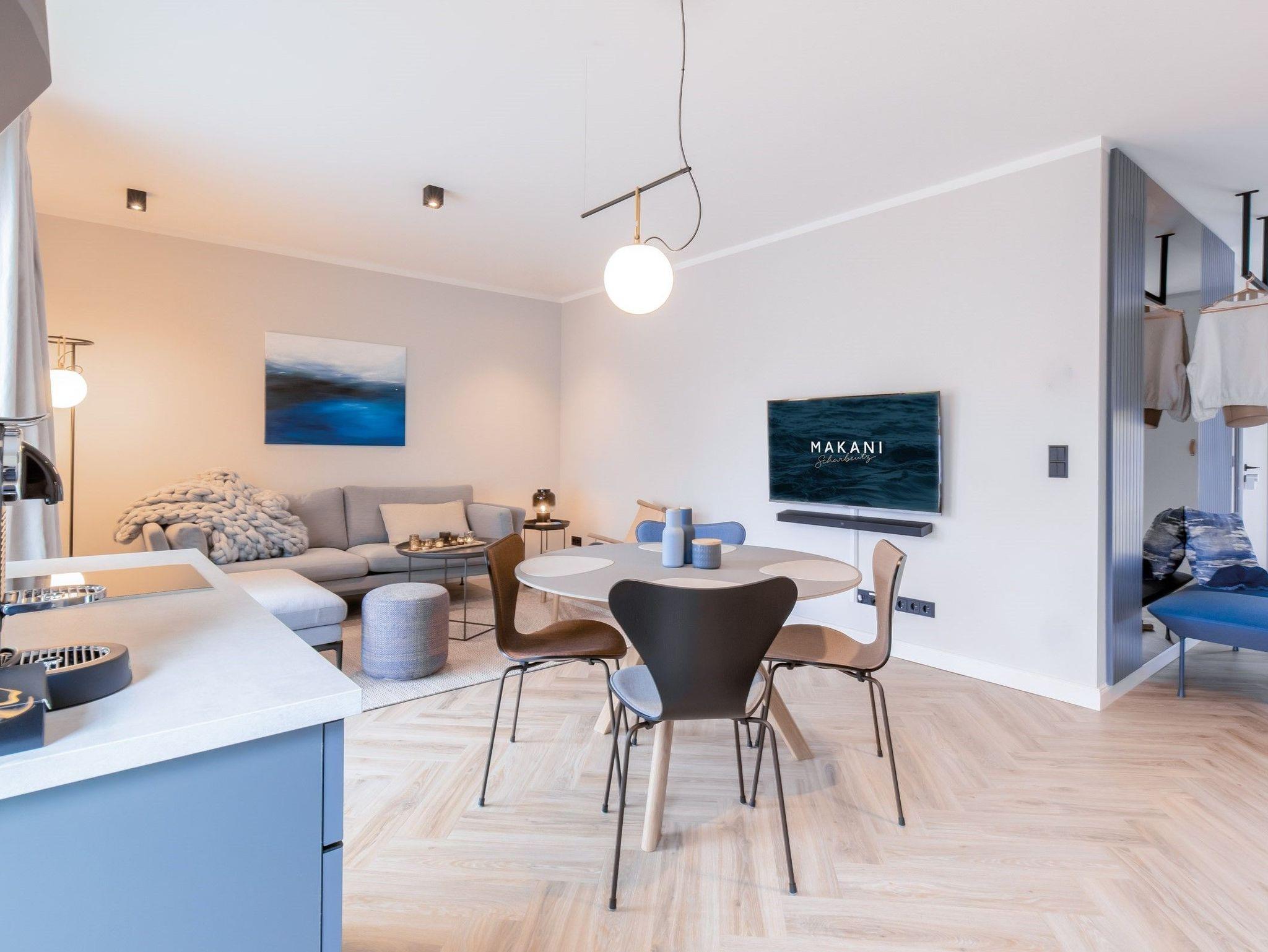 Makani 2 ist ein ebenerdiges Ferienappartement für Familien. Sie verbringen hier ihren Ostseeurlaub in gemütlicher Atmosphäre. Hier ist alles vorhanden, was für Entspannung und eine gute Zeit sorgt. Zur Ausstattung gehören zwei gemütliche Schlafzimmer, eine große Terrasse, Unterhaltungselektronik und spannende Brettspiele. Viel Platz für vier Personen finden Sie bei Makani im ebenerdigen Ferienappartement 2. Beim Eintreten gelangen Sie durch das ansprechende Entree in den offenen Wohn- und Speiseraum. Seine Einrichtung zeigt sich in einem angenehm reduzierten, skandinavischen Stil: mit offener Küche, Esstisch, bequemen Polstermöbeln und Sitzfenstern. Der Übergang auf die Südterrasse ist fließend frühstücken Sie doch einfach dort draußen und genießen Sie die Sonne. Vom Wohnbereich aus erreichen Sie zwei Schlafzimmer: Davon eines mit einem breiten Bett (180 x 210cm) und einem Fensterblick, der das Urlaubsgefühl unterstreicht. Direkt nebenan befindet sich das komfortable Bad, mit allem, was Sie während Ihres Aufenthalts brauchen können: Von der bodengleichen Dusche bis zur Waschmaschine ist alles vorhanden.