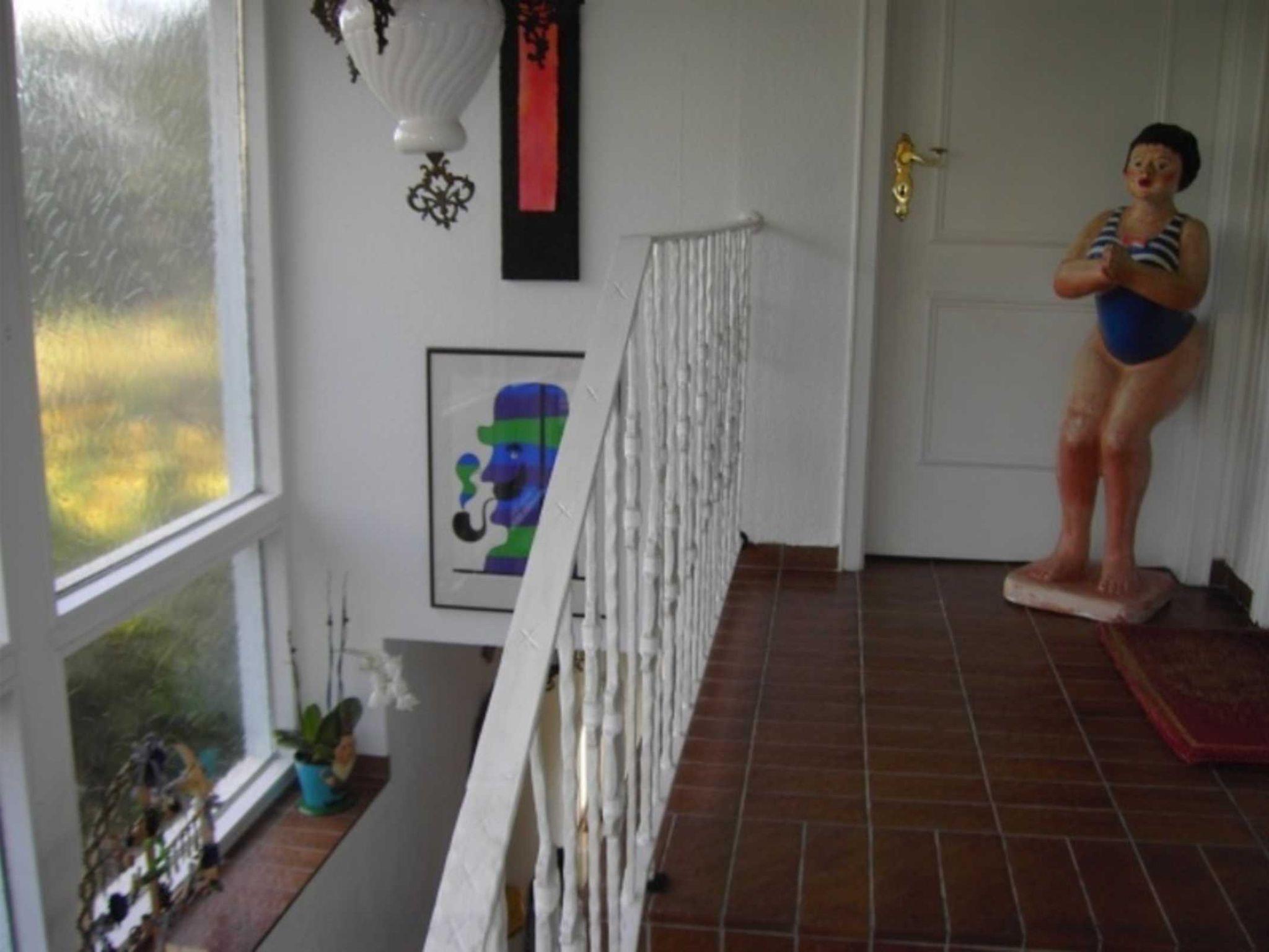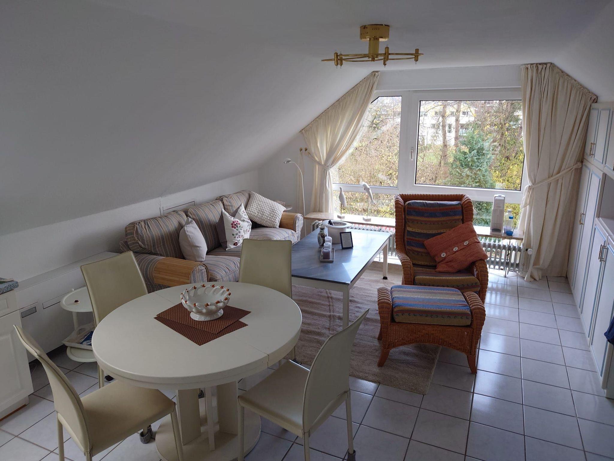 1. Obergeschoss: 2 Zimmer, ca. 44 m², Wohnzimmer mit großem Studiofenster (Seeseite), stilvoll eingerichtet. Im Raum Essküche mit Sitzgruppe. Separate Dusche und WC mit stationärem Schminkspiegel und Fön. Schlafzimmer mit 2 Einzelbetten sowie Leselampen. Wandschränke, Ganzkörperspiegel. Gartenbenutzung mit Sitzplatz, Tisch und Stühlen.