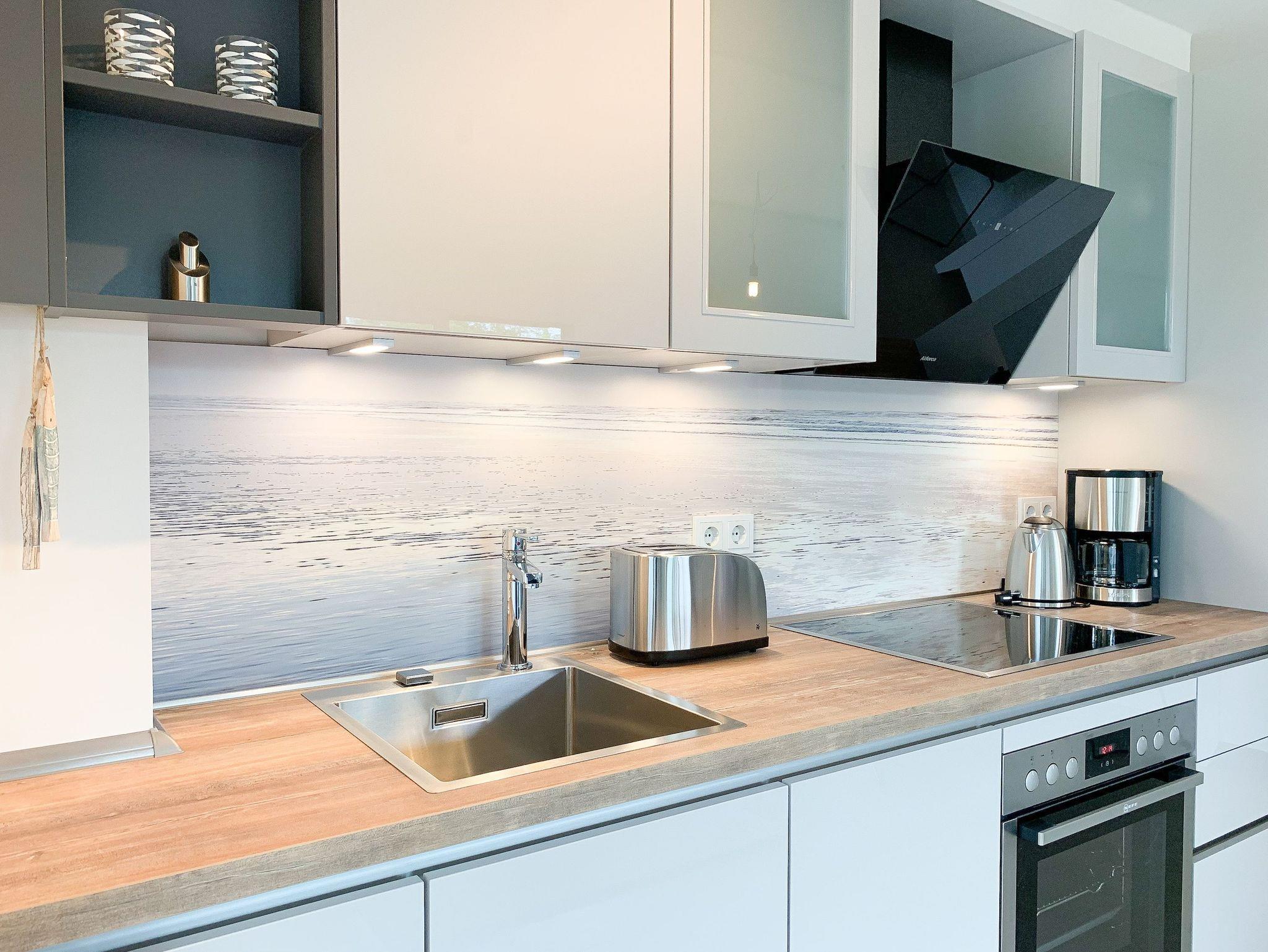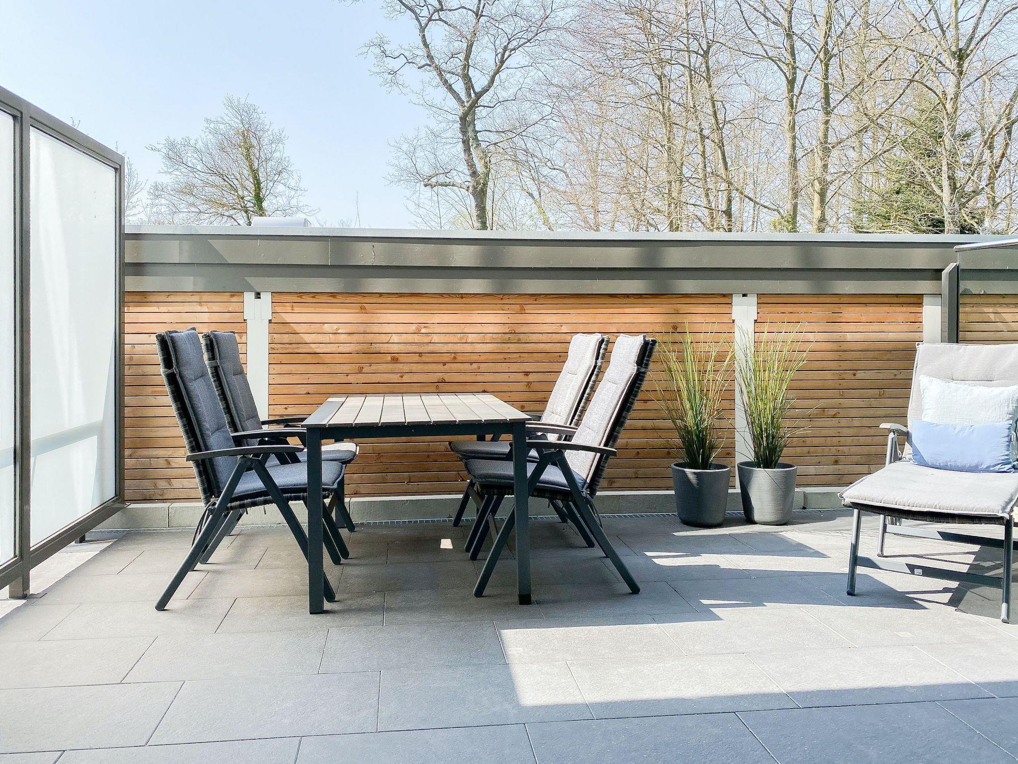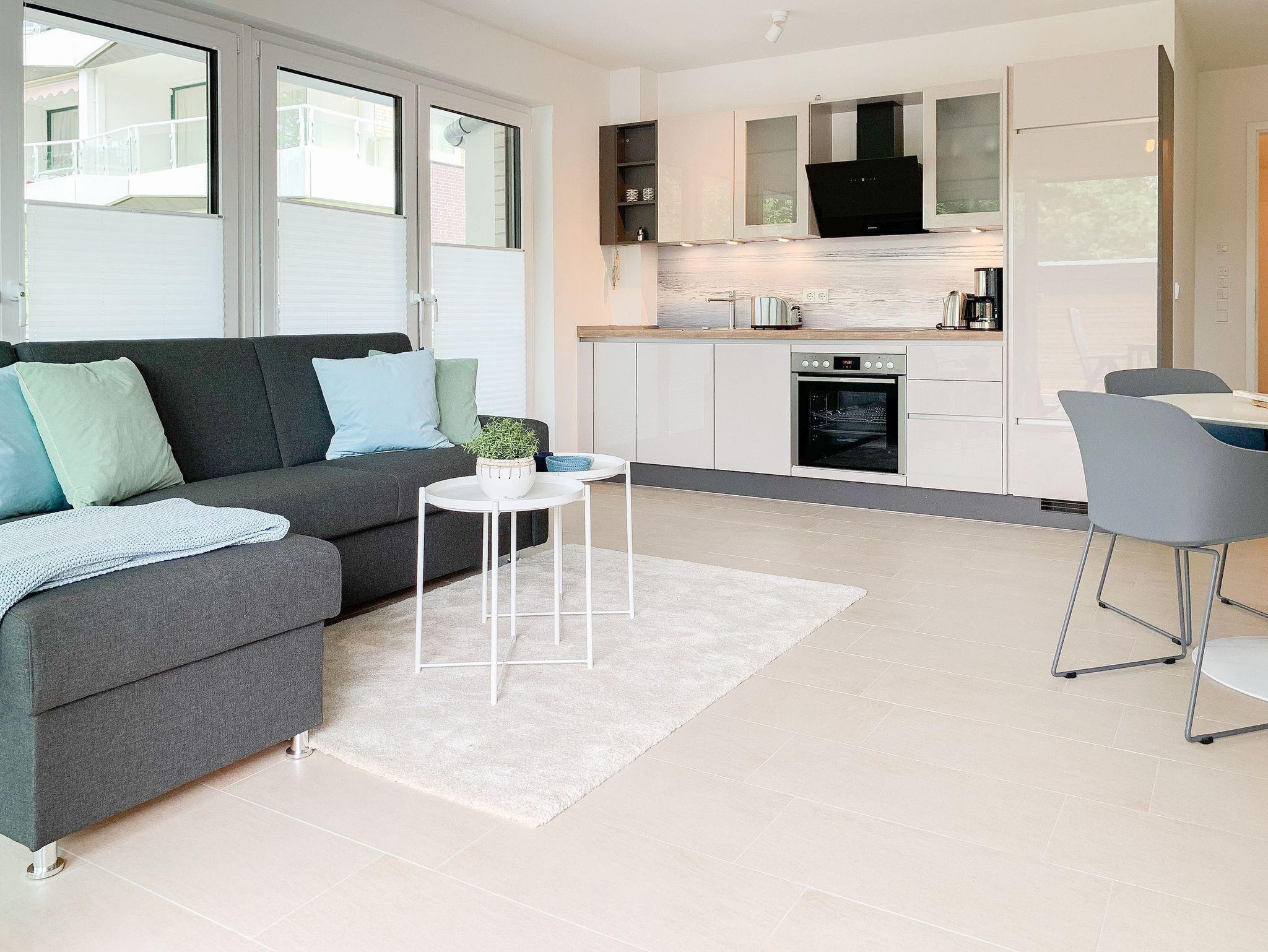 Die äußerst hochwertig eingerichtete und mit allen Annehmlichkeiten ausgestattete Wohnung bietet jeglichen Komfort für maximal 4 Personen, um einen entspannten Urlaub zu verleben. Helle Räumlichkeiten mit großen Fensterflächen, elektrischen Außenjalousien und Fußbodenheizung sorgen für ein zeitgemäßes Ambiente zum Wohlfühlen. Der Wohnbereich mit hochwertigem Sofa mit Schlaffunktion, die offene, bestens ausgestattete Küche sowie der anschließende Essbereich bilden den Mittelpunkt der Wohnung. Die großzügig angelegte Terrasse ist zum Südwesten ausgerichtet und mit Gartenmöbeln und Sonnenliege ausgestattet. Es steht ein großes Schlafzimmer mit Boxspringbett und TV sowie ein modernes Duschbad mit Walk In Dusche und integrierter Waschmaschine zur Verfügung.
