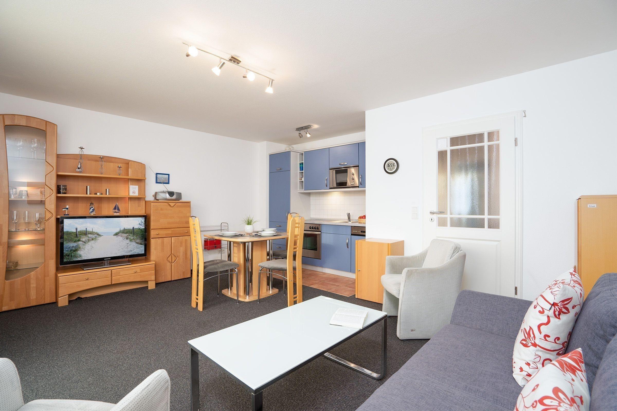 Das moderne 2-Zimmer-Appartement im Erdgeschoss bietet auf ca. 50 m² eine komfortable Unterkunft für 2 Erwachsene und max. ein Kind. Der lichtdurchflutete Wohnraum ist mit Teppichboden ausgelegt und beinhaltet ein umwandelbares Polstersofa, zwei Sessel, einen Couchtisch sowie einen Flachbild-TV. Die moderne, integrierte Einbauküche ist ausgestattet mit Geschirrspüler und Mikrowelle, während der Essplatz ausreichend Platz für alle Personen bietet. Das Schlafzimmer verfügt über ein Doppelbett, Nachttisch und einen großen Kleiderschrank. Das Bad ist mit einer Eckdusche, WC und Handtuchwärmer ausgestattet. Eine Garderobe befindet sich im Eingangsbereich. Die kostenfreie W-Lan-Nutzung erfolgt auf eigene Verantwortung. Rauchen und Tierhaltung sind in der Wohnung nicht gestattet. Ein PKW-Außenstellplatz ist inklusive.
