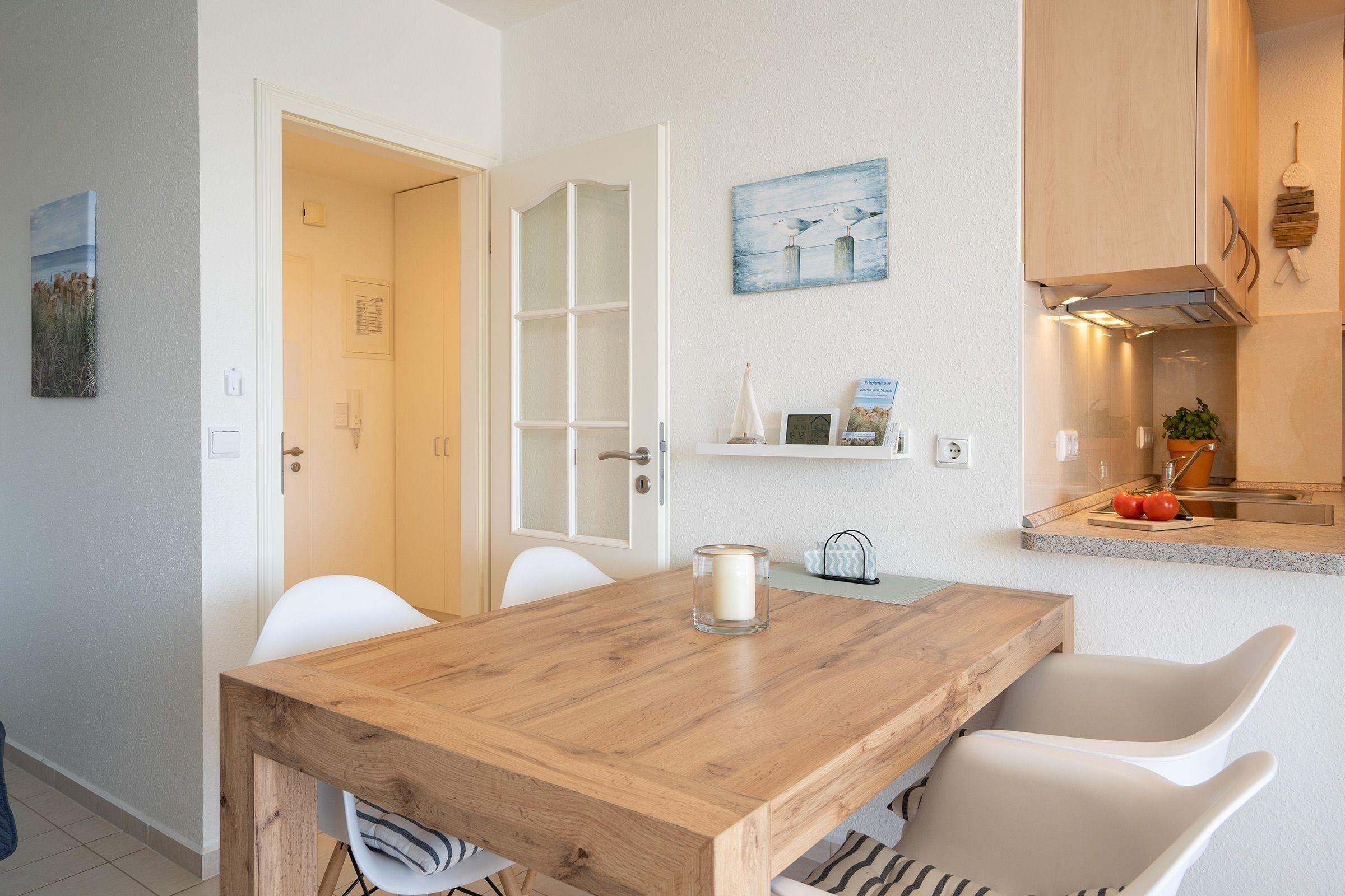 Das 2-Zimmer-Komfort-Appartement im 3. OG (mit Lift) bietet auf ca. 45 m² großzügigen Wohnraum. Es ist geschmackvoll renoviert und verfügt über einen hellen Wohnbereich mit Fliesenboden, einem einladenden Sofa sowie zwei Smart TVs und W-LAN. Die moderne Einbauküche ist vollständig ausgestattet, inklusive Geschirrspüler und Mikrowelle. Ein Boxspringbett (2x80x200 cm) im Wohnbereich sowie ein separates Schlafzimmer mit Doppelbett und Kleiderschrank bieten komfortable Schlafmöglichkeiten. Das Duschbad/WC ist mit einer ebenerdigen Duschkabine und einer Waschtischablage aus Granit ausgestattet. Garderobenschränke sorgen für ausreichend Stauraum. Waschmaschine und Trockner sind im Haus gegen Gebühr nutzbar. PKW-Stellplatz ist inklusive. In der Zeit vom 01.05. bis 10.09. steht ein kostenloser Strandkorb zur Verfügung. Die Nutzung des Außenschwimmbades ist saisonal vom 01.06. bis 15.09. möglich.
