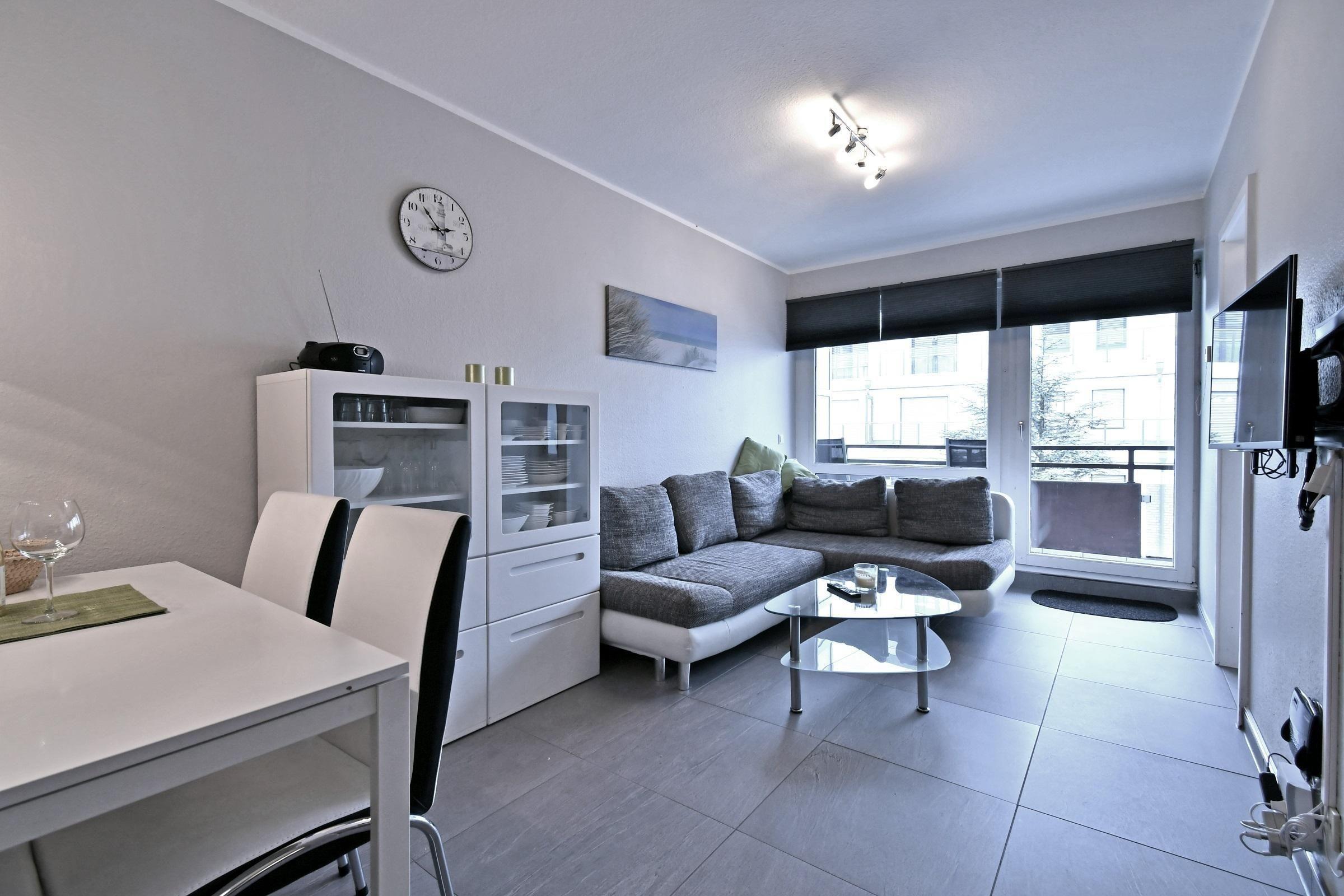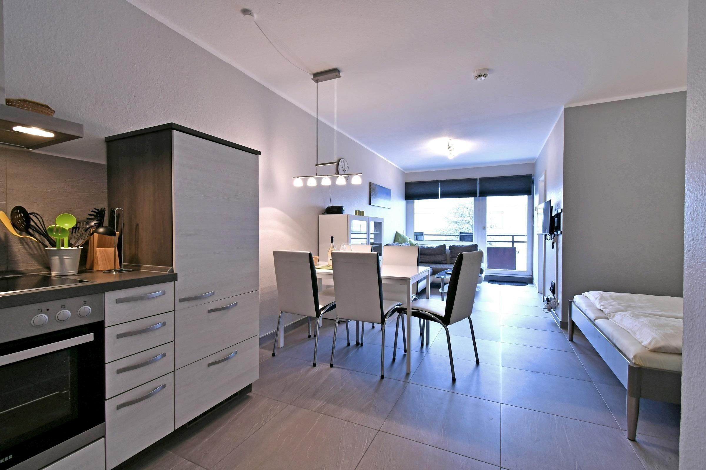 Der Wohnraum ist mit Polstersofa, Couchtisch und Flachbild-TV ausgestattet. In der angrenzenden Schlafnische befindet sich das Doppelbett. Es handelt sich um ein Boxspringbett mit dem Maß 1,60 x 2 m. Im separaten Schlafraum finden sich ein Etagenbett und ein Einzelbett sowie Flachbild-TV und Blue-Ray Player. Die offene, moderne Einbauküche ist mit Ceranfeld, Senseo Kaffeemaschine sowie eine Filtermaschine und Spülmaschine nebst angeschlossenem Essplatz sehr gut ausgestattet. Ein modernes Duschbad mit Runddusche, Waschtisch und WC runden das Appartement ab. WLAN ist inkl.