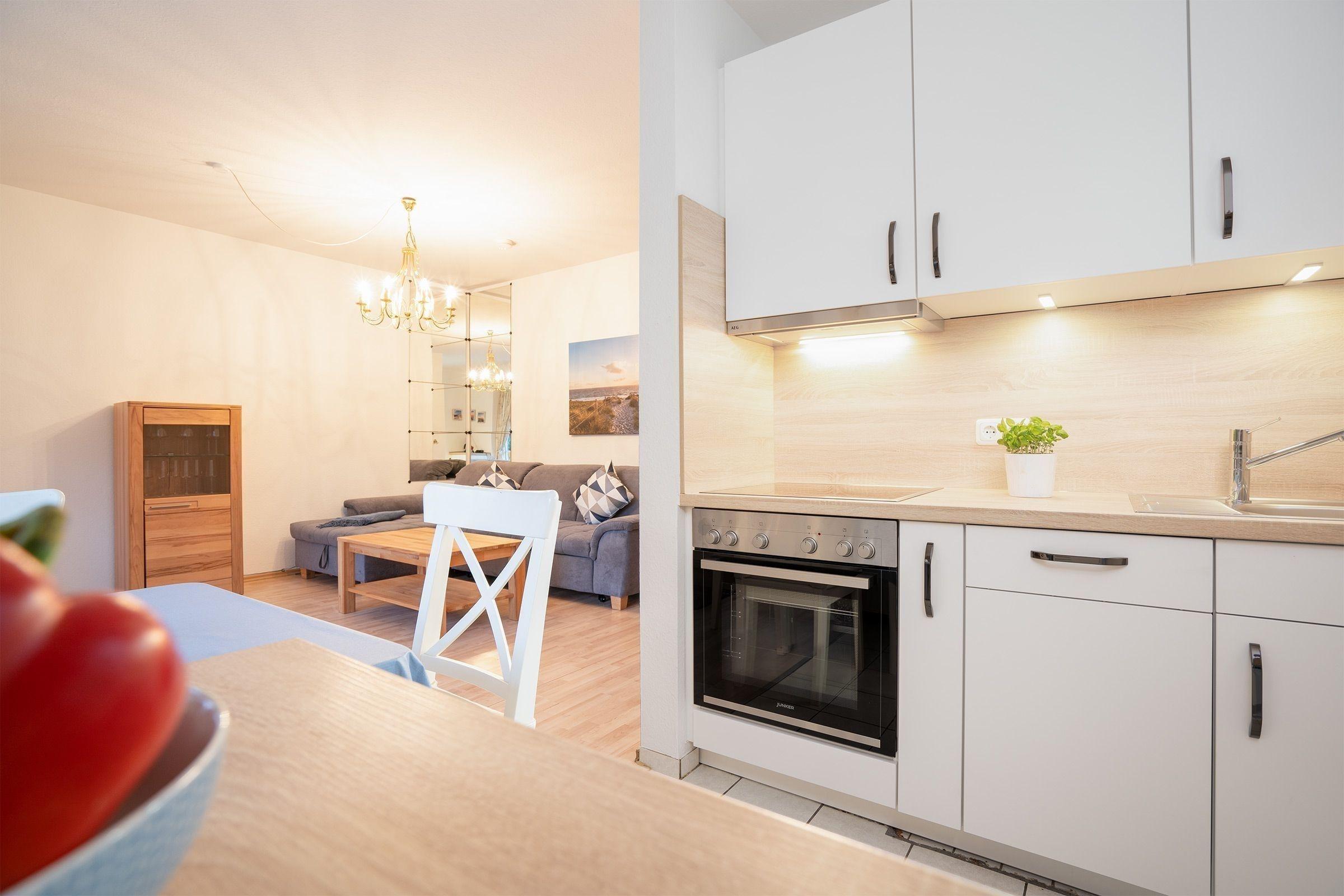 Die strandnahe Ferienwohnung bietet auf etwa 53 qm Platz für maximal 2 Erwachsene und 1 Kind. Der einladende Wohnraum ist mit einem Schlafsofa, Couchtisch und TV ausgestattet und schafft eine gemütliche Atmosphäre. Hier ist der Zugang zur sonnigen Terrasse, die durch Hecken geschützt ist. Die offene Küche verfügt über eine Komplettausstattung, einschließlich Geschirr, Backofen, Wasserkocher, Kaffeemaschine und Spülmaschine, sowie sämtlichen benötigten Kochutensilien. Das Schlafzimmer beinhaltet ein Doppelbett mit zwei getrennten Matratzen (je 0,80x2,00) und einen Kleiderschrank für ausreichend Stauraum. Das helle Badezimmer mit großen Fenstern enthält eine Dusche, einen Waschtisch und ein WC. Die Wohnung ist eine Nichtraucherwohnung, kleine Hunde sind auf Anfrage erlaubt. Ein kostenloser PKW-Stellplatz befindet sich direkt am Haus.