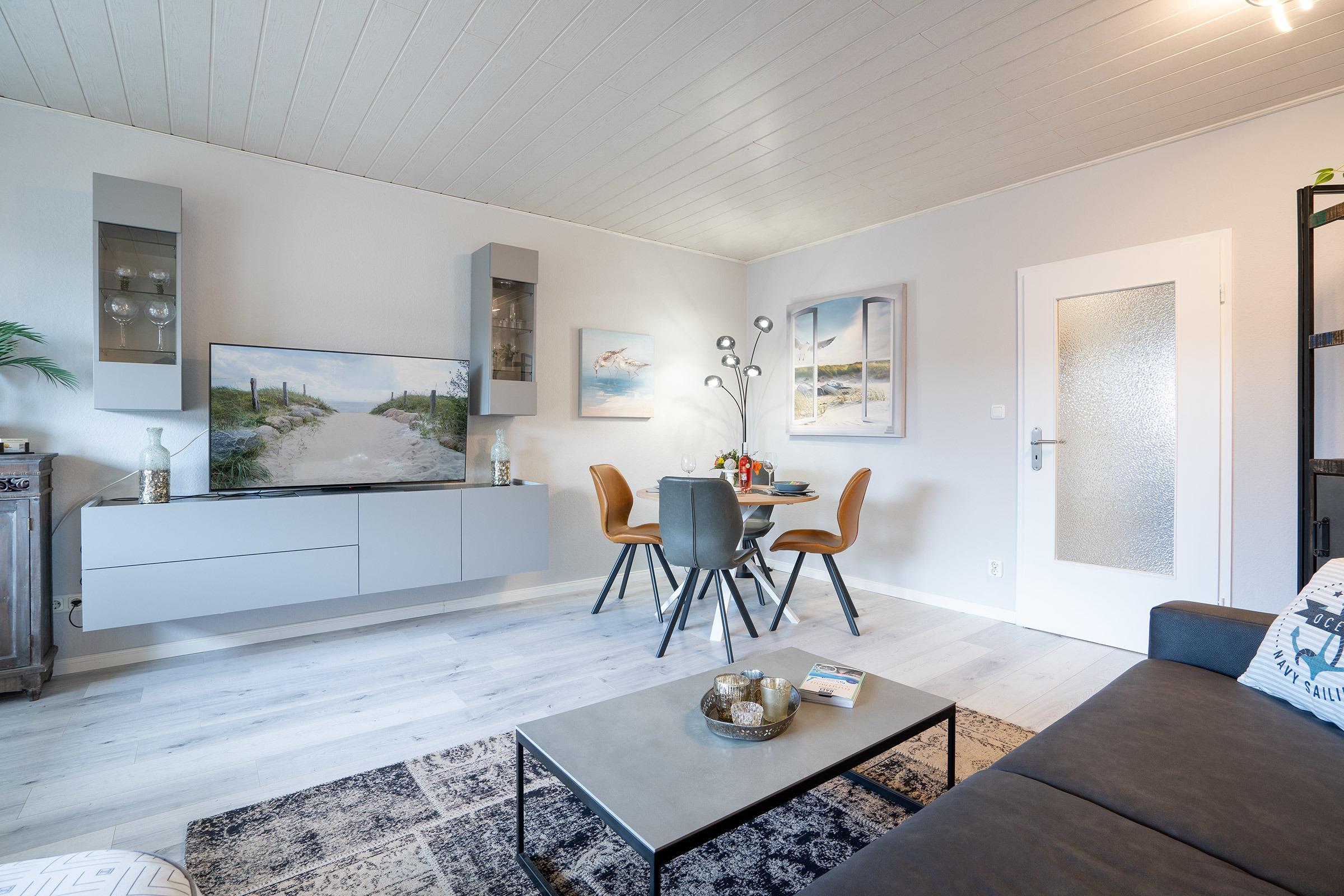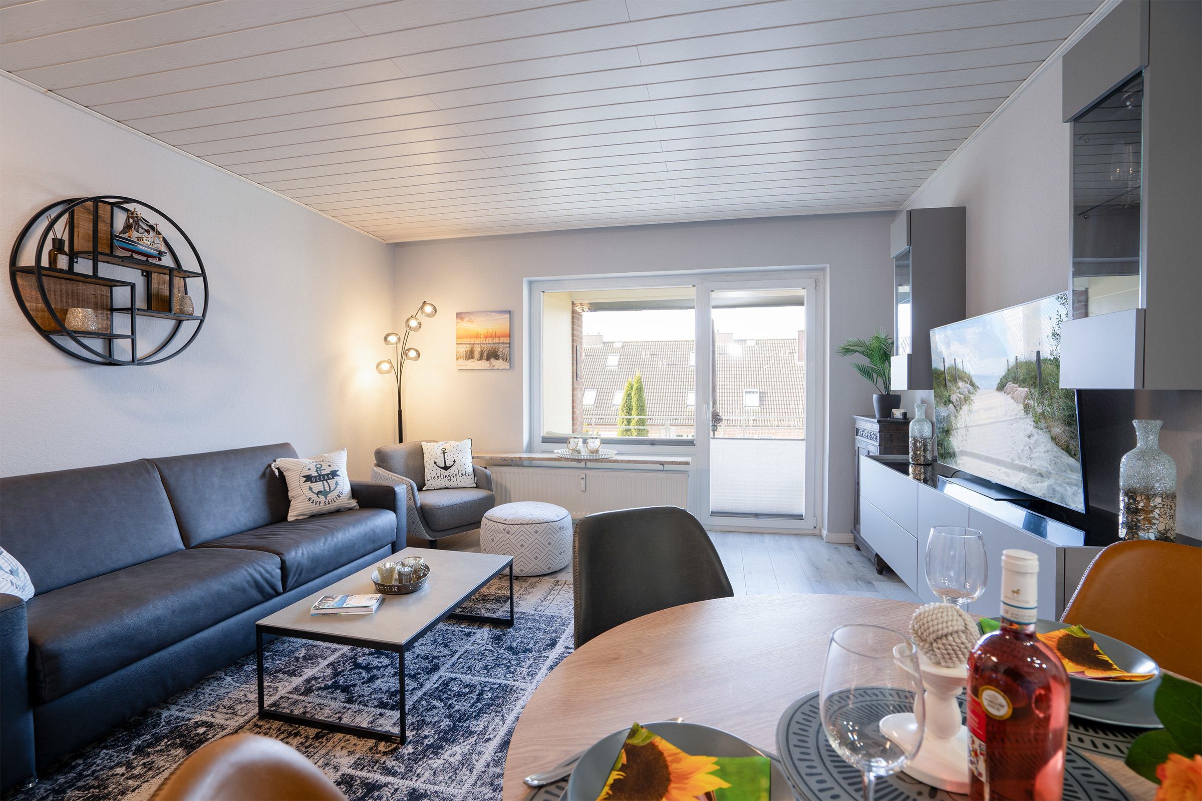 - Wohnbereich: Ein behagliches Wohnzimmer mit einem Ledersofa, Fernseher und Zugang zu einem kleinen Balkon.