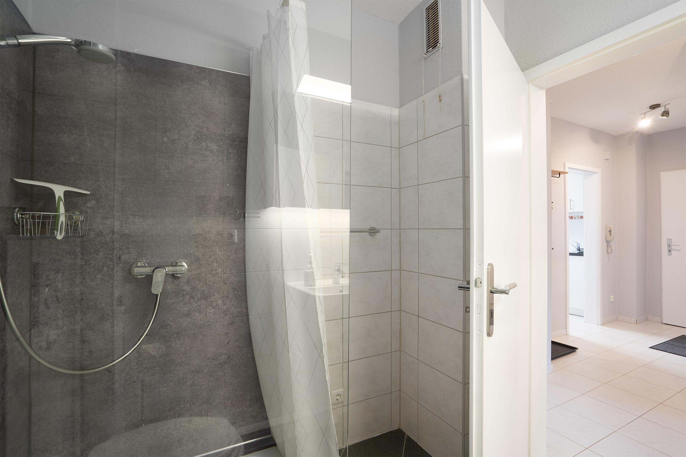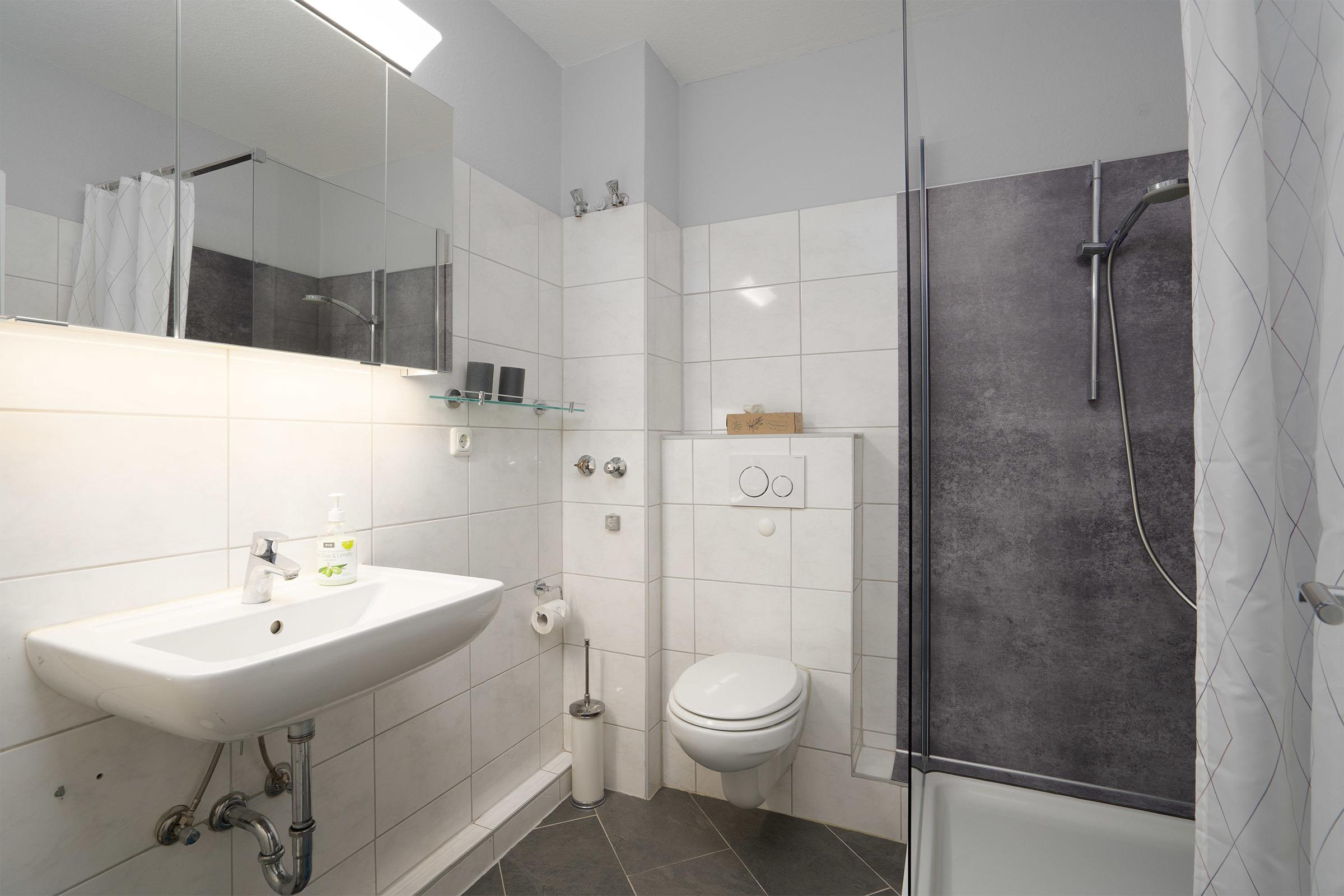 - Badezimmer: Bad mit Dusche, WC und Waschbecken, ein Fön ist ebenfalls vorhanden.