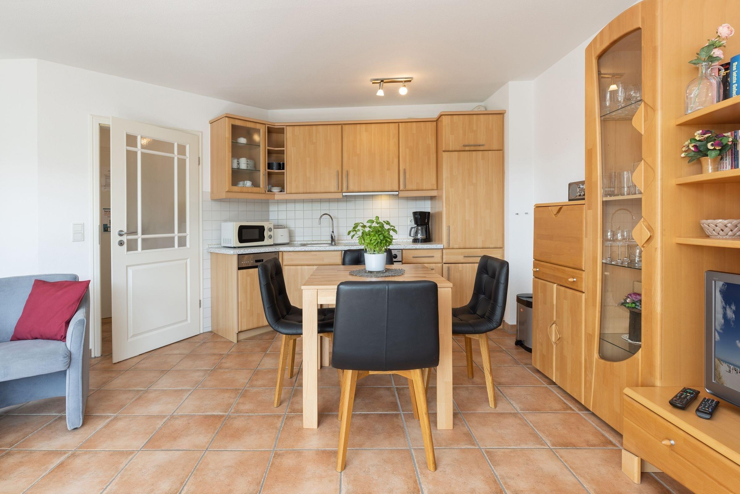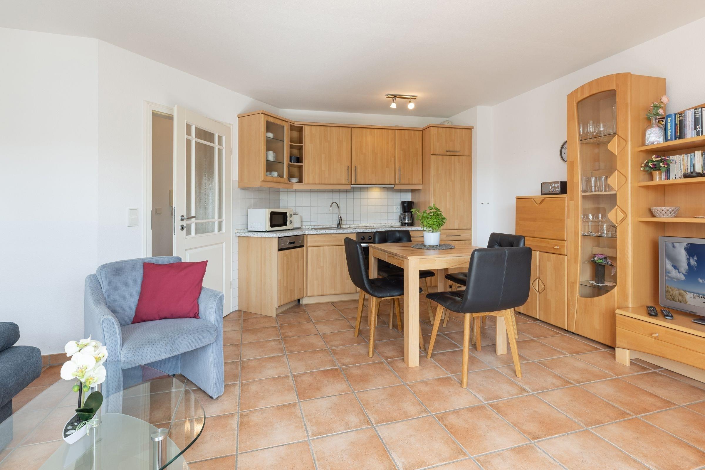 Das Wohnzimmer mit angrenzender voll ausgestatteter Wohnküche, ist mit einer gemütlichen Couch, einem großen Lesesessel mit Fußhocker, sowie einem Essplatz ausgestattet und lädt zum Verweilen, Ausspannen, Kochen und Genießen ein. Von hier haben Sie sogar einen kleinen Blick auf die schöne Ostsee. Genießen Sie zahlreiche Sonnenstunden auf dem großzügigen Balkon, die elektrische Markise spendet bei Bedarf ausreichend Schatten.