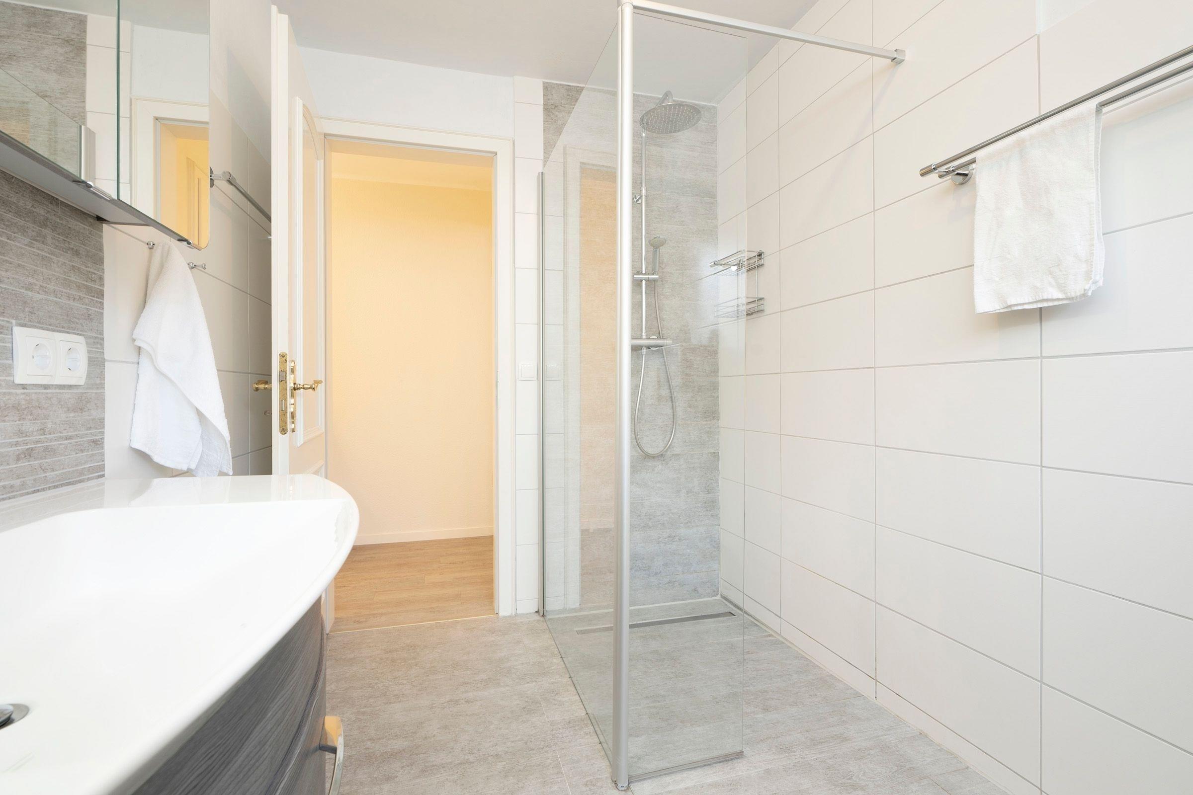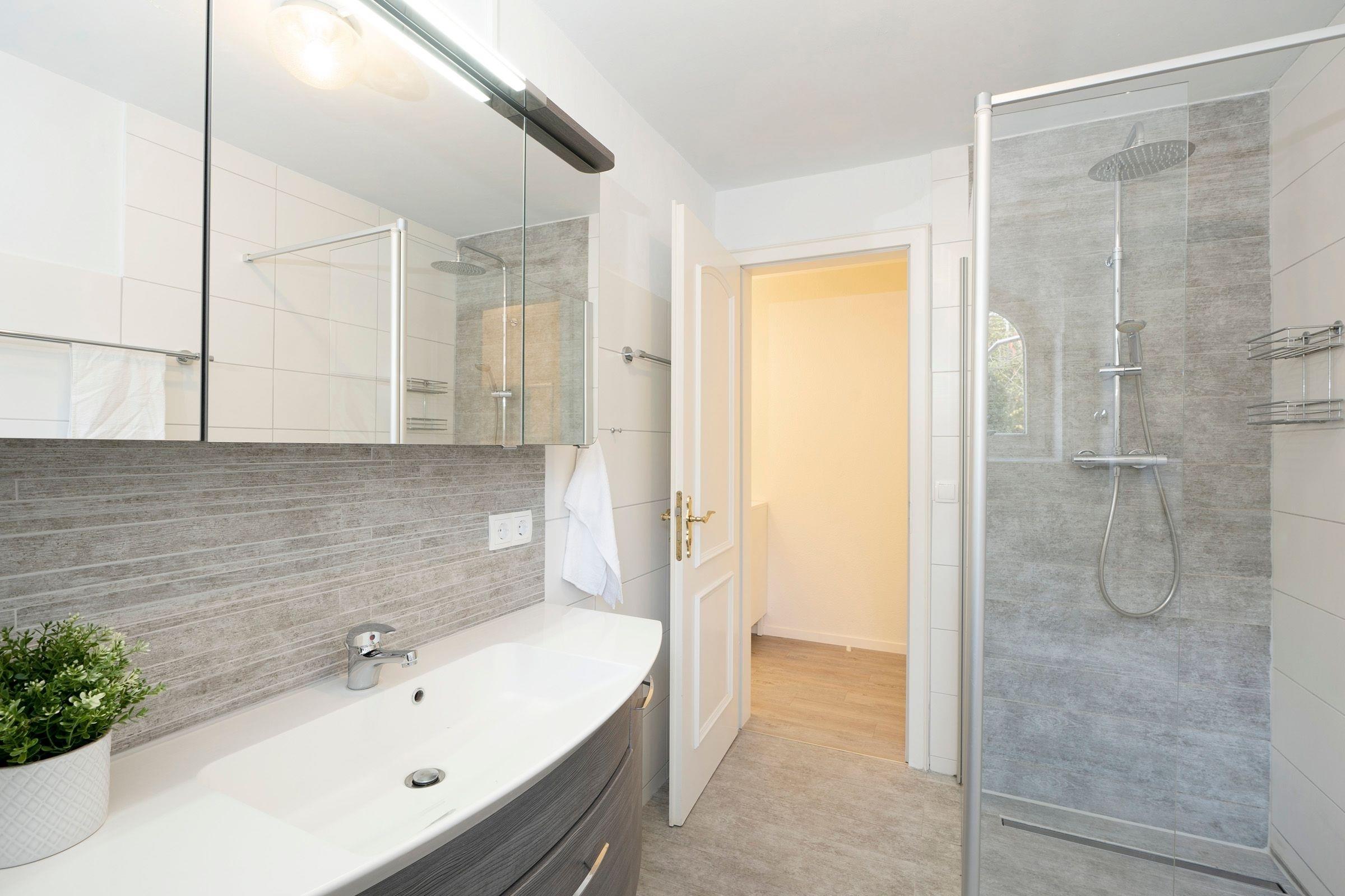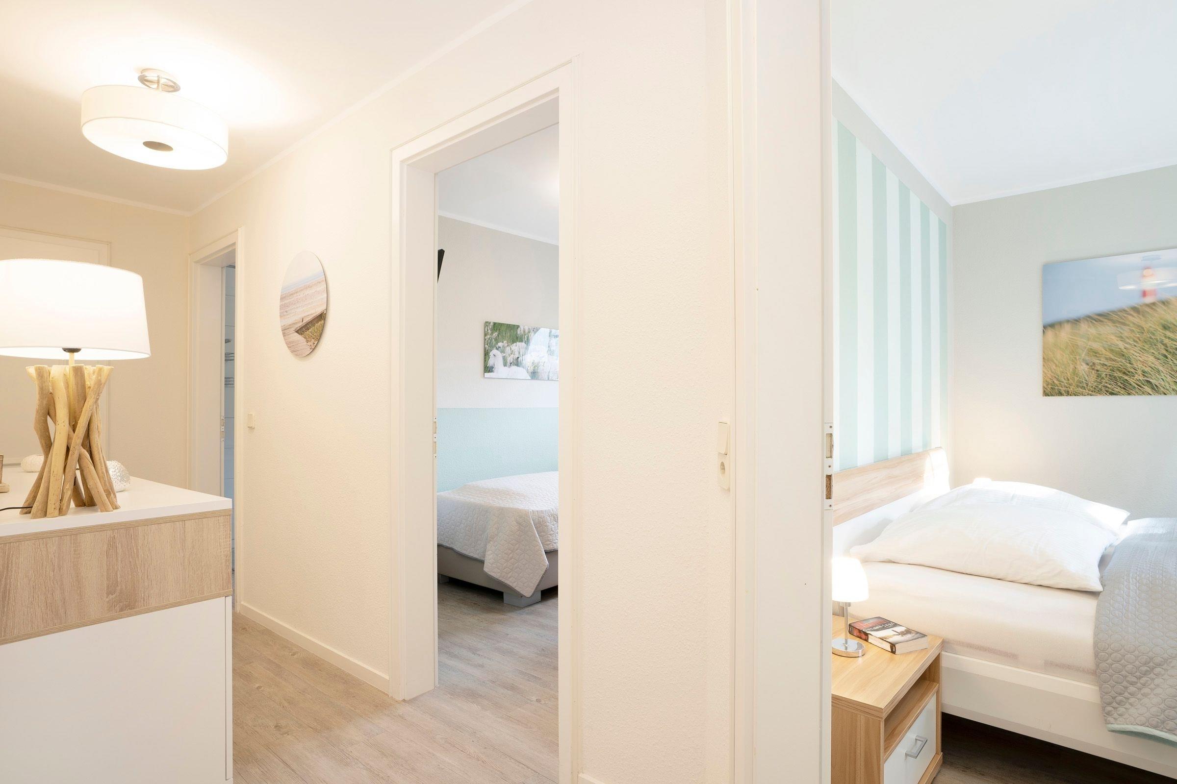 Die obere Ebene umfasst ein Wohnzimmer mit einer Schlafcouch (ca. 160x195 cm) für zwei Personen sowie einer gut ausgestatteten Küchenzeile mit einem Essbereich. Hier finden Sie auch ein Gäste-WC. Über eine Wendeltreppe gelangen Sie in die untere Ebene. Dort gibt es zwei Schlafzimmer: Ein Schlafzimmer mit einem Doppelbett (2x 90x200 cm) und ein Schlafzimmer mit zwei einzelnen Boxspringbetten (je 90x200 cm) und zweitem TV-Gerät. Hier finden Sie auch ein modernes Duschbad mit Fenster. Die Wohnung verfügt über einen Balkon und eine Terrasse.