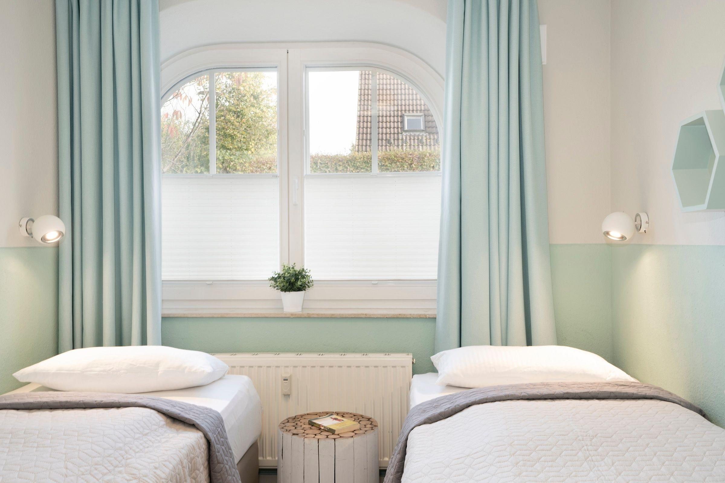 Schlafzimmer 2: 2 Einzel-Boxspringbetten (2x 90x200 cm), Verdunkelung (Vorhänge, Plissees)