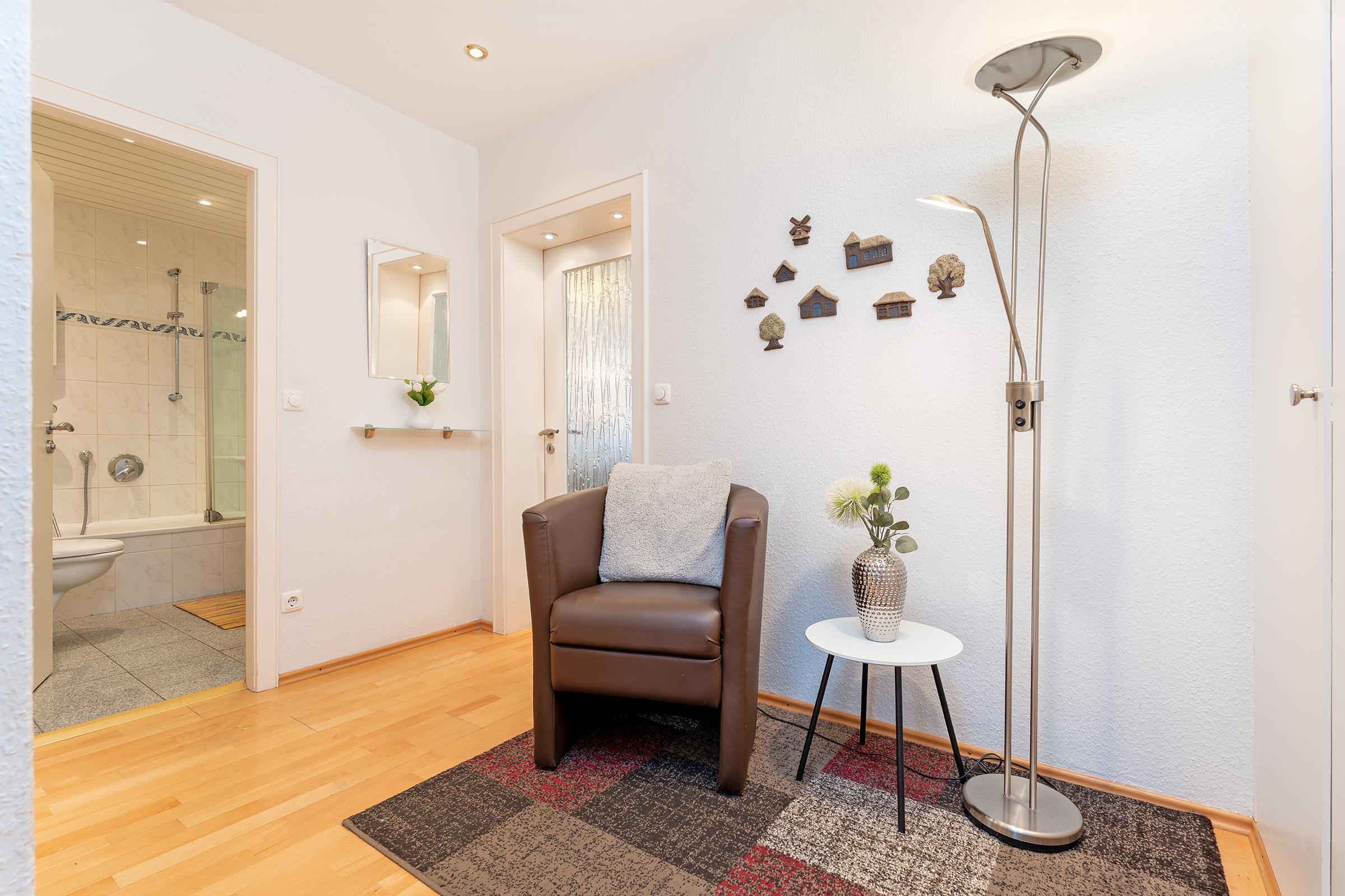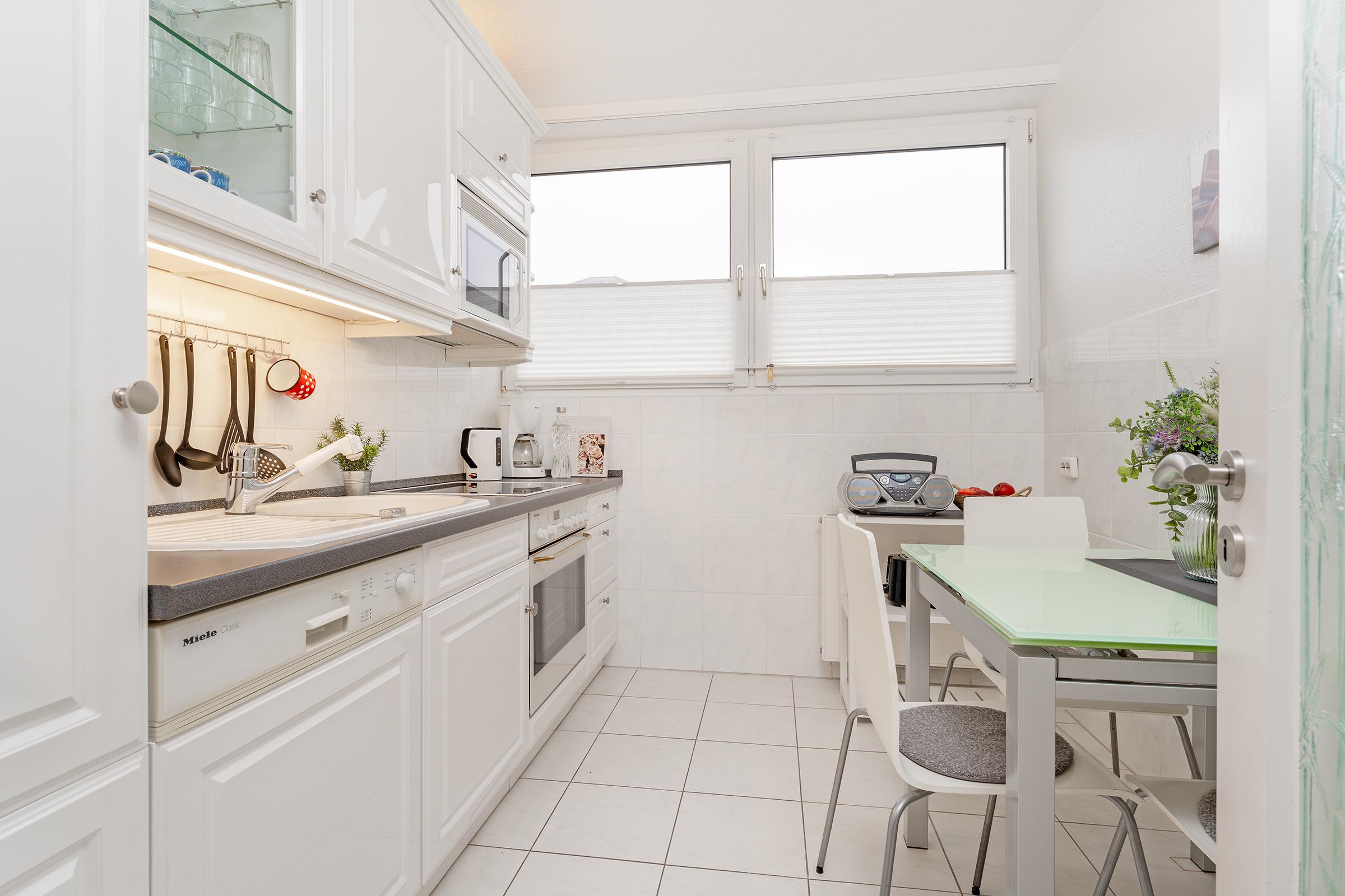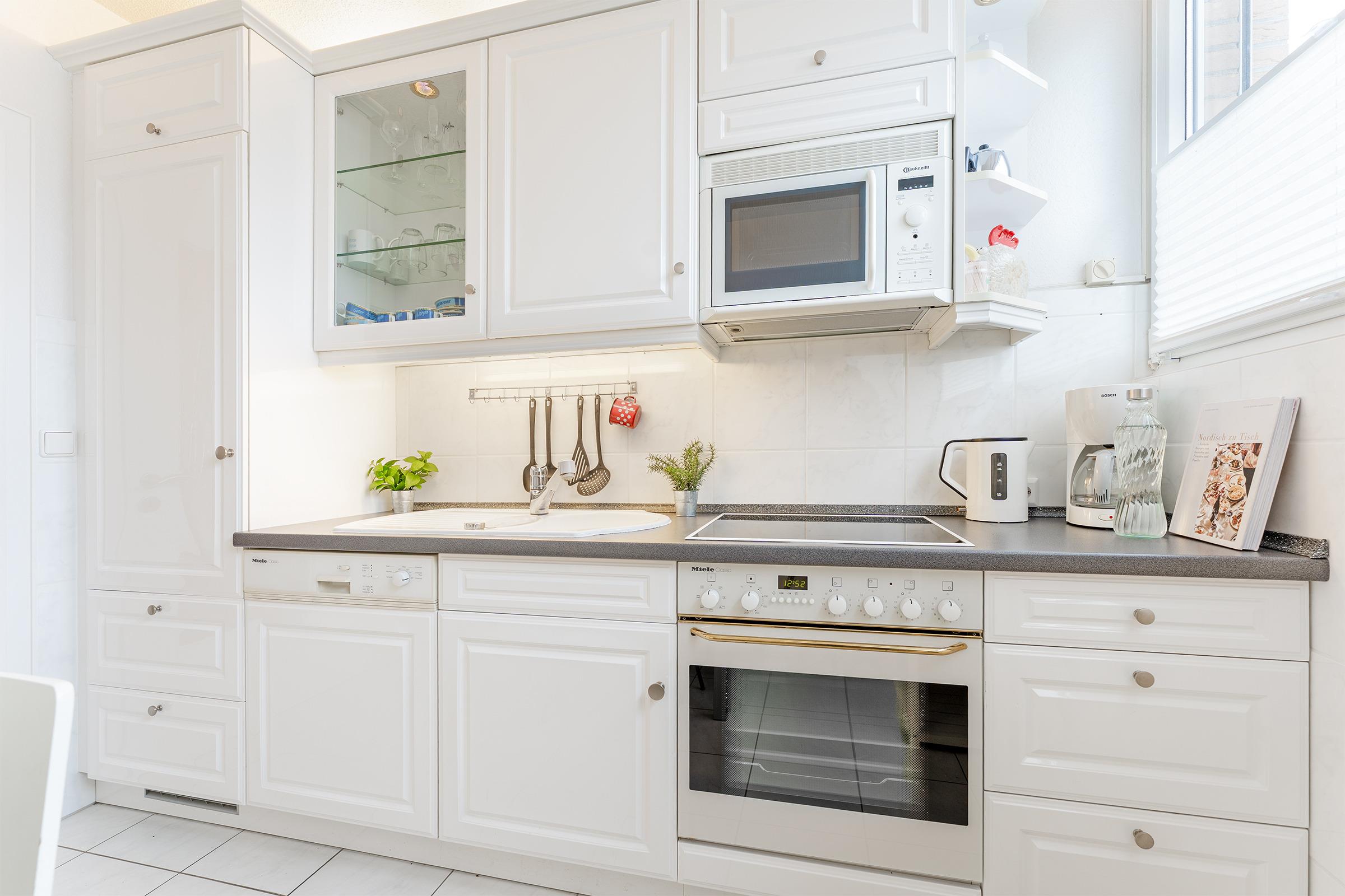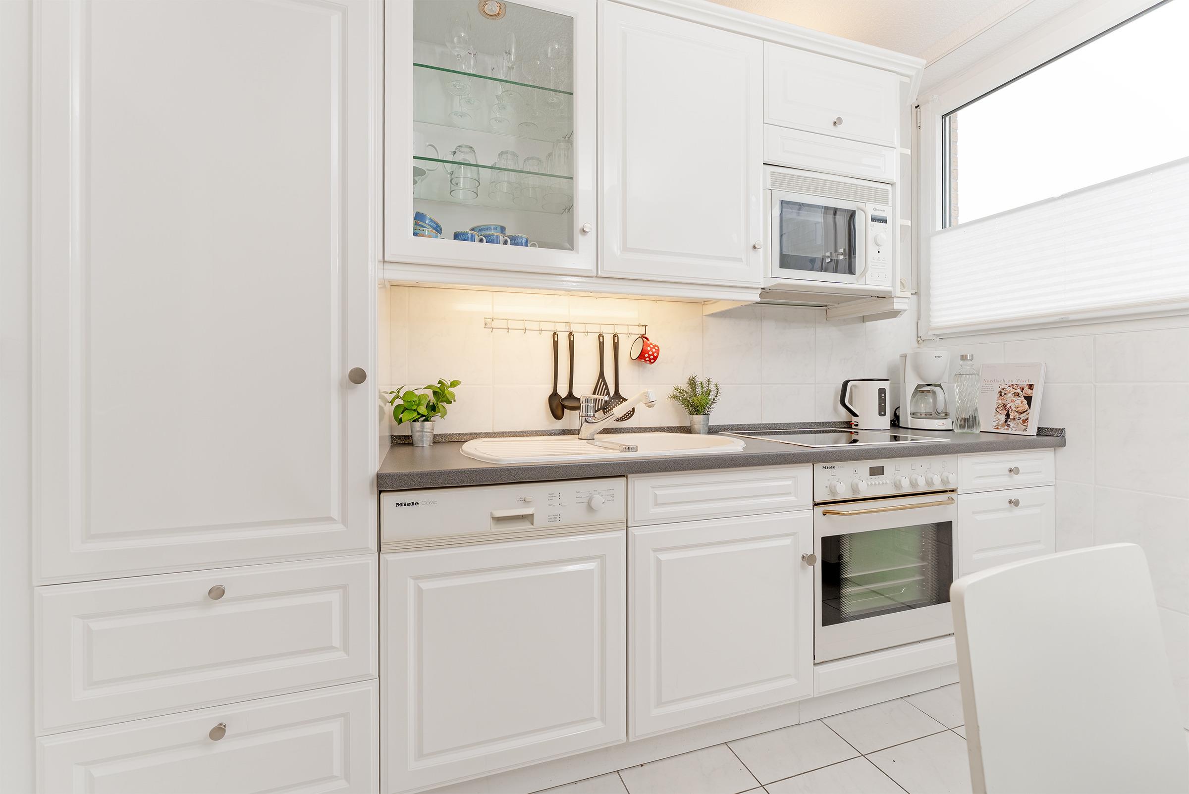 Betreten Sie durch einen geschmackvollen Flur das Wohnzimmer mit Sofalandschaft, großem Flach-TV inkl. Blu-Ray-Player und verleben Sie hier gemütliche Stunden mit der Familie. Über einen kostenfreien WLAN-Anschluss bleiben Sie mit Ihren Liebsten in Kontakt. Lauschen Sie dem Rauschen der Ostseewellen vom möblierten Balkon mit seitlichem Meerblick bei einem Glas Wein. In der hellen separaten Küche können Sie am Esstisch mit 3 Sitzplätzen schmackhafte Leckereien genießen. Ceranfeld mit Backofen, Spülmaschine, Mikrowelle, Kühlschrank mit Gefrierfach, Kaffeemaschine, Eierkocher, Toaster und Wasserkocher - die Küche ist voll ausgestattet und bietet dem Hobbykoch jeglichen Komfort. Im Schlafzimmer finden Sie ein Doppelbett (2x 90x200 cm) und ein Einzelbett (80x190 cm) für die dritte Person. Im hell gefliesten Vollbad mit Duschfunktion können Sie nach einem Strandtag die letzten Sandkörner beseitigen.