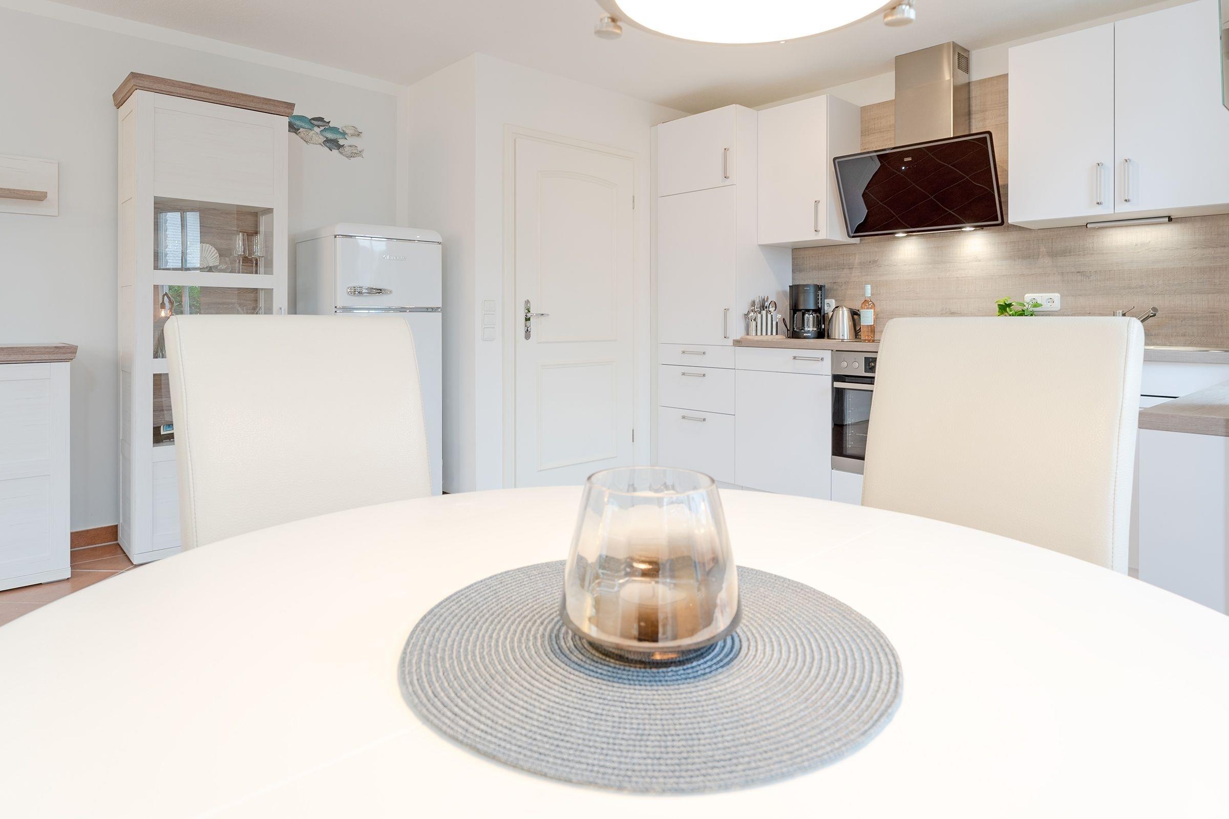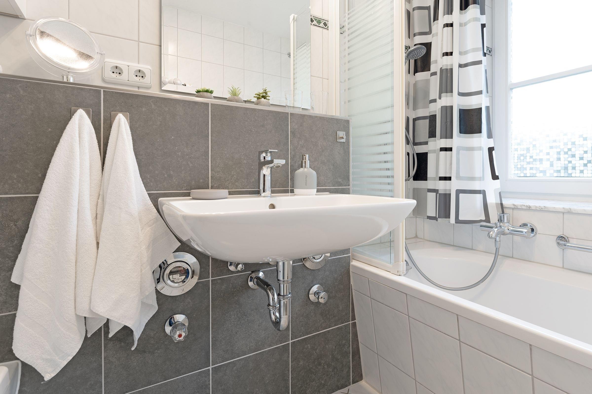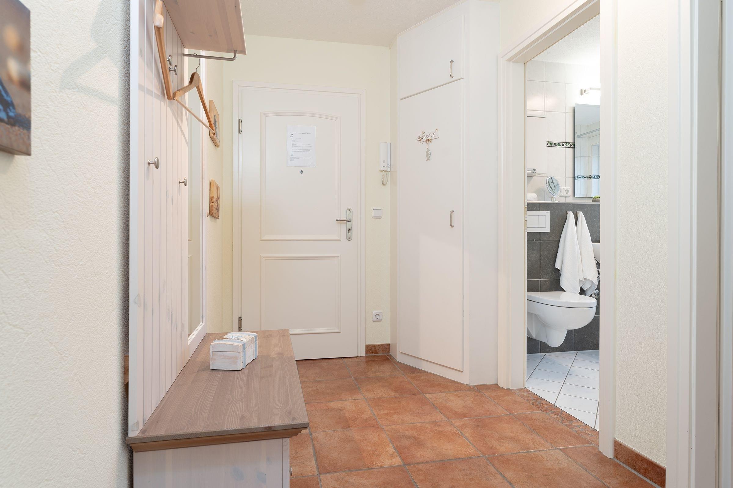 Vom geräumigen Flur aus gelangen Sie in den hell gestalteten Wohnraum mit offener Küchenzeile. Ihre Mahlzeiten können Sie, je nach Jahreszeit, am Esstisch oder wunderbar auf einer der beiden geschützten Terrassen einnehmen. Beide Terrassen sind möbliert und bieten durch elektrische Markisen ausreichend Sonnenschutz. Herrlich entspannen lässt es sich auf der kuscheligen Couch vor dem Fernseher. Das Schlafzimmer ist mit einem gemütlichen Doppelbett (2x 90x200 cm) ausgestattet, im Kleiderschrank können Sie prima Ihre Urlaubsgarderobe verstauen. Durch elektrische Außenrolladen lässt sich das Schlafzimmer angenehm verdunkeln. Das große tageslichthelle Badezimmer mit Badewanne und Duschsystem rundet die schöne Ferienwohnung ab.