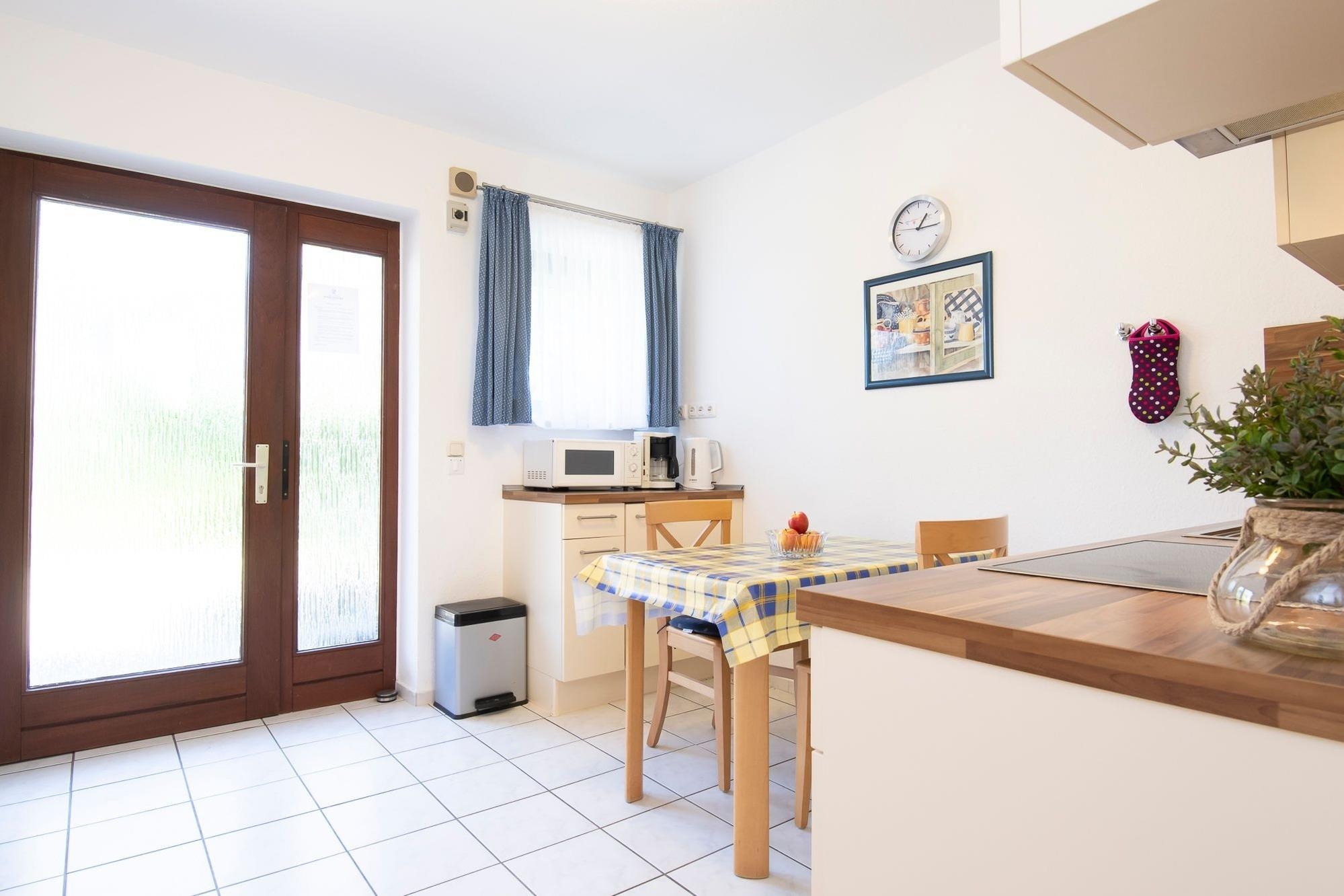 Machen Sie es sich in den samtigen Sesseln bequem und genießen Sie die Abende bei guten Gesprächen oder dem TV-Programm. Anschließend können Sie nach einem ereignisreichen Tag in einem gemütlichen Doppelbett (140x200 cm) entspannen. Dank offener Küchenzeile mit einladendem Essplatz entscheiden Sie selbst, ob Sie lieber selber kochen, oder das umfangreiche gastronomische Angebot unserer Region nutzen wollen. Stoßen Sie auf der eigenen, möblierten Terrasse mit einem guten Glas Wein auf Ihren Urlaub an. Ein modernes, hell gefliestes Duschbad rundet die schöne Ausstattung dieser Ferienunterkunft ab.