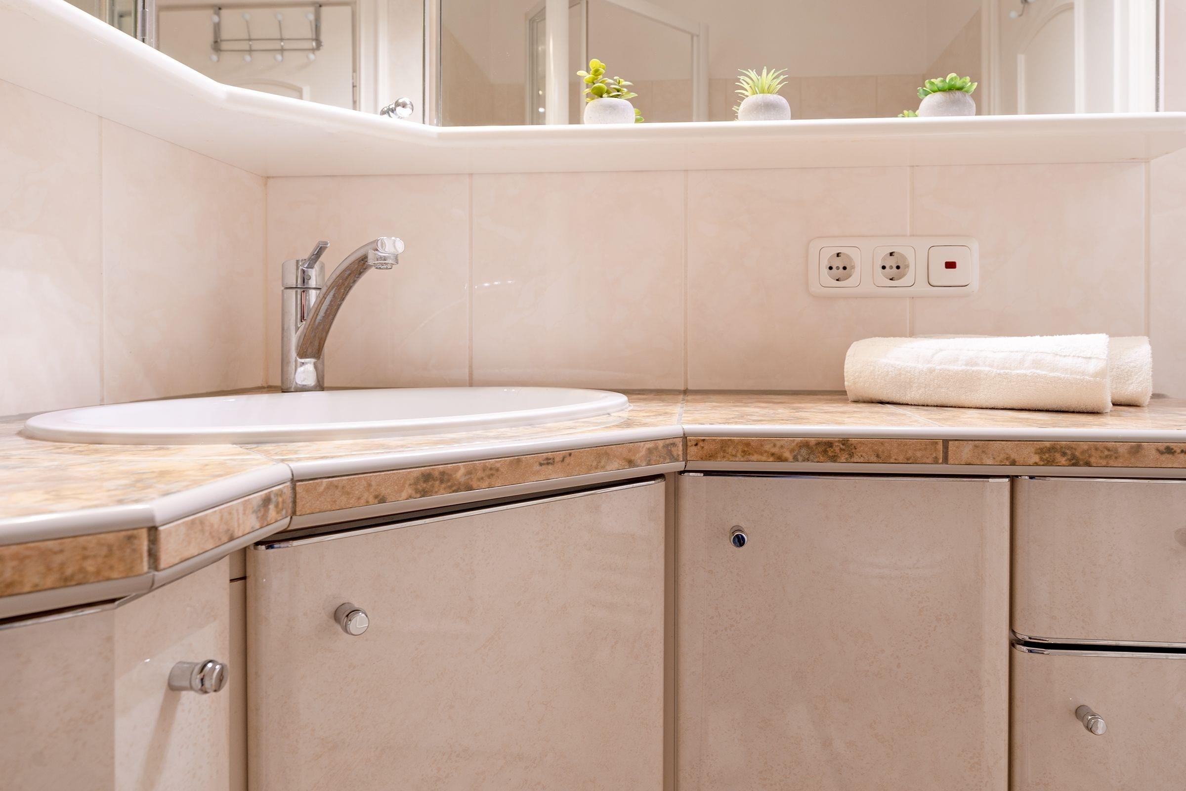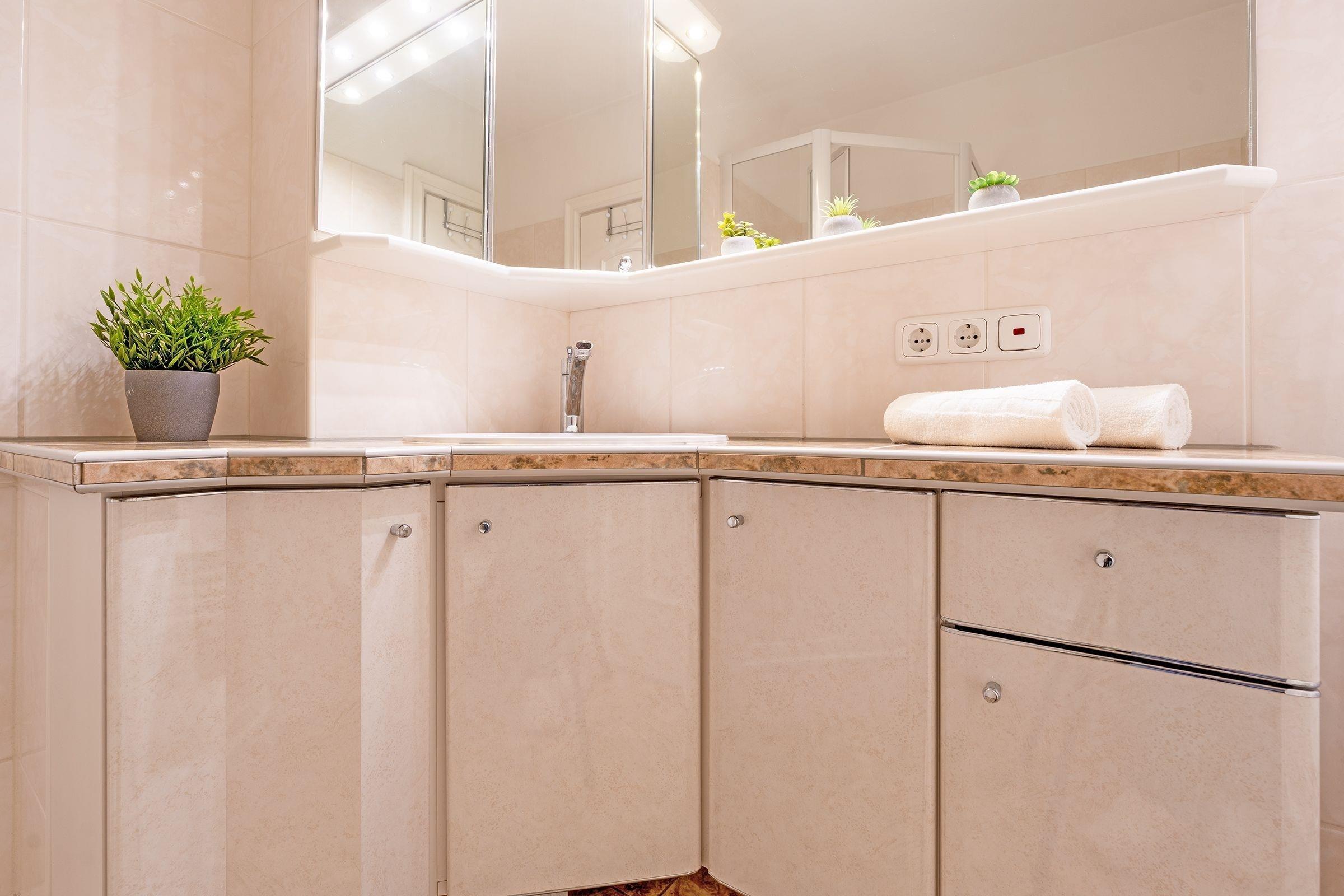 Rechterhand das kleine Duschbad mit WC und Handtuchheizung, das durch seine Marmorfliesen eine besondere Ausstrahlung hat. Ein Einbauschrank mit einer Spiegeltür bietet genügend Stauraum für Ihre Badutensilien. Links neben dem Bad befindet sich das Schlafzimmer mit einem Doppelbett (2x 90x200 cm) einem 3-flügligen Kleiderschrank und direktem Zugang auf den Balkon. Vom Schlafzimmer gelangen Sie über den Flur in den Wohn-Essbereich mit offener gut ausgestatteter Einbauküche und hochwertigen Elektrogeräten. Das Sofa mit Schlaffunktion (Liegefläche 140x200 cm) bietet eine zusätzliche Schlafmöglichkeit. Zur Ausstattung gehört ein Flat-TV, eine HiFi-Anlage mit CD-Player und Radio und ein Zugang zum WLAN-Netz. Der nach Nord-West ausgerichtete große Balkon mit seitlichem Meerblick, den man ebenfalls vom Wohnbereich erreicht, lädt dazu ein, die Abende in gemütlicher Atmosphäre ausklingen zu lassen.