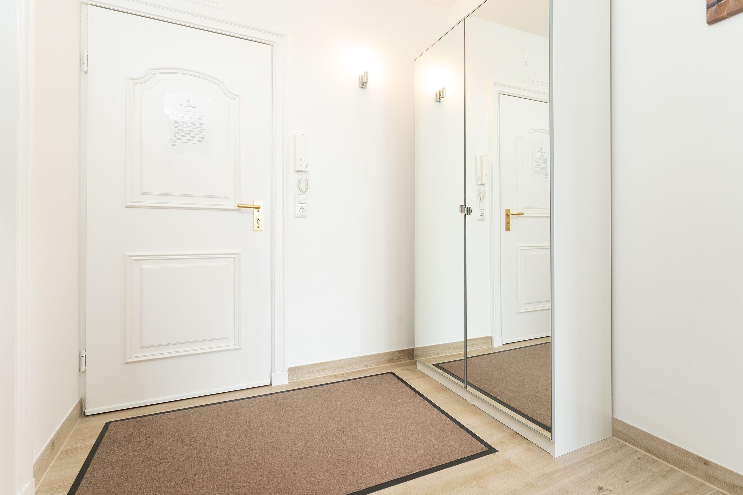 Über den barrierefreien Eingang des Hauses Meeresstrand gelangen Sie mit dem Fahrstuhl zu Ihrer Ferienwohnung. Beim Betreten der Wohnung besticht der Fußbodenbelag aus hochglänzendem Feinsteinzeug. Über einen kleinen Flur mit Garderobenschrank und großen Spiegeltüren betreten Sie die Wohnung. Alle Zimmer sind vom Flur erreichbar.