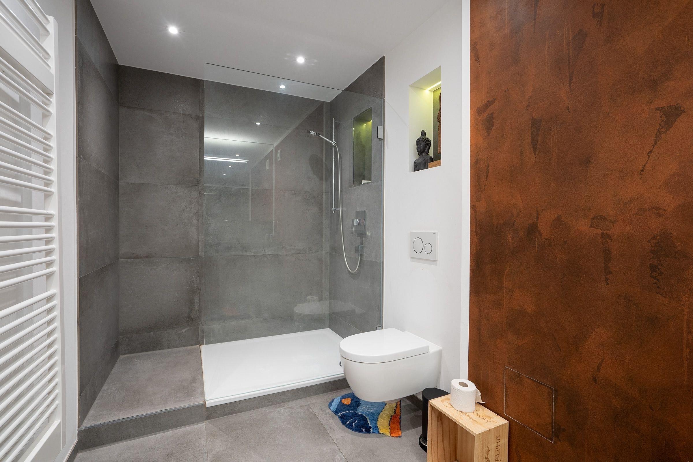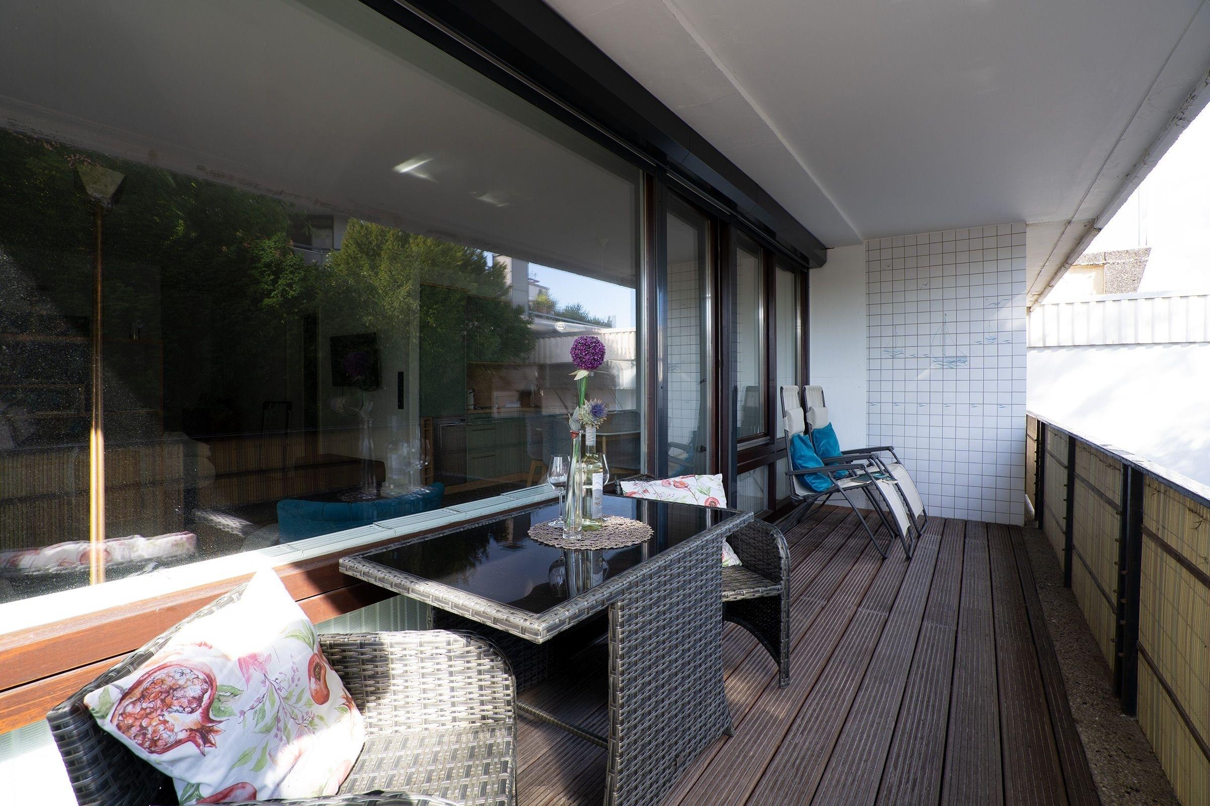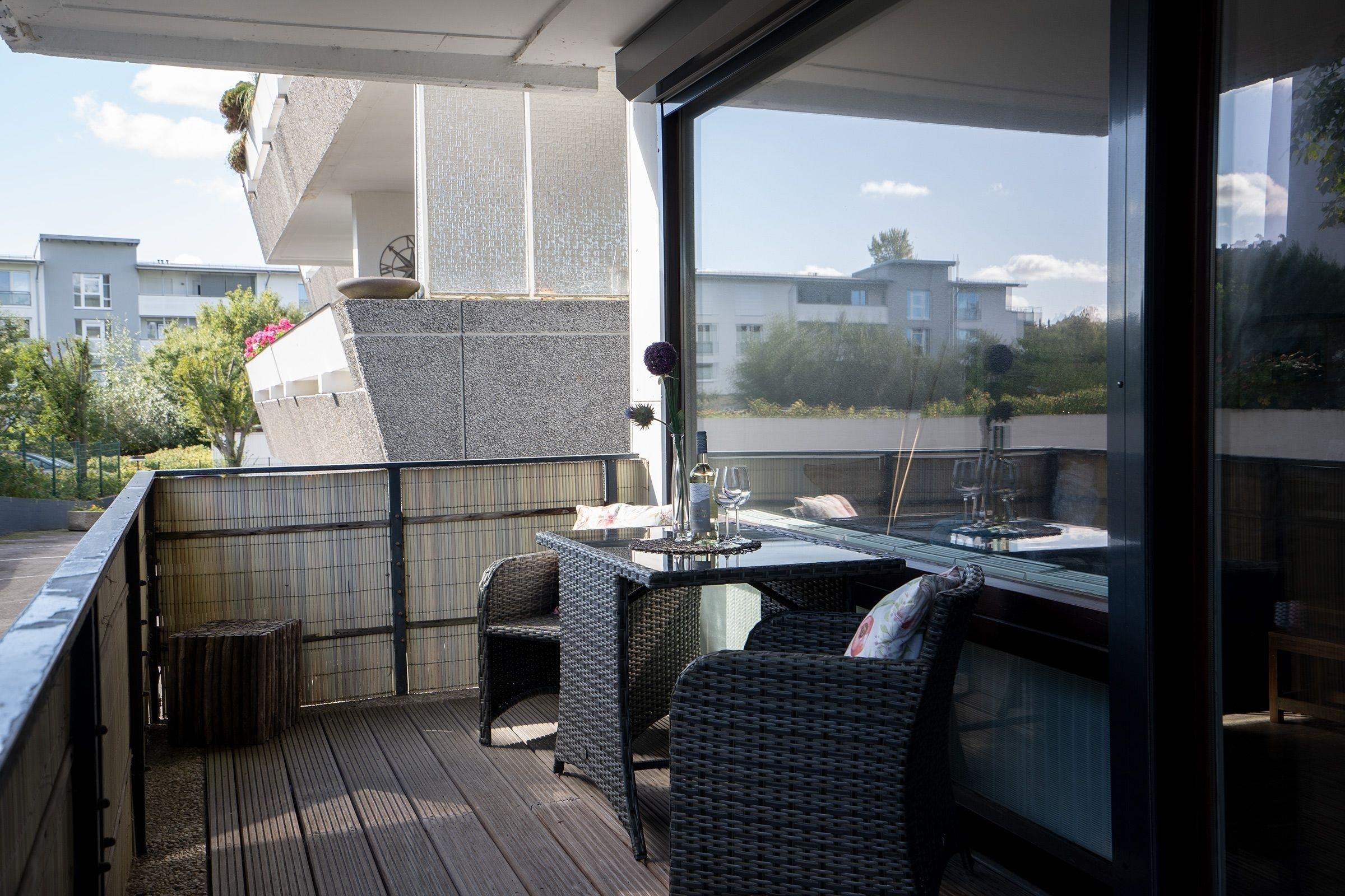 Die Küche ist unter anderem mit Mikrowelle, 4-Platten Cerankochfeld, Nespresso Kaffeemaschine, Weinregal und moderner Siemens Geschirrspülmaschine vollständig ausgestattet. Ein Esstisch bietet Platz für 4 Personen. Freunde der modernen Badkultur kommen auf Ihre Kosten: Ein Highlight der Ferienwohnung ist das luxuriöse große Bad. Es besticht durch seine Natursteinplatten an Wand und Boden sowie der "Walk- In" Dusche mit großer Glasfront und dem in einer Marmorplatte versenktem Waschtisch. Ablagemöglichkeit ist auch hier ausreichend vorhanden. Kennen Sie das Gefühl, nachts raus zu müssen und Sie laufen in ein grell beleuchtetes Bad? Nicht hier, denn ein durchdachtes Lichtsystem einschließlich kleinem blauen Nachtlicht bietet ein besonderes Badambiente. Der Balkon ist 10m² groß und bietet genügend Platz für Tisch nebst Stühlen sowie eine Sonnenliege. Durch die Ausrichtung nach Südwesten bietet er einen Blick ins Grüne. Technisch ist die Wohnung auf dem neuesten Stand. Für einen erholsamen Schlaf können Sie die große Fensterfront durch drei separate elektrische Rollladen nach Ihren Wünschen verdunkeln. High-Speed WLAN ist hier selbstverständlich.