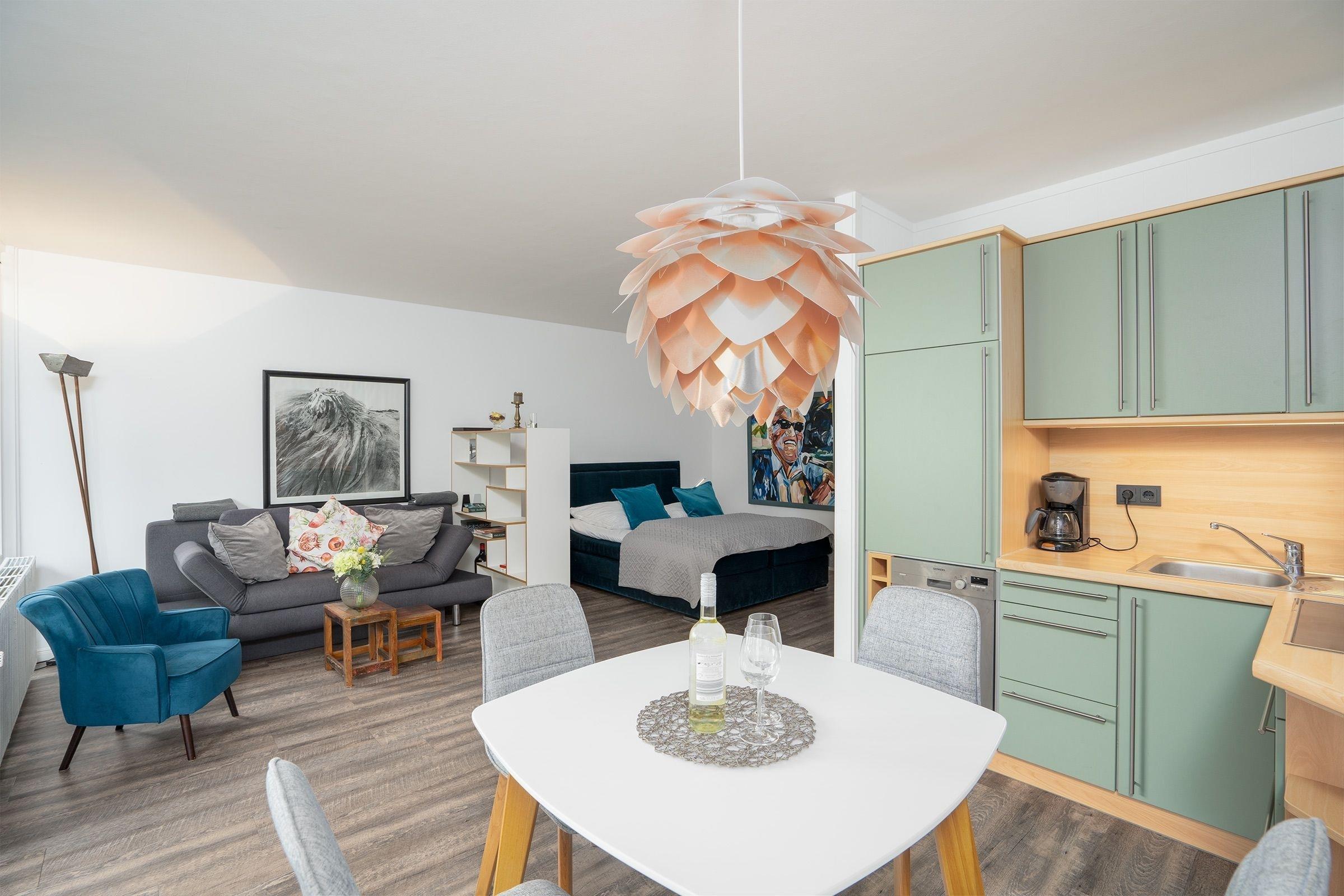 Möchten Sie modern wie in einer Hotelsuite wohnen aber auf die Größe einer Ferienwohnung nicht verzichten? Dann sind Sie hier richtig! Die Wohnung besteht aus einem großen Wohn- und Schlafbereich (ineinander übergehend) und bietet mit einer Wohnfläche von ca. 53 m² Platz für bis zu 2 Erwachsene und 2 Kinder.