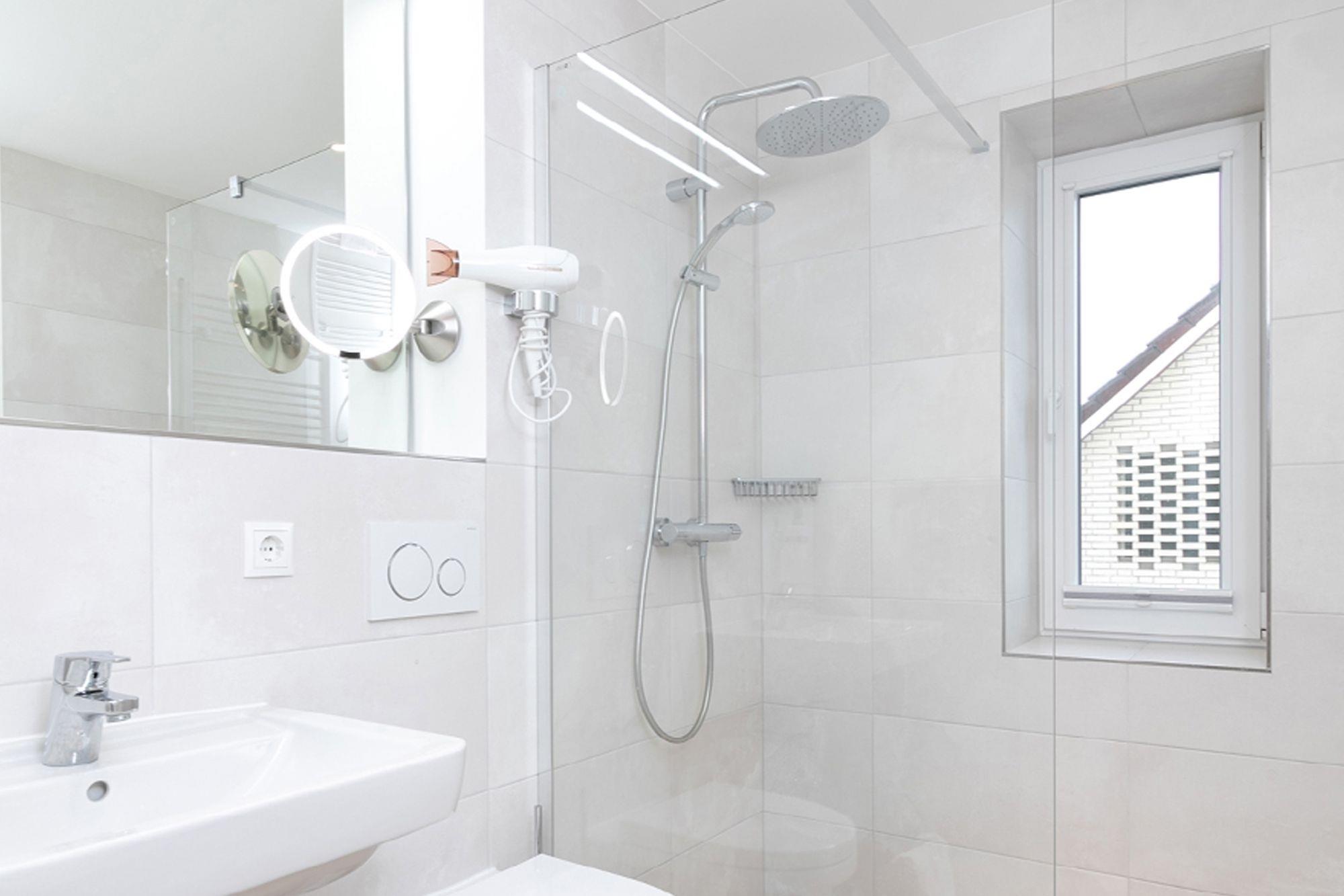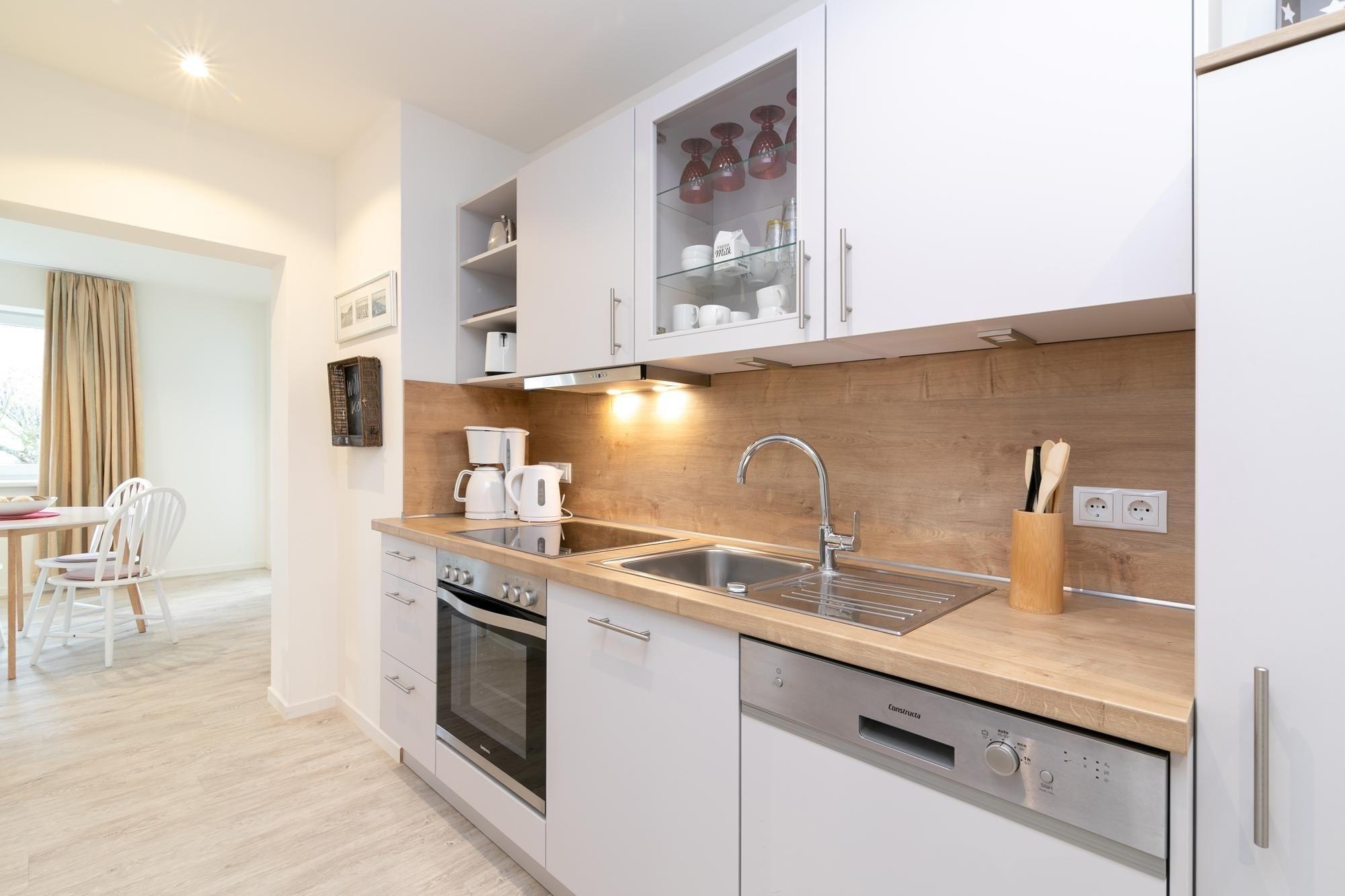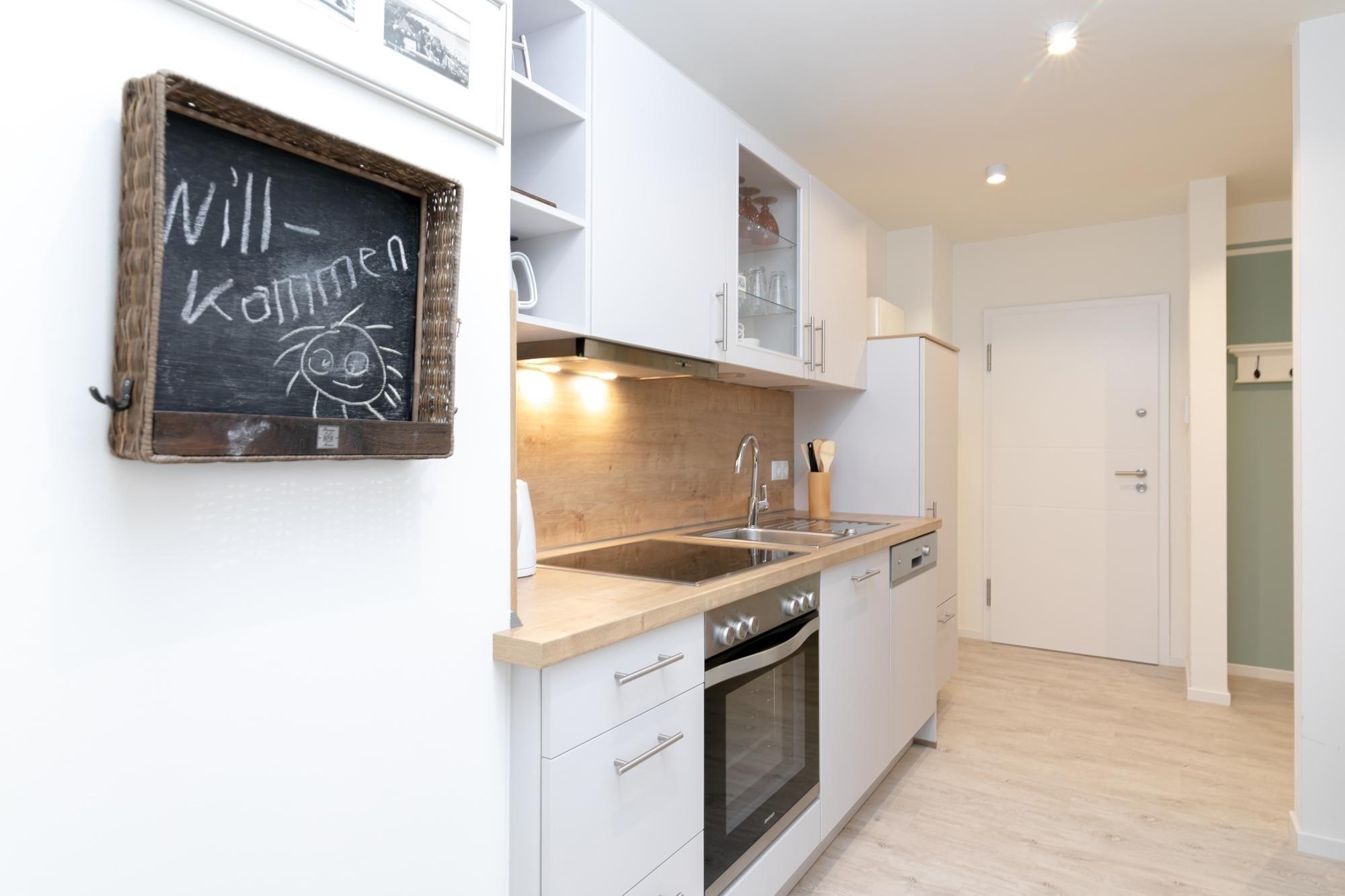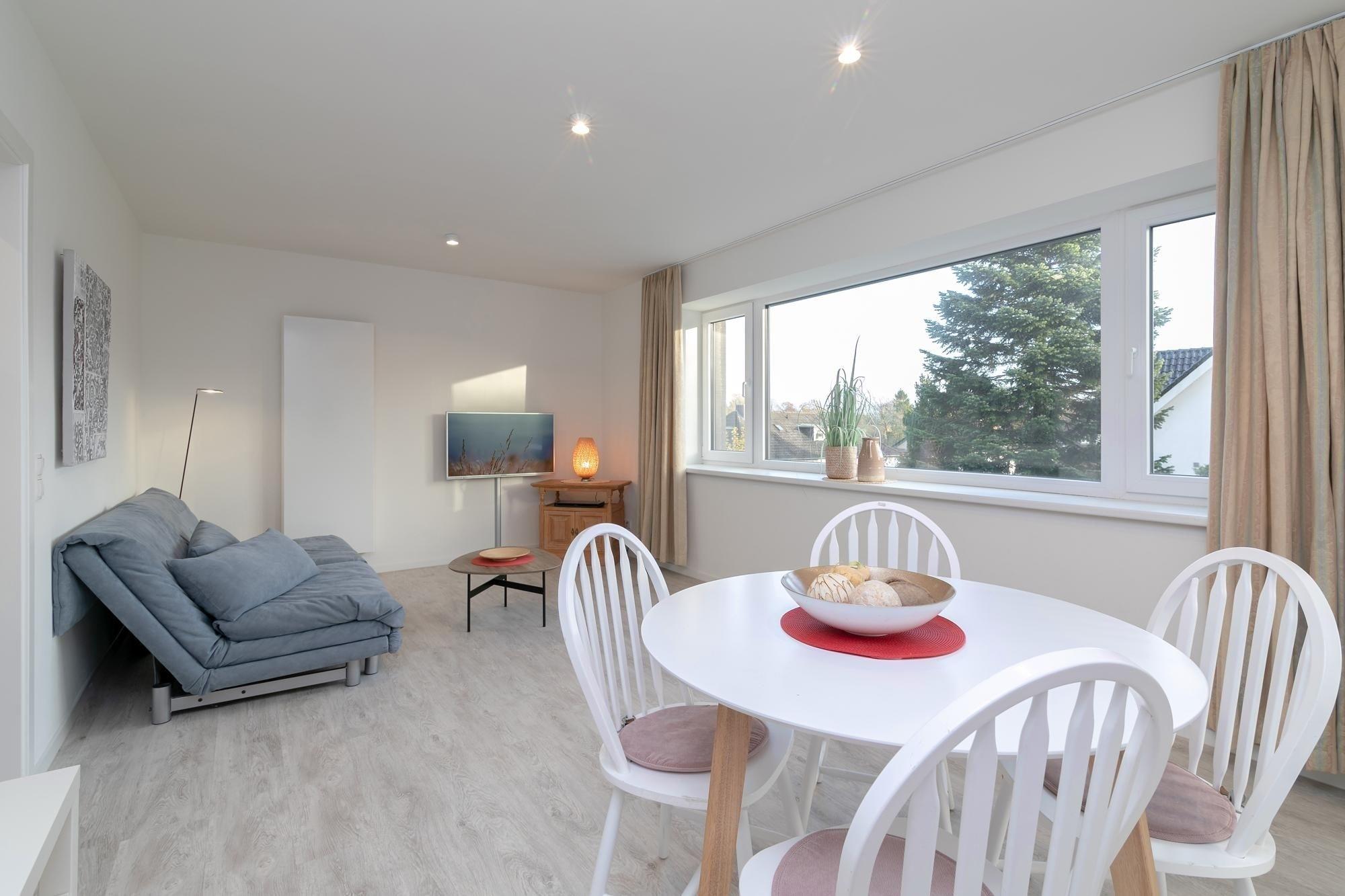 Machen Sie es sich im gemütlichen Wohnbereich mit zwei hochwertigen Schlafsesseln (Liegefläche je 90x200 cm) und Flat-TV bequem. Ein separates Schlafzimmer mit komfortablem Boxspringbett (180x200 cm) und 2. TV lädt zu erholsamen Stunden nach langen Strandtagen ein. Das stilvolle Designbad überzeugt mit Annehmlichkeiten wie bodentiefer Wellnessdusche, Schminkspiegel und Fußbodenheizung. In der offen gestalteten, gut ausgestatteten Küchenzeile mit hochwertigen Alltagshelfern wie Backofen, Spülmaschine, sowie 4-Platten-Ceranfeld lassen sich im Handumdrehen leckere Ferienmahlzeiten zubereiten. Der lichtdurchflutete und großzügige Essbereich für bis zu 4 Personen hat einem direkten Zugang zum überdachten, möblierten Balkon. Von hier aus öffnet sich der Blick ins Grüne – Ruhe, Entspannung und ein Hauch von Ostsee in der Ferne. Erholung pur!