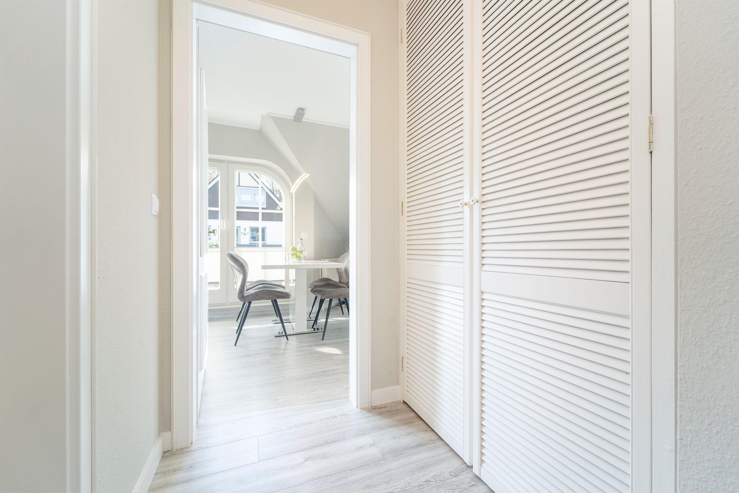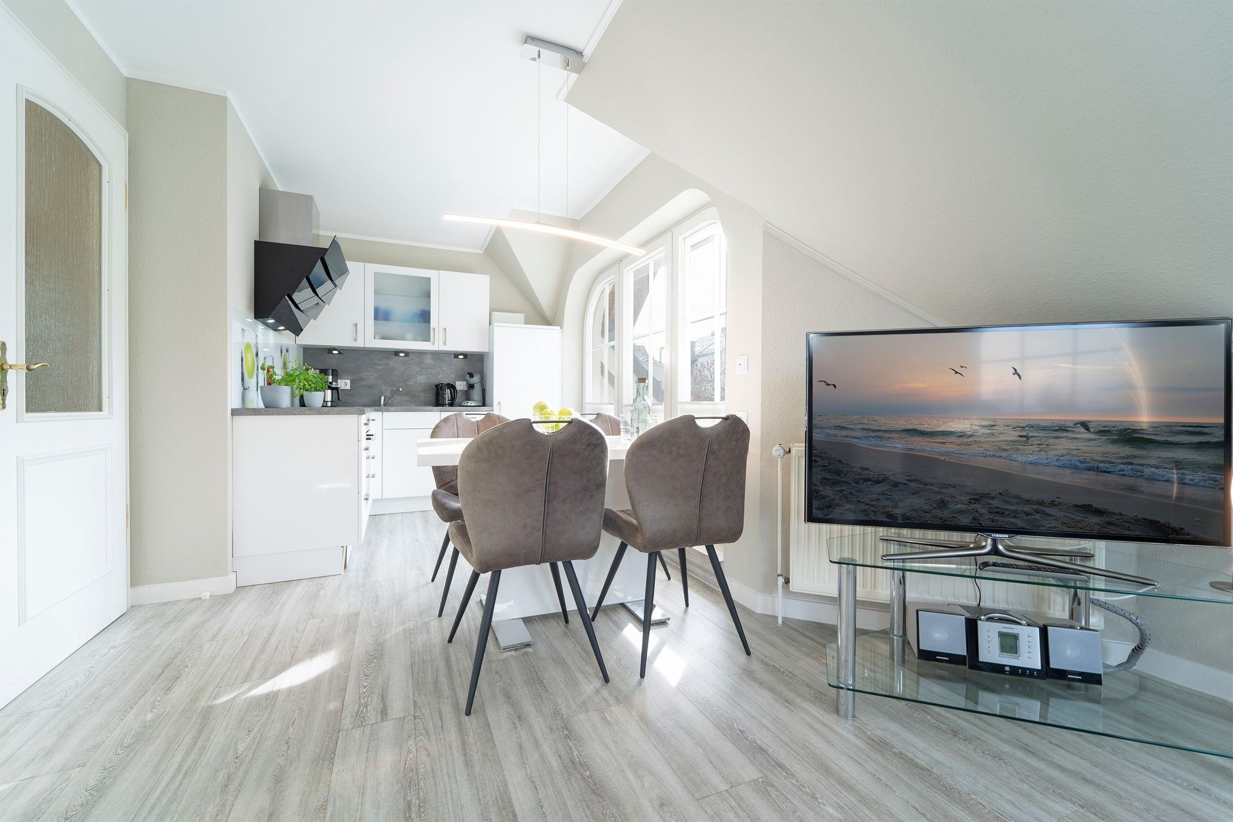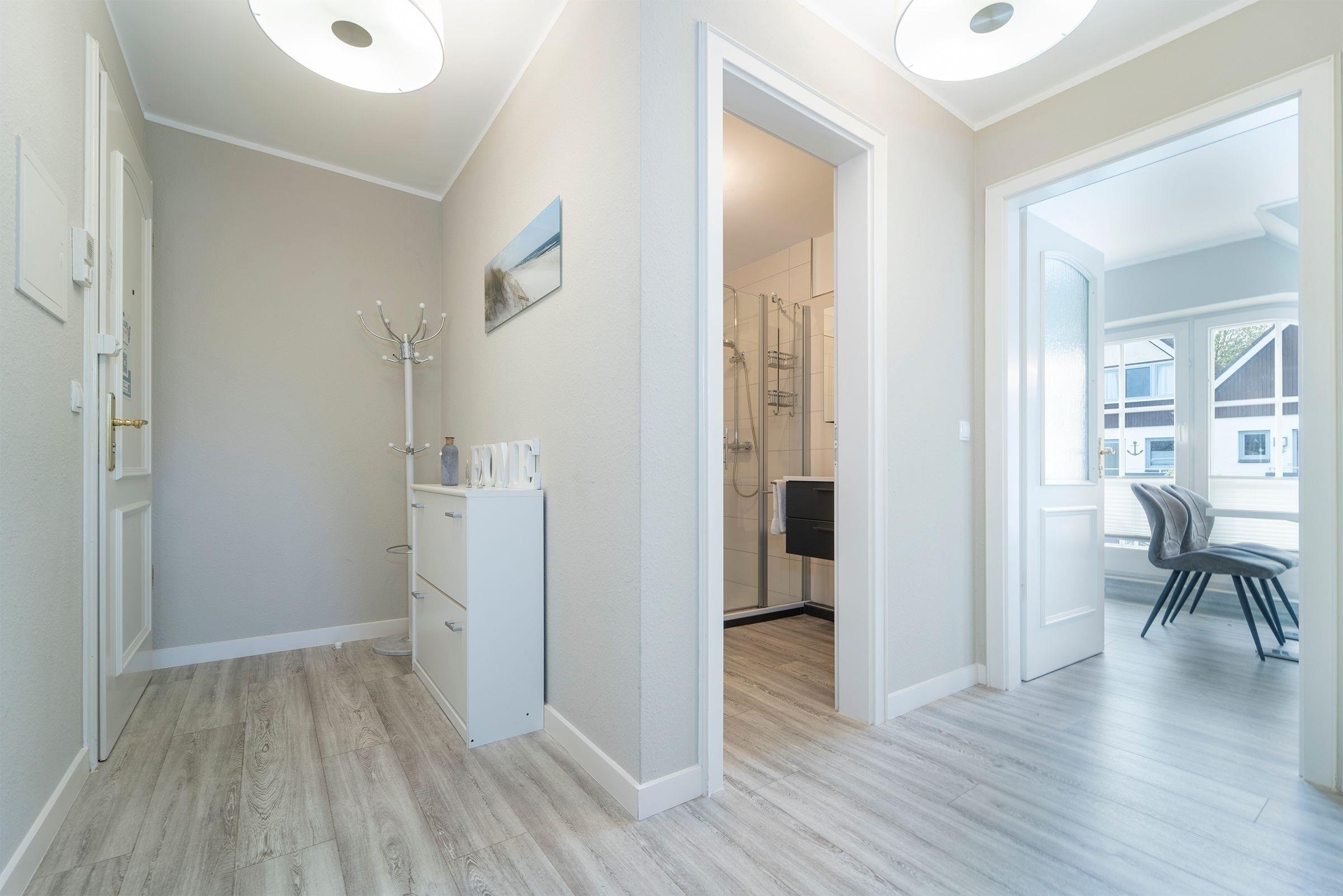 Sie betreten das Treppenhaus Ihres Ferienunterkunft und gelangen über eine großzügige Treppe in die 1. Etage. Treten Sie ein. Vom Flur, der mit einem Schuhschrank, einem Kleiderständer und einem Einbauschrank ausgestattet ist gelangen Sie in alle Zimmer der Wohnung. Das Schlafzimmer wurde mit einem bequemen Boxspringbett mit durchgehender Matratze (180x200 cm) ausgestattet. Die Nachtruhe ist durch Verdunklungsvorhänge gesichert. Ihre Urlaubsgarderobe lässt sich in einem geräumigen Schlafzimmerschrank verstauen. Der Wohn- Essbereich, wurde modern und freundlich gestaltet. Ein hochwertiges Ecksofa mit Schlaffunktion (160x200 cm) lädt nach einem ausgiebigen Strandtag zum Entspannen ein. In der offenen Küche, die mit Geschirrspüler, Backofen, Kaffeemaschine, sowie zusätzlich mit einer Kaffeepad-Maschine, Wasserkocher, Eierkocher und Toaster ausgestattet ist lassen sich leckere Urlaubsmenüs zubereiten. Genießen Sie den ersten Kaffee am Morgen auf dem Balkon oder tanken Sie nachmittags ausgiebig Sonne auf Ihrem Süd-West Balkon mit Markise. Das funktionell eingerichtete Duschbad mit Regendusche, Spiegelschrank Handtuchheizung und Fön rundet das Gesamtbild dieses komfortablen Feriendomizils ab.