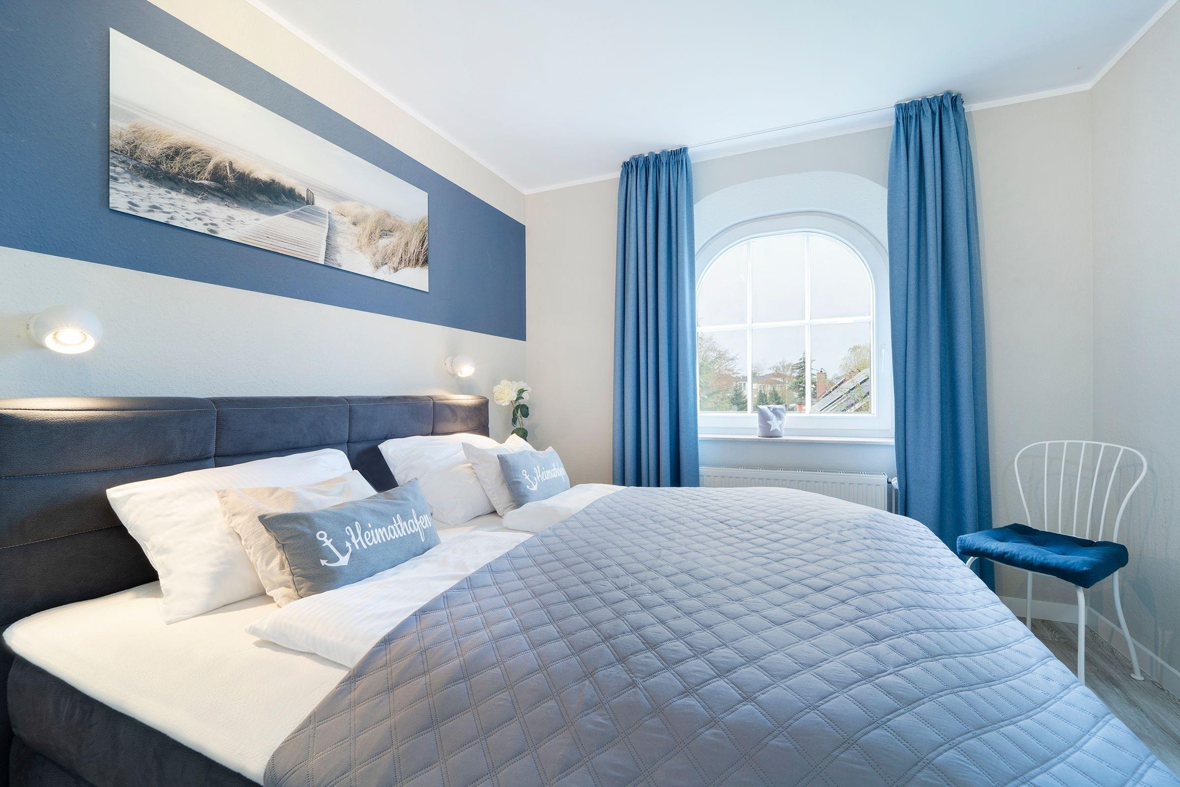 Schlafzimmer: 1 Boxspring-Doppelbett (180x200 cm, durchgehende Matratze), Kleiderschrank, Verdunkelung (Vorhänge)