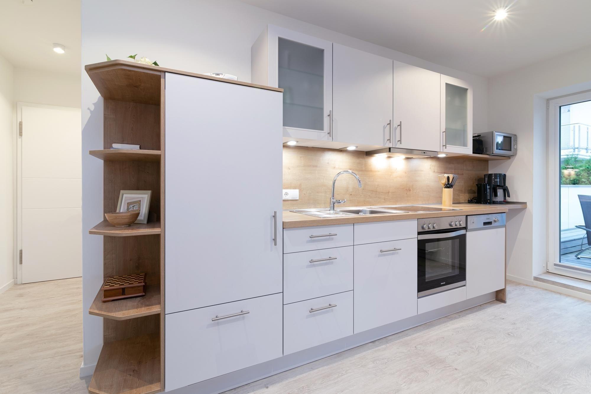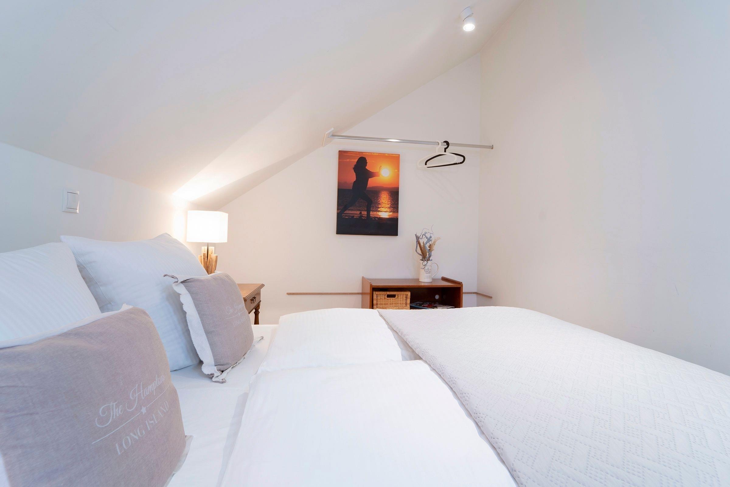 Ihr kuscheliger Couchbereich lässt Sie gemütliche Abende mit Ihren Lieben verbringen, für Unterhaltung sorgt der moderne Flat-TV. Auf der komfortablen Boxspringcouch (Liegefläche 160x200 cm) können bis zu 2 Personen wunderbar schlafen. Im Schlafzimmer empfängt Sie ein bequemes Doppelbett (2x 90x200 cm), hier ist für Ruhe und Erholung gesorgt. Das stilvolle Designbad überzeugt mit Annehmlichkeiten wie bodentiefer Wellnessdusche, Schminkspiegel und Fußbodenheizung. Der schöne Essbereich für 4 Personen ist ideal für gesellige Frühstücksrunden oder Ihr Candle-Light Dinner. Der Essbereich ist gemütlich im Erker platziert, liegt direkt am Fenster und bietet somit einen wunderbaren Panoramablick über die Dächer von Scharbeutz. Die moderne, offene Küche lässt Herzen auch ambitionierter Hobbyköche höherschlagen, hier sind Annehmlichkeiten wie Geschirrspüler, Backofen und Nespresso-Kapselmaschine selbstverständlich. Von der Küche aus geht es auf den ersten von zwei Balkonen, dieser Patio-ähnliche, geschützte Balkon im Lounge-Stil möbliert, erstreckt sich großzügig und ruhig zur Rückseite des Hauses. Nach vorne gelegen und vom Wohn- oder Essbereich begehbar empfängt Sie zusätzlich ein weiterer überdachter Balkon. In diesem Domizil gibt es also reichliche Möglichkeiten Ihre zauberhaft luxuriösen Urlaubstage morgens al fresco mit dem ersten Kaffee zu beginnen oder mit einen stilvollen Sundowner am Abend ausklingen zu lassen!