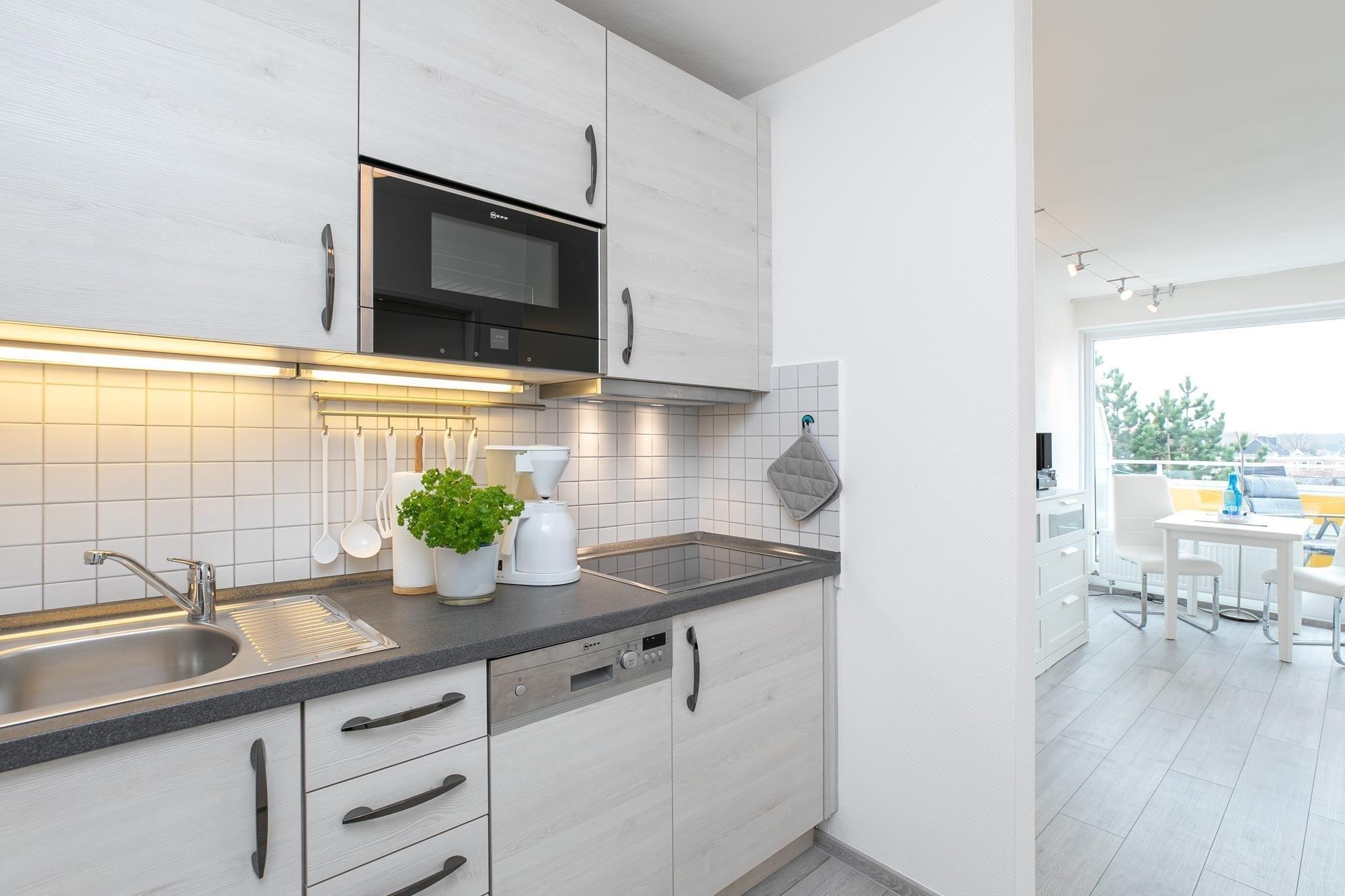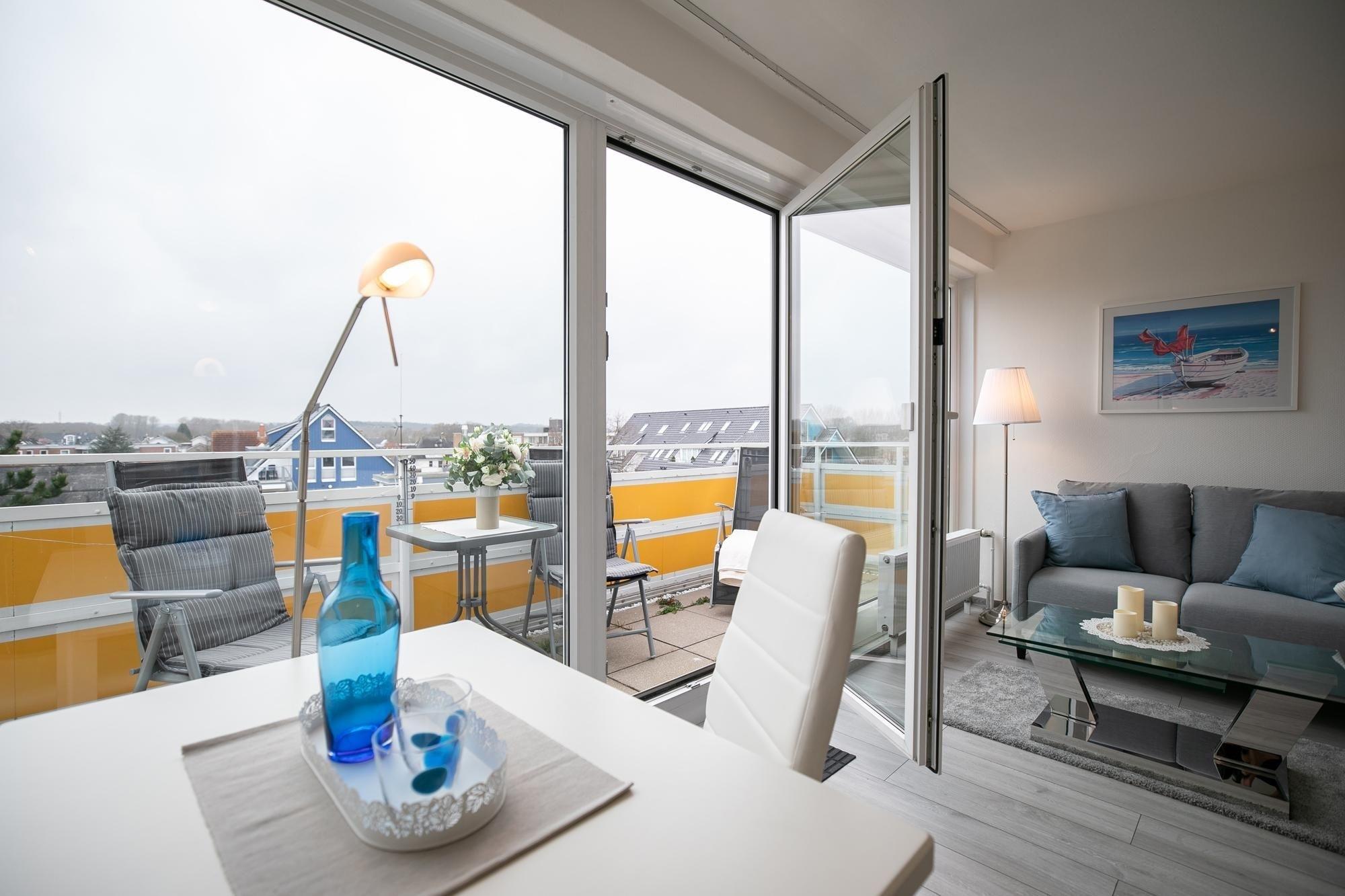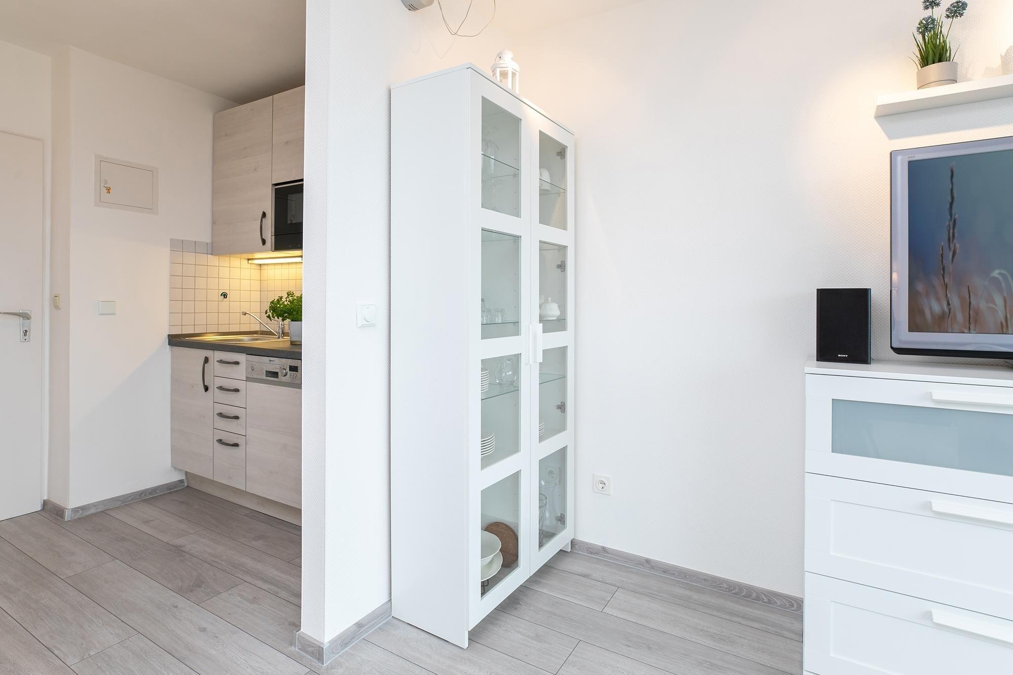 Über einen barrierefreien Zugang von der Strandallee oder über die Tiefgarage gelangen Sie mit dem Fahrstuhl in ihr Feriendomizil (ca. 37 qm). Beim Eintreten in die Wohnung befindet sich links die auf kleinstem Raum hochwertig ausgestattete Küchenzeile mit Geschirrspülmaschine und Mikrowelle. Das funktionell ausgestattete Duschbad mit WC erreicht man durch eine Tür Vis a Vis der Küchenzeile. Das helle moderne Einraum-Appartement ist mit einem gemütlichen Sofa, einem Esstisch für 2 Personen und einem schönen Doppelbett (160x200 cm) ausgestattet. Ein Flachbildfernseher und eine HiFi Anlage gehören ebenfalls zum Inventar. Lassen Sie den Tag in der Abendsonne bei einem Glas Wein, mit einem Buch oder mit einem Gesellschaftsspiel auf dem Balkon ausklingen. Eine kleine Bibliothek und verschiedene Gesellschaftsspiele sind in dem behaglichen Appartement vorhanden.
