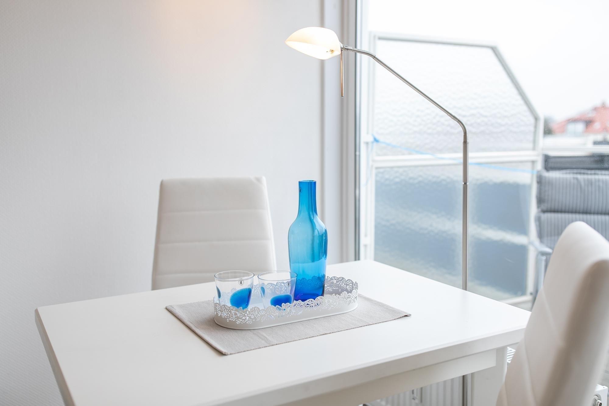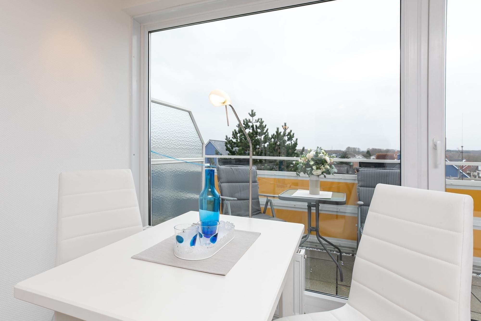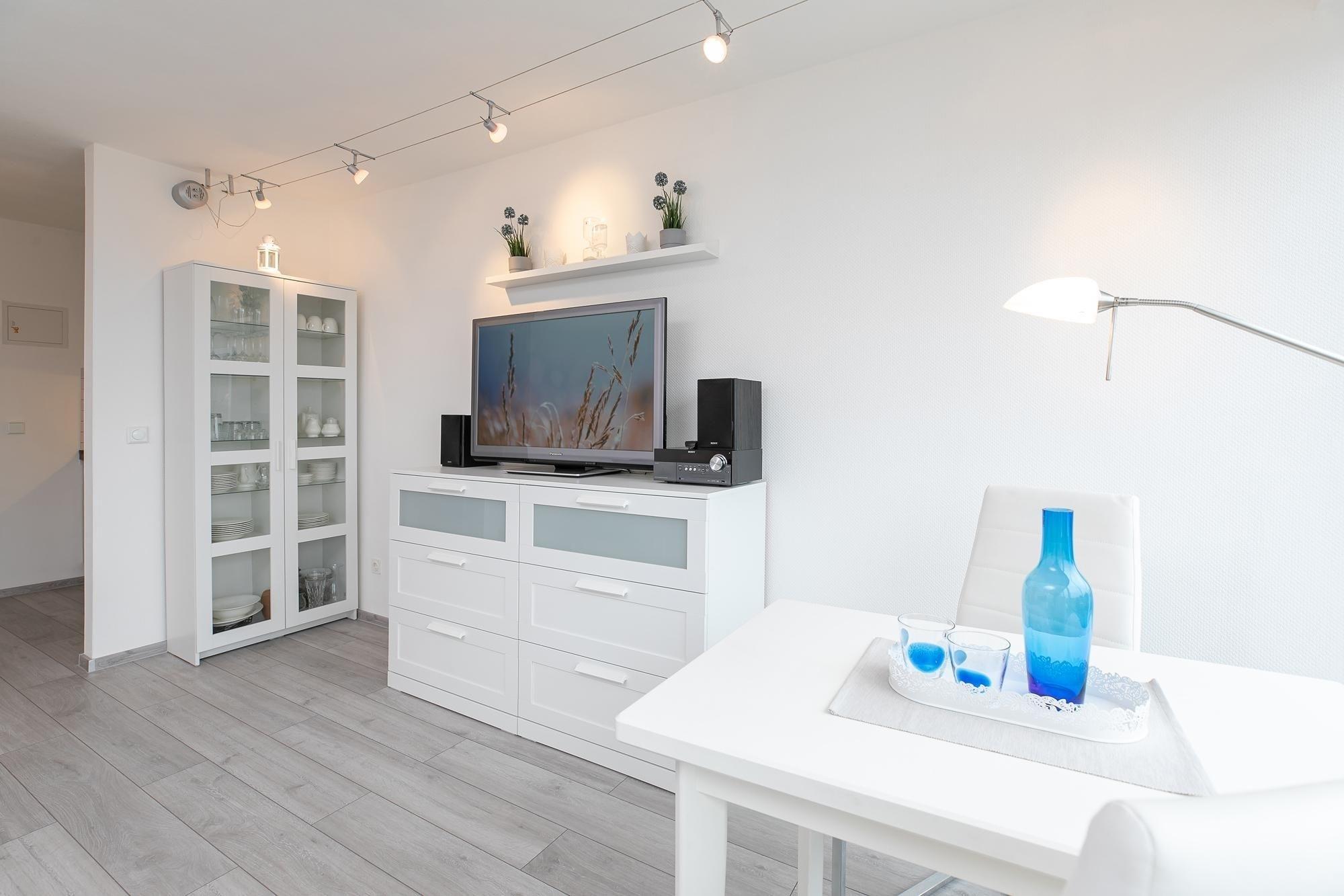 Über einen barrierefreien Zugang von der Strandallee oder über die Tiefgarage gelangen Sie mit dem Fahrstuhl in ihr Feriendomizil (ca. 37 qm). Beim Eintreten in die Wohnung befindet sich links die auf kleinstem Raum hochwertig ausgestattete Küchenzeile mit Geschirrspülmaschine und Mikrowelle. Das funktionell ausgestattete Duschbad mit WC erreicht man durch eine Tür Vis a Vis der Küchenzeile. Das helle moderne Einraum-Appartement ist mit einem gemütlichen Sofa, einem Esstisch für 2 Personen und einem schönen Doppelbett (160x200 cm) ausgestattet. Ein Flachbildfernseher und eine HiFi Anlage gehören ebenfalls zum Inventar. Lassen Sie den Tag in der Abendsonne bei einem Glas Wein, mit einem Buch oder mit einem Gesellschaftsspiel auf dem Balkon ausklingen. Eine kleine Bibliothek und verschiedene Gesellschaftsspiele sind in dem behaglichen Appartement vorhanden.