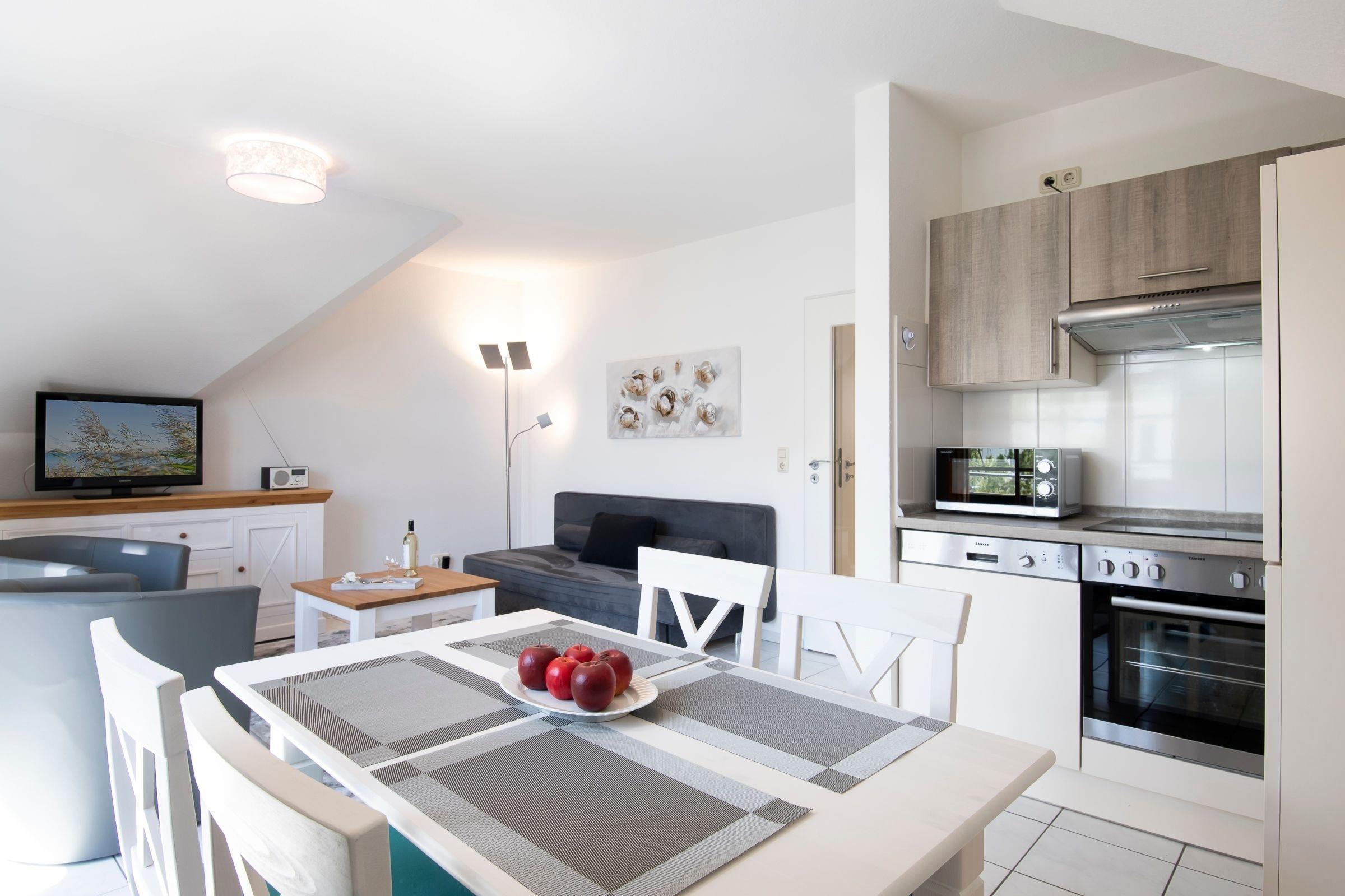 Auf 2 Zimmer verteilen sich hier das Schlafzimmer mit einem Doppelbett und das helle Wohnzimmer im Landhausstil mit gemütlicher Schlafcouch, angrenzender offener Küche und Essbereich. Für Unterhaltung sorgen ein TV und ein CD-Player. Vom Wohnzimmer haben Sie Zugang zum möblierten Balkon mit Süd-Ausrichtung. Starten Sie hier doch direkt Ihren Tag mit frischen Brötchen und heißem Kaffee. Die Küche ist voll ausgestattet mit Backofen, Gefrierfach, Herd, Kaffeemaschine, Kühlschrank, Mikrowelle, Spülmaschine, Toaster und Wasserkocher. Das moderne Bad mit Dusche und Föhn rundet diese Ferienwohnung ab.