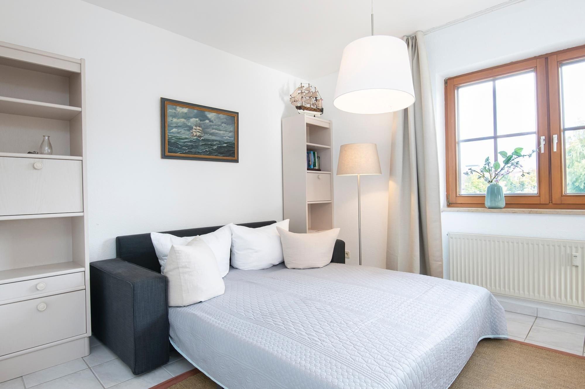 Wohnzimmer: 1 Schlafsofa (160x200 cm), Verdunkelung (Gardinen).