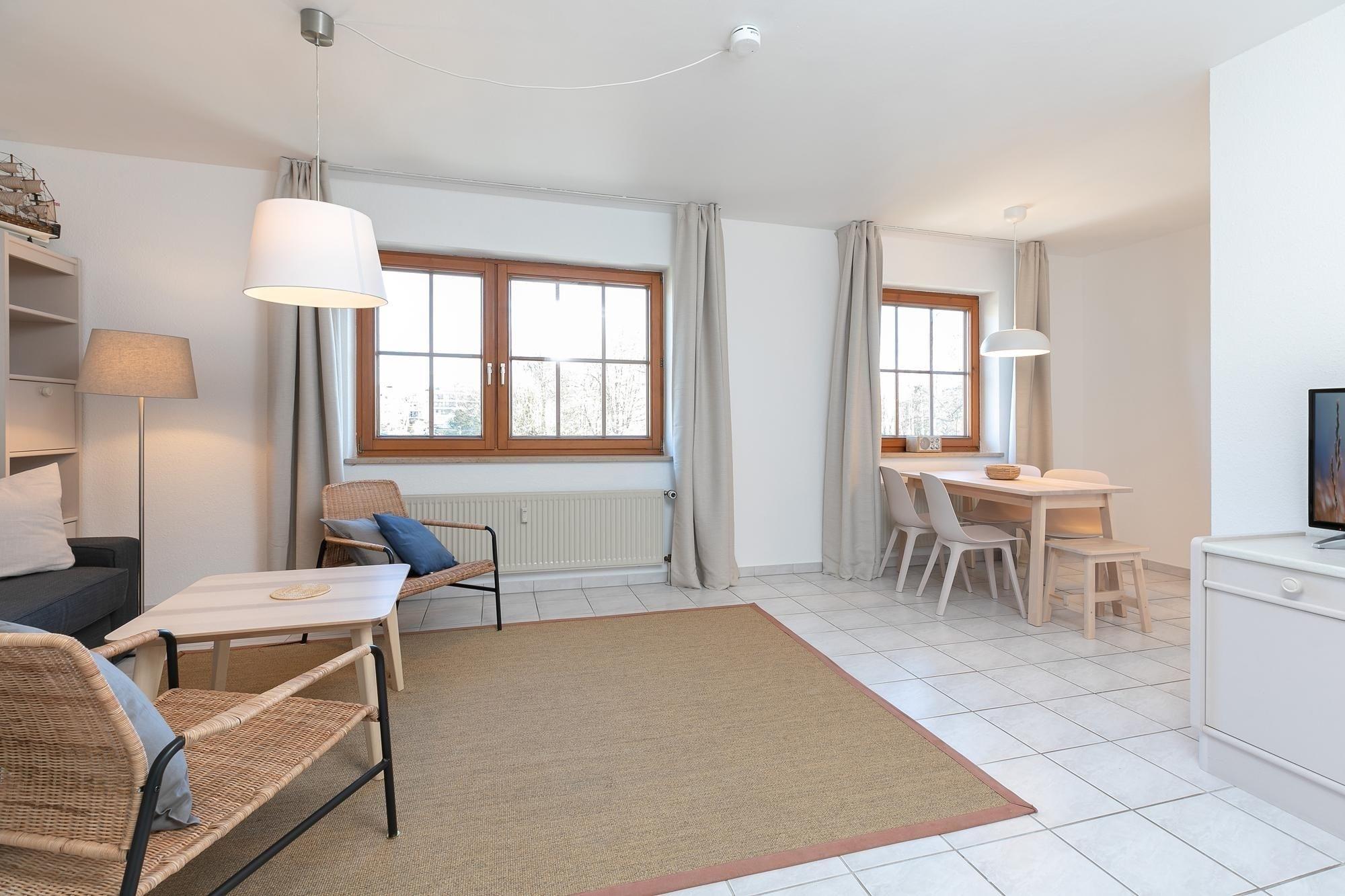 Diese 2-Zimmer-Ferienwohnung in der 1. Etage ist komfortabel ausgestattet und verfügt z. B. über ein Wohnzimmer mit Kabel-TV und Schlafcouch (160x200 cm), einen Essplatz und über eine Küchenzeile mit Mikrowelle, Geschirrspüler und 4-Platten-Herd. Vom möblierten Balkon haben Sie einen traumhaften Blick in den Kurpark. Das Schlafzimmer verfügt über ein Doppelbett (180x200 cm) und einen Radiowecker. Im Duschbad/WC steht Ihnen ein Föhn zur Verfügung. Die gesamte Wohnung ist freundlich und weiß gefliest. Der WLAN-Anschluss ist für Sie inklusive.